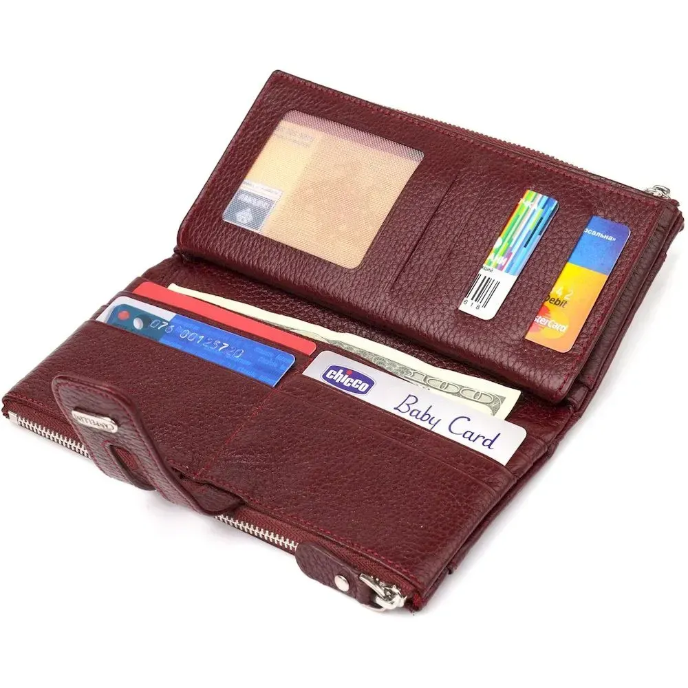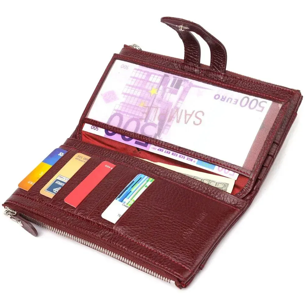Модний жіночий гаманець з натуральної зернистої шкіри. Аксесуар має два широкі основні відділення, в які поміщаються купюри всіх номіналів, дві монетниці, двадцять чотири кишені для карток, дві відкриті кишені зовні та одне прозоре віконце для документів. Закривається аксесуар хлястиком на кнопку. Якщо Ви хочете порадувати себе та здивувати близьких, то неодмінно купуйте шкіряні аксесуари в нашому магазині, якість і ціна Вас однозначно порадує.
