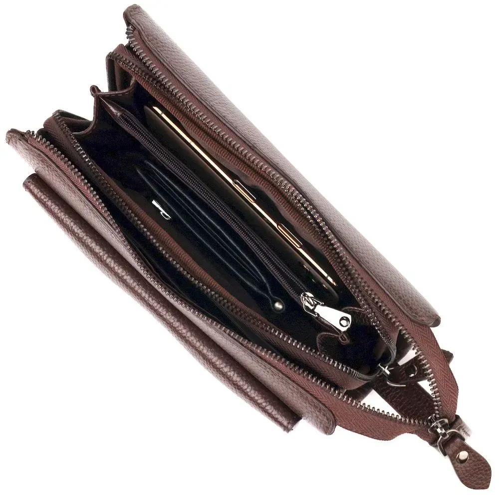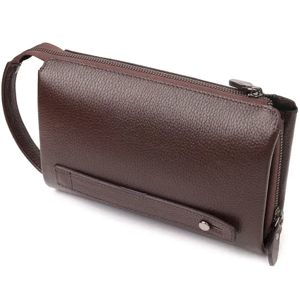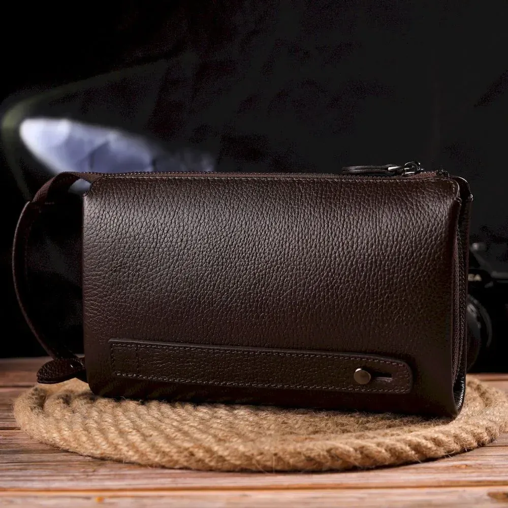Практичний клатч для чоловіків, з натуральної якісної шкіри. Аксесуар має одне основне відділення, всередині якого дві бічні кишені, одна з них на блискавці та кишеня-перегородка на блискавці. Зовні у виробі розташовані дві кишені на лицьовій та тильній стороні. Внизу аксесуара є ремінець для носіння на руці, що дуже зручно у використанні, також є незнімна ручка. Чим зручний клатч - у нього Ви можете покласти все необхідне і все буде під рукою.
