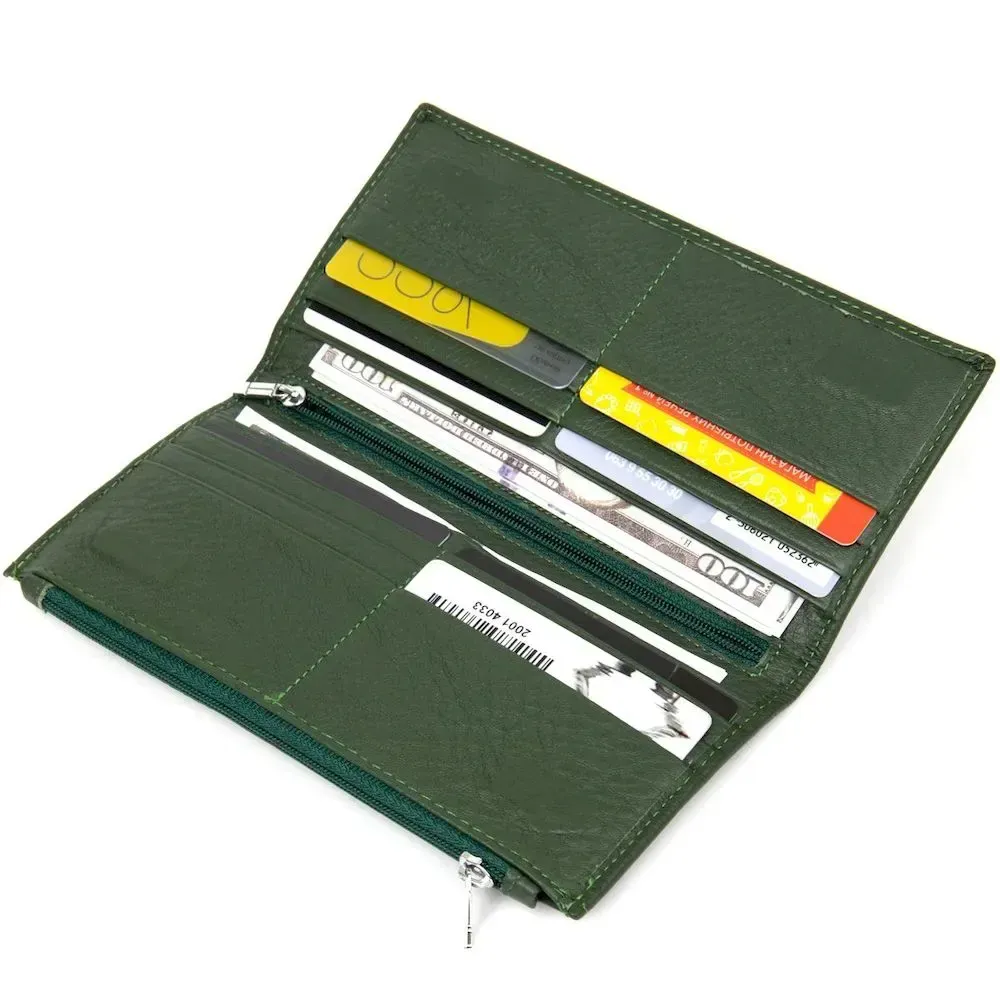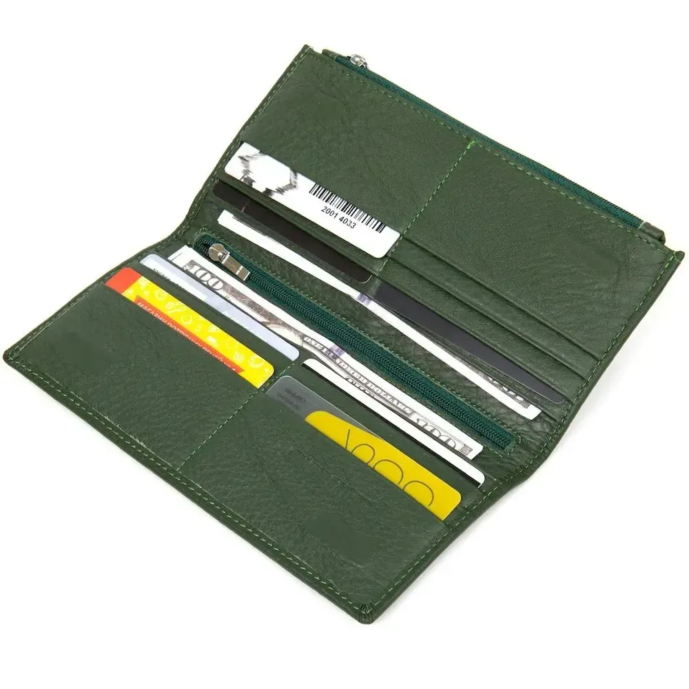Чудовий жіночий гаманець високої якості виконання у незвичайному, але дуже стильному зеленому кольорі. Виконання із натуральної м'якої шкіри, яка має зернисту матову фактуру. Усередині є місткі відділення для купюр та кредитних карток, а також є практична монетниця на блискавці. Цей гаманець стане чудовим придбанням для Вас або подарунком для рідного людини на будь-яке свято.
