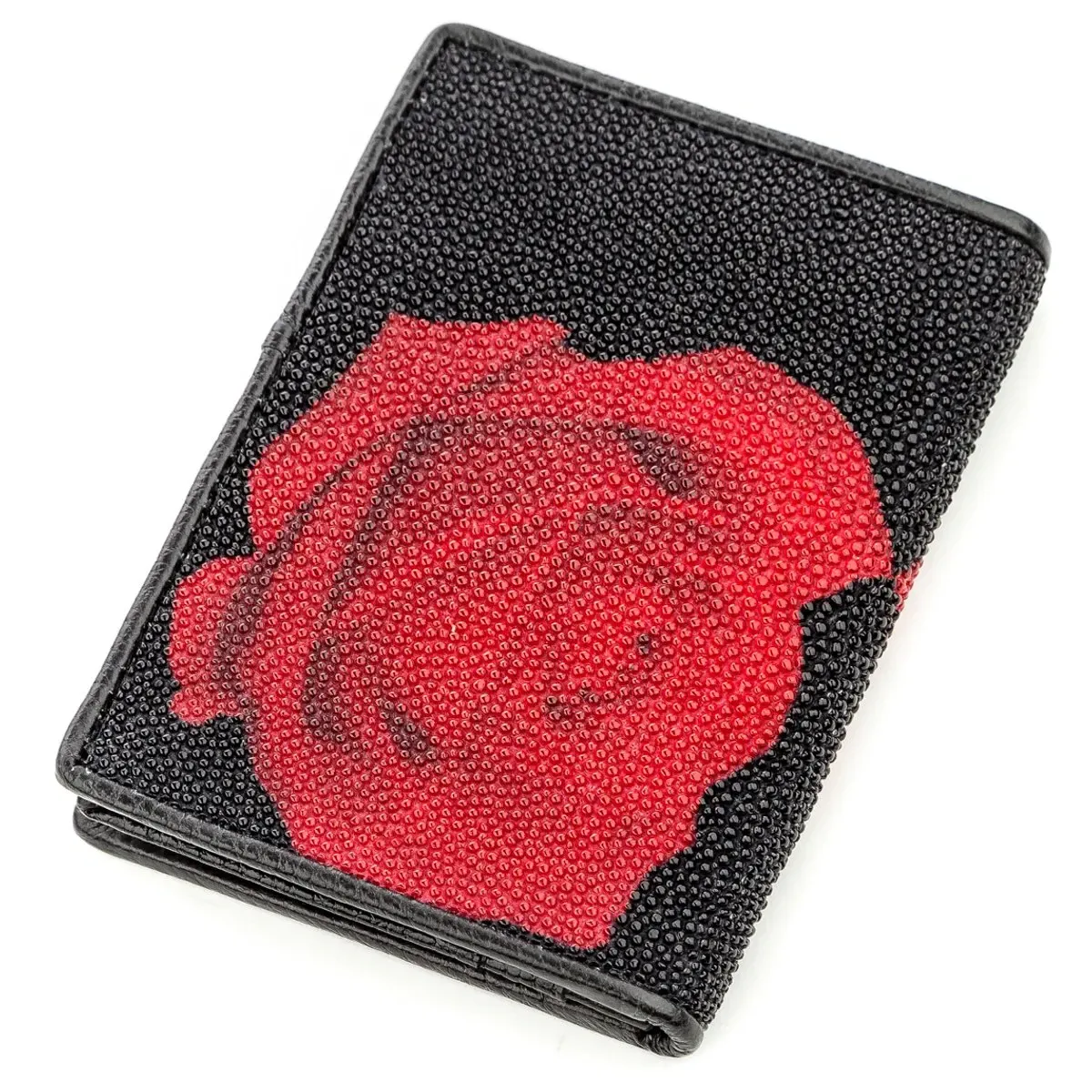 Жіноча візитниця з натуральної шкіри морського ската, дуже стійка до зношування, проколів, порізів, до розривів і навіть до вогню. Мініатюрна модель, легко уміститься в кишеню чи маленьку сумочку. Відмінно доповнить ваш образ та підкреслить ваш смак. На візитниці є ескіз у вигляді троянди червоного кольору, який надає особливість дизайну моделі. Може бути чудовим варіантом для подарунка близькій людині.