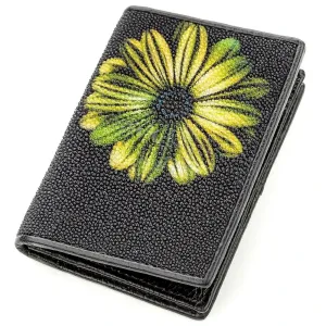 Жіноча візитниця з натуральної шкіри морського ската, дуже стійка до зношування, проколів, порізів, до розривів і навіть до вогню. Мініатюрна модель, легко уміститься в кишеню чи маленьку сумочку. Відмінно доповнить ваш образ та підкреслить ваш смак. На візитниці є ескіз у вигляді квітки жовтого кольору, який надає особливість дизайну моделі. Може бути чудовим варіантом для подарунка близькій людині.
