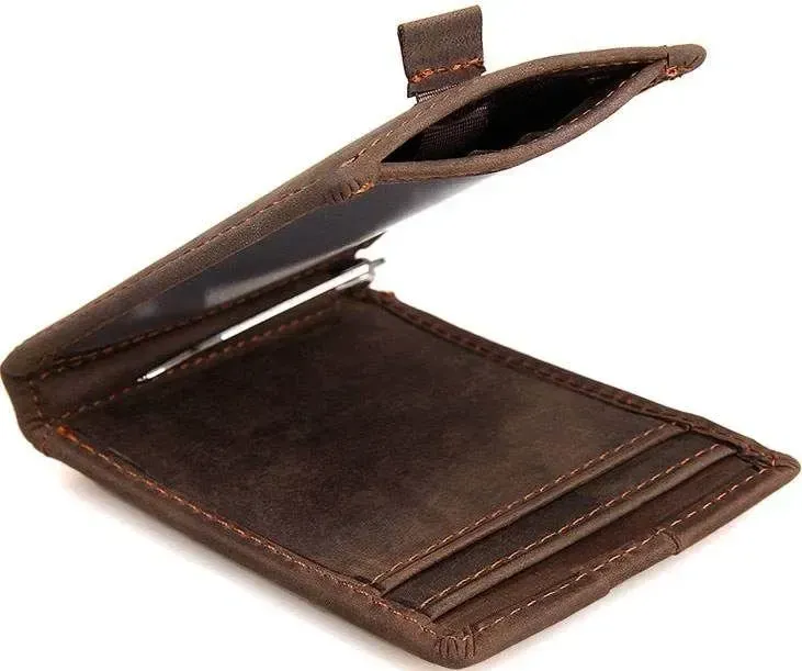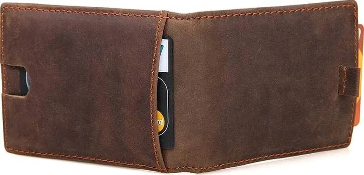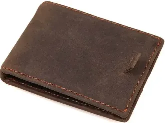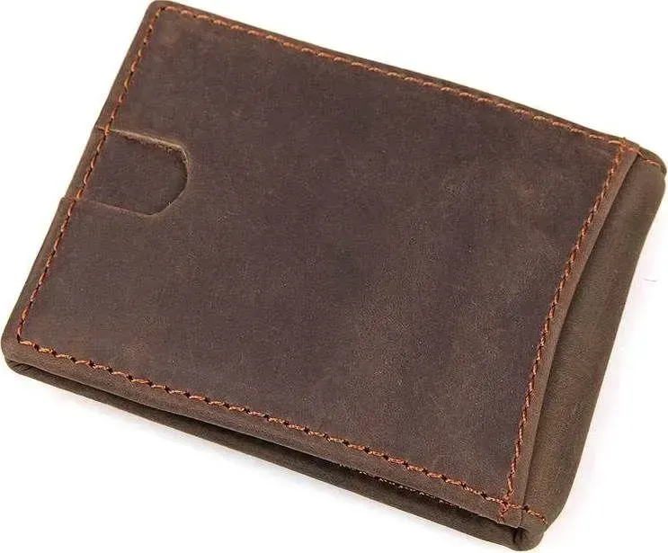 Цікавий затискач для банкнот коричневого кольору. Аксесуар виконаний із високоякісної вінтажної шкіри. Колір фурнітури: срібло. Виріб акуратно прошито коричневою надміцною ниткою. На задній зовнішній стороні аксесуара розташована кишеня для пластикових карток. Виріб упакований в білий чохол. - металевий власник для грошей (відстібається);