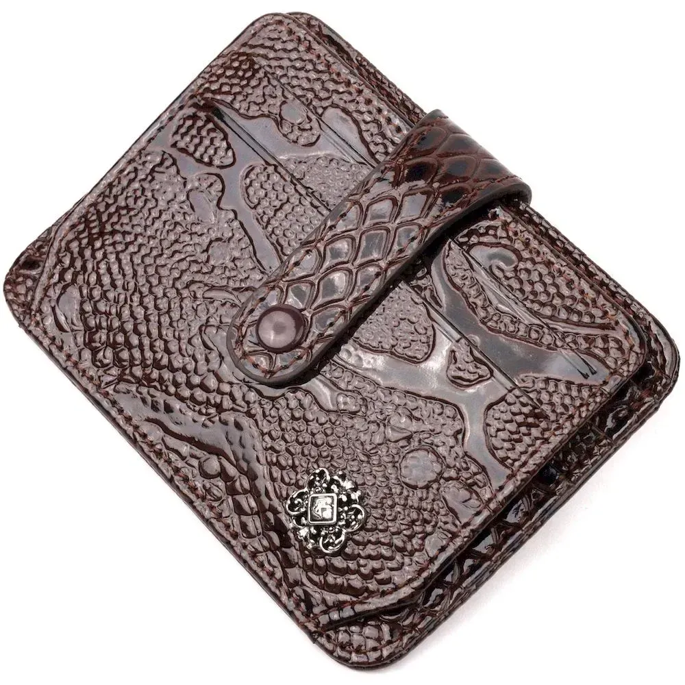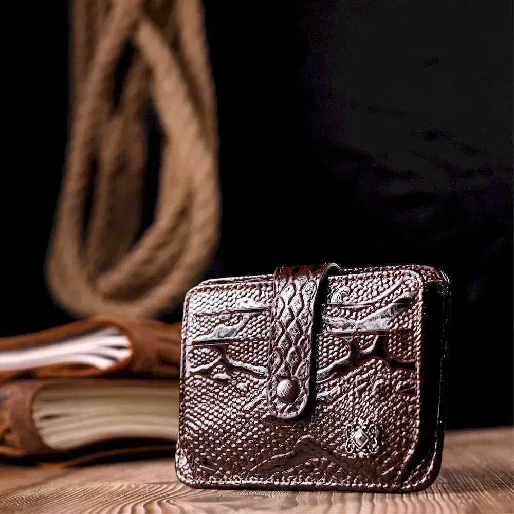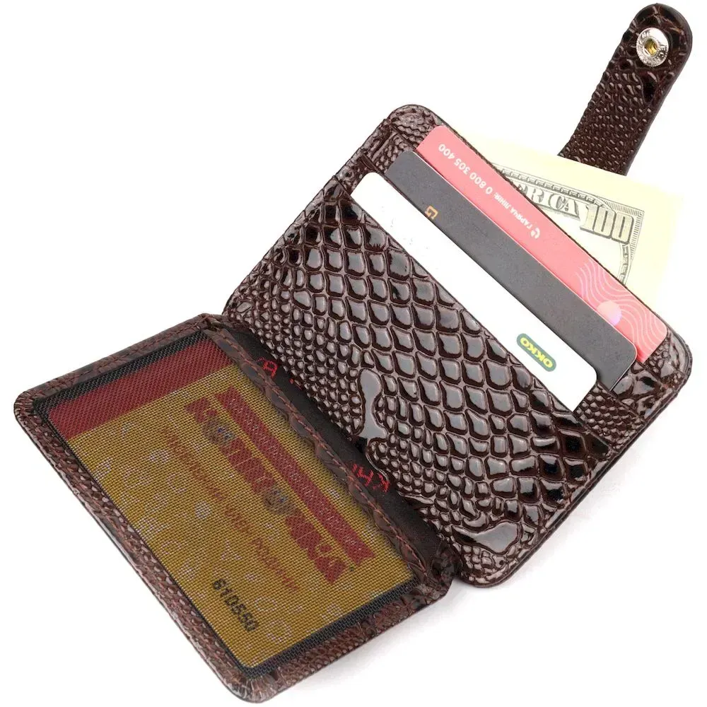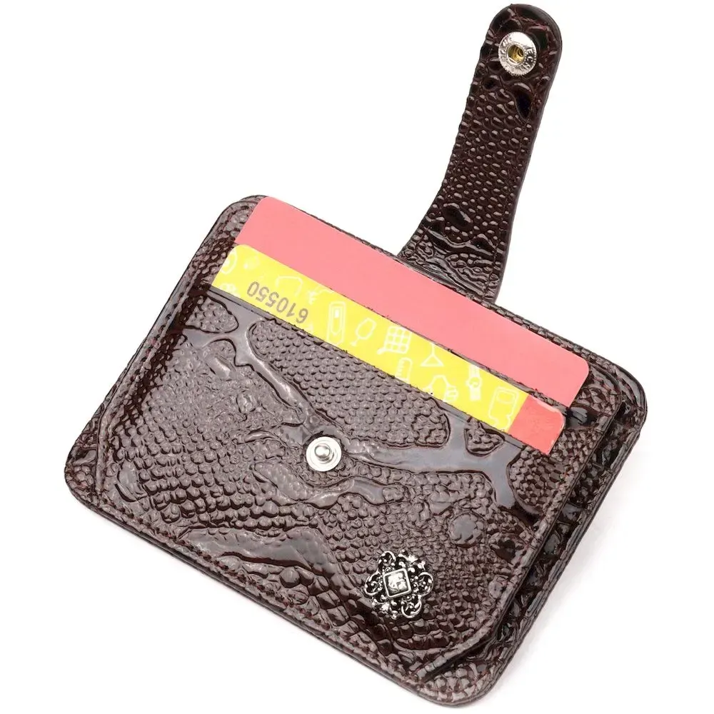 Відмінний картхолдер з лакованої шкіри з тисненням під рептилію. При закритті, розворот фіксується на хлястик з кнопкою. Аксесуар упакований у фірмову коробочку. Вироби з натуральної шкіри завжди будуть чудовим подарунком для близької людини.