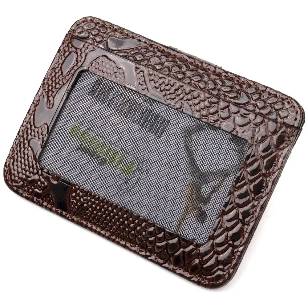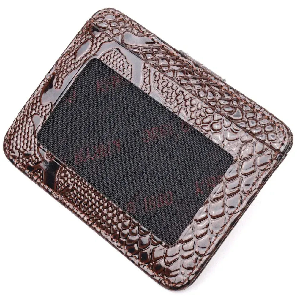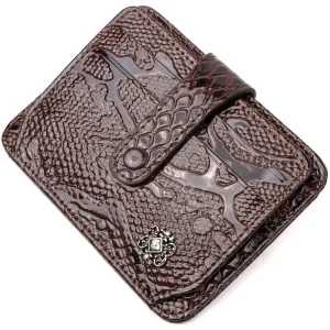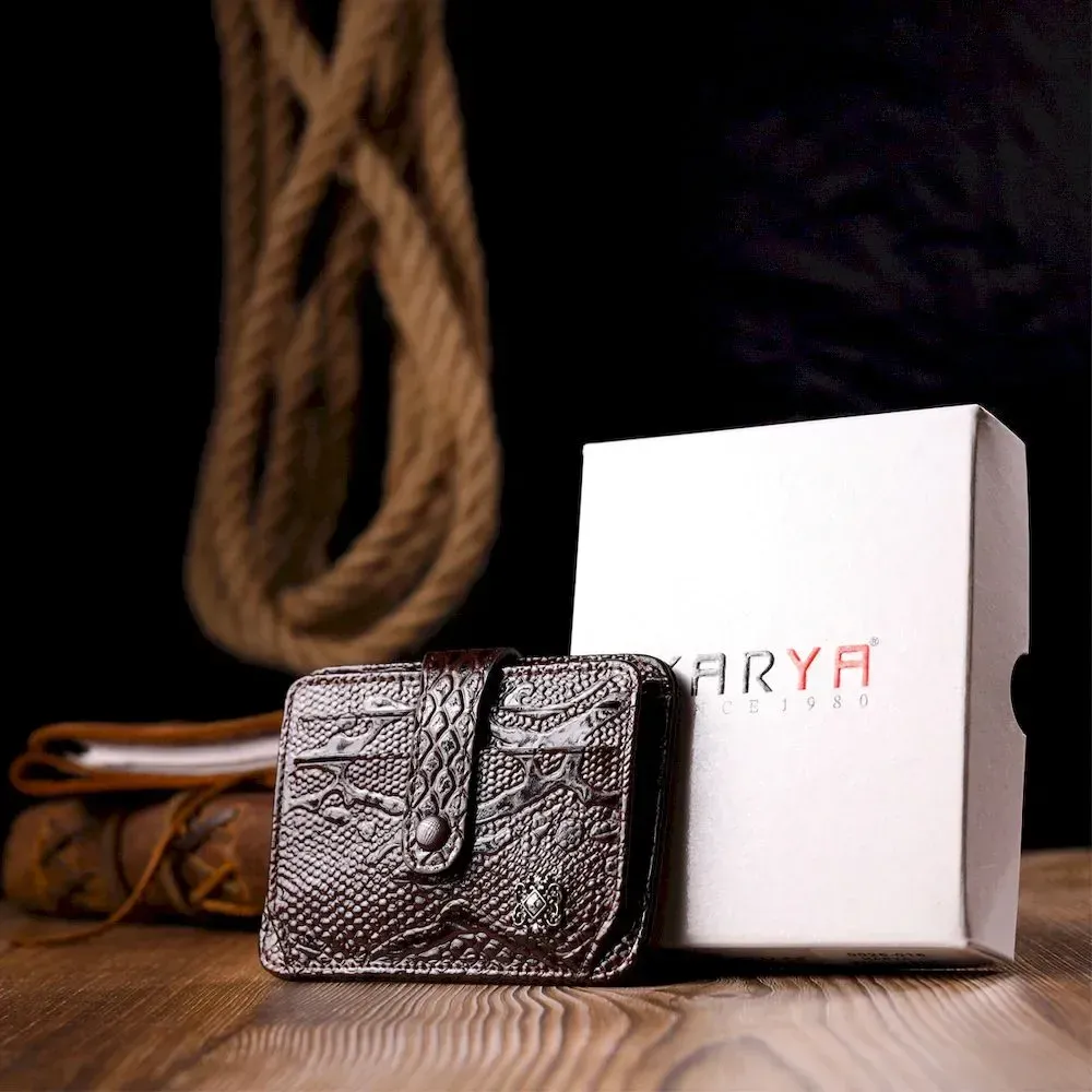 Відмінний картхолдер з лакованої шкіри з тисненням під рептилію. При закритті, розворот фіксується на хлястик з кнопкою. Аксесуар упакований у фірмову коробочку. Вироби з натуральної шкіри завжди будуть чудовим подарунком для близької людини.