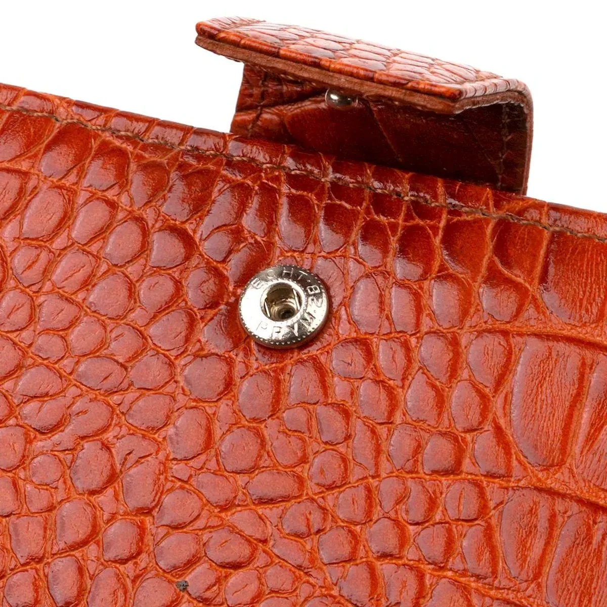 Дуже гарний вертикальний чоловічий гаманець з натуральної фактурної шкіри з тисненням під крокодила. Аксесуар має одне основне відділення, в яке розміщуються купюри всіх номіналів, п'ятнадцять кишень для карток, кишеня під сіточкою для документів, дві прилеглі кишені та монетницю. Закривається аксесуар навпіл шкіряним хлястиком на кнопку. Запакований гаманець картонну коробку.