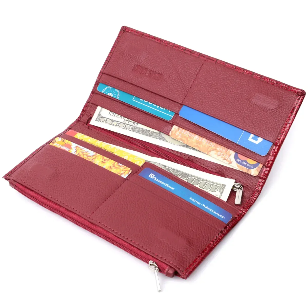 Добротний жіночий гаманець на кожен день з лакованої натуральної шкіри з тисненням під рептилію. Така шкіра має чудові експлуатаційні характеристики. Зовні виріб прикрашений металевим логотипом компанії-виробника, що є гарантією якості. Портмоне доповнено надійною фурнітурою та міцною підкладкою. Укомплектований гаманець у фірмову картонну коробку білого кольору. Такий гаманець стане бажаним подарунком для жінок будь-якого віку та соціального статусу.
