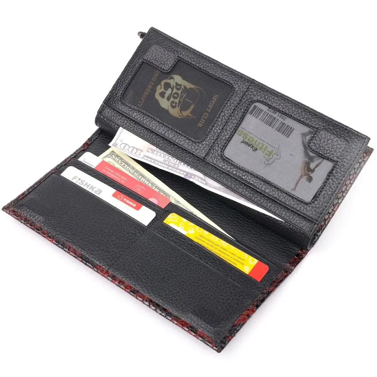 Гарний жіночий гаманець з лакованої натуральної шкіри, тисненням під змію. На лицьовій стороні блок для карток, який прошитий білою ниткою для декору та закривається хлястиком на кнопку. Всередині відділення для карт і документів, що закривається на магніти. Відділення на блискавці для купюр без складання. Запакований аксесуар у фірмову коробку та пакет бренду. Вироби з натуральної шкіри завжди будуть чудовим подарунком для близької людини.