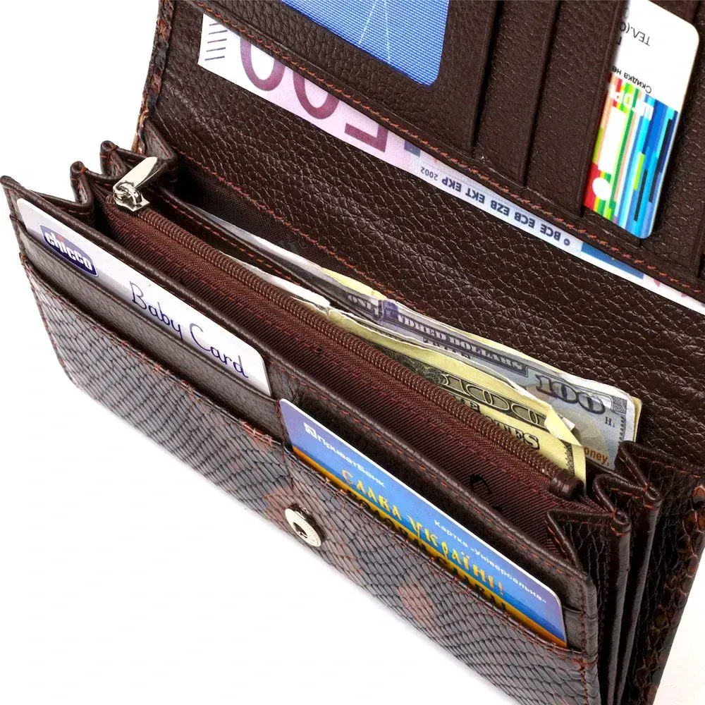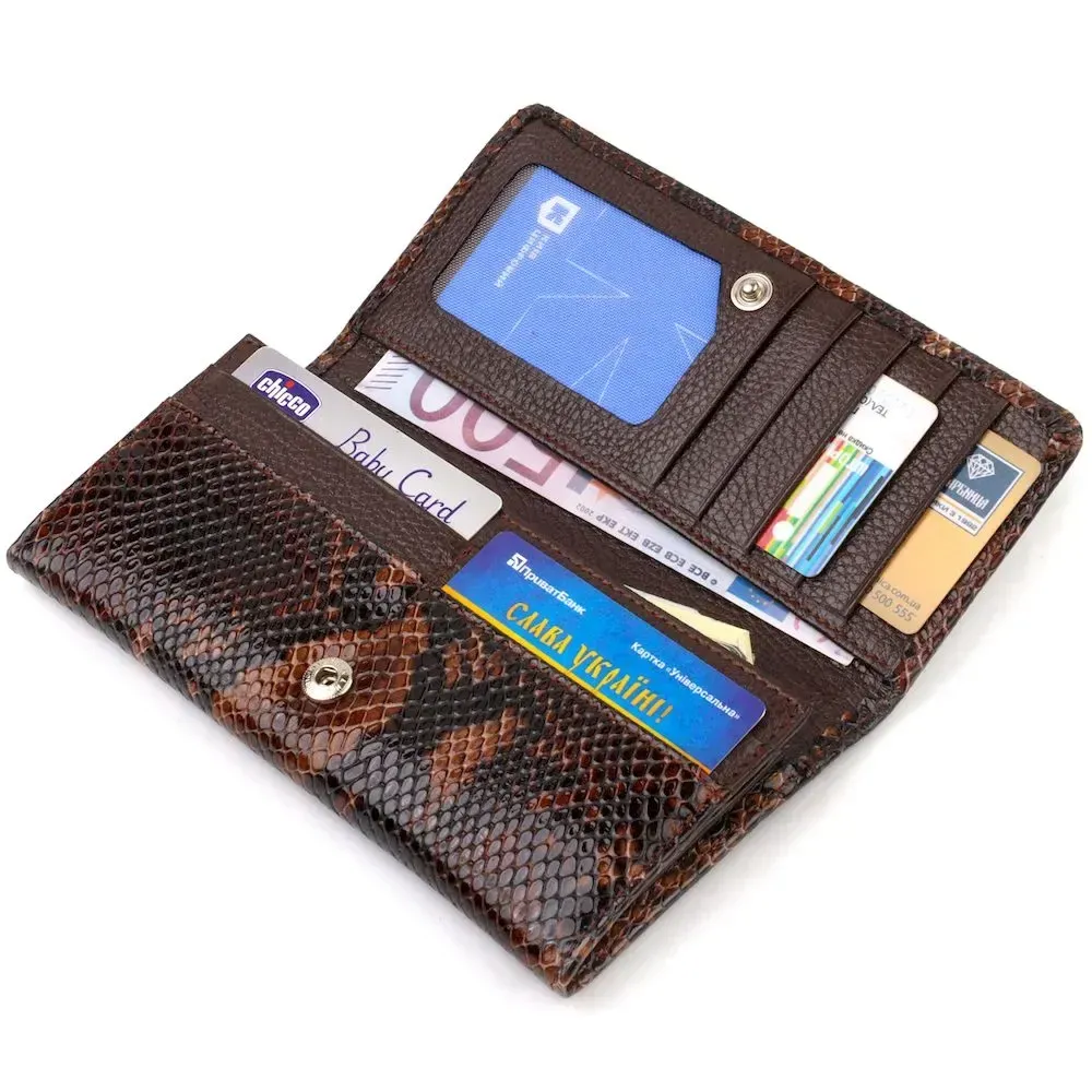 Локований стильний жіночий гаманець, з натуральної шкіри з тисненням під змію. Аксесуар має три основні відділення, в які поміщаються купюри всіх номіналів, дві перегородки, одна з них на блискавці, одинадцять кишень для карток, одна з яких під сіточкою, монетниця на блискавці - зовні та одна прилегла кишеня. Закривається аксесуар клапаном на кнопку. Відмінний аксесуар, надійного виробника, який прослужить дуже довго.