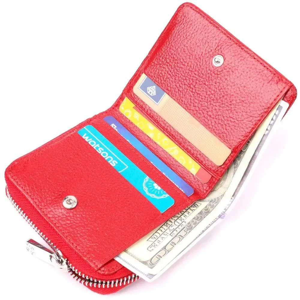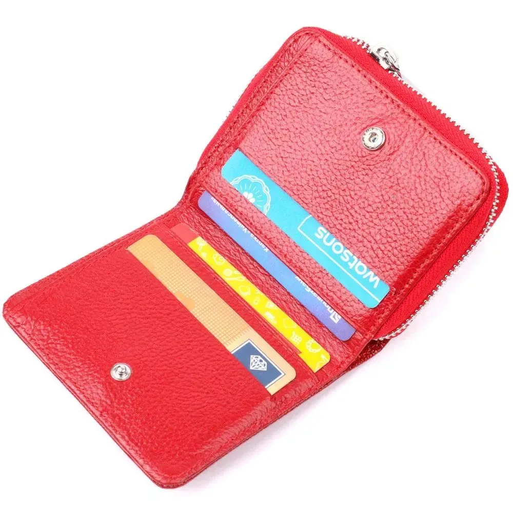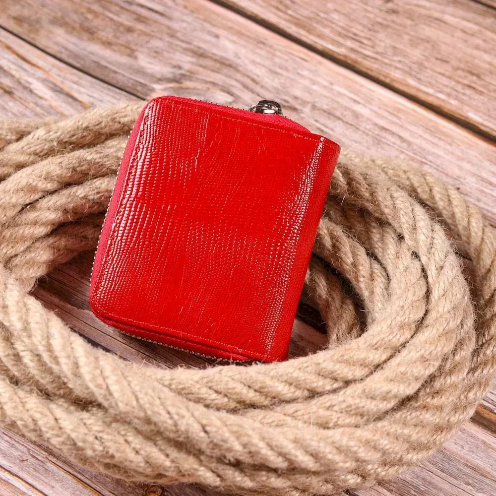 Яскравий лакований жіночий гаманець із натуральної фактурної шкіри в червоному кольорі. Виріб складається з одного місткого відділення для купюр, чотирьох кишень, що прилягають, чотирьох слотів для карт і монетниці на блискавці. Складається аксесуар навпіл, з фіксацією кнопку. Якісна фурнітура доповнює та прикрашає виріб. Такий гаманець з натуральної шкіри - це ідеальний варіант на кожен день для тих, хто цінує якість, зручність та комфорт, а також чудово доповнюватиме Ваш повсякденний образ.