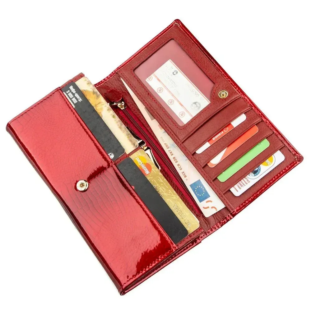 - зовнішнє потаємне відділення на всю довжину; шикарний шкіряний жіночий гаманець з лаковим покриттям. Виготовлений він із натуральної першокласної шкіри з чудовими експлуатаційними характеристиками. Колір гаманця – яскраво червоний, що підкреслює особливе почуття стилю та смак своєї власниці. Наповнення цього аксесуара досить практичне та функціональне з достатньою кількістю різних відділень та кишень. Монетниця закривається на зручну металеву клямку, а сам гаманець на кнопку. Упаковка гаманця представлена у вигляді щільної картонної коробки білого кольору з фірмовим логотипом.