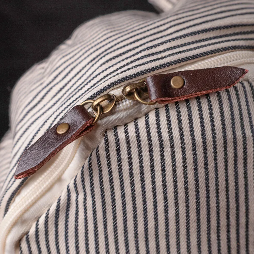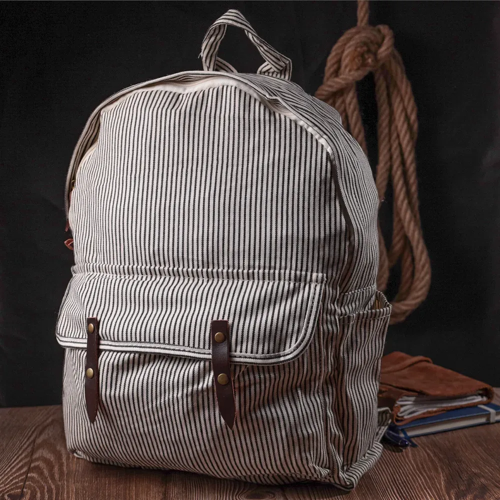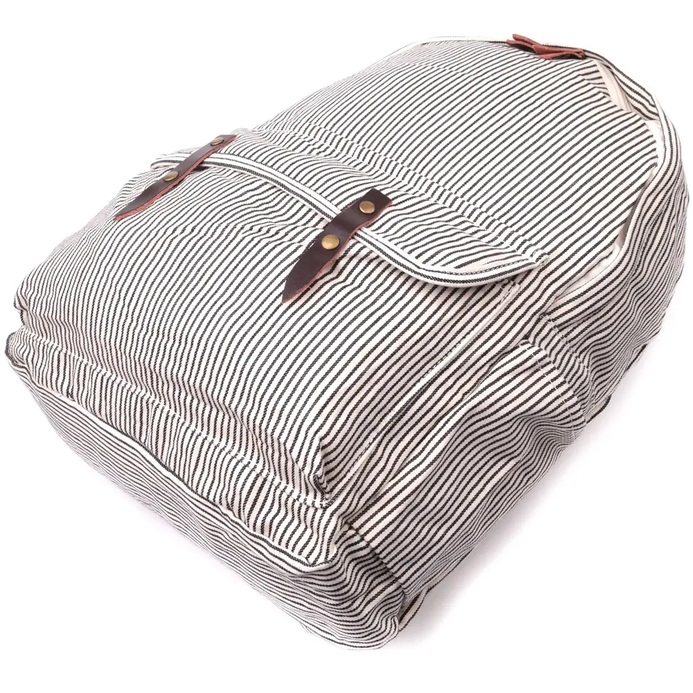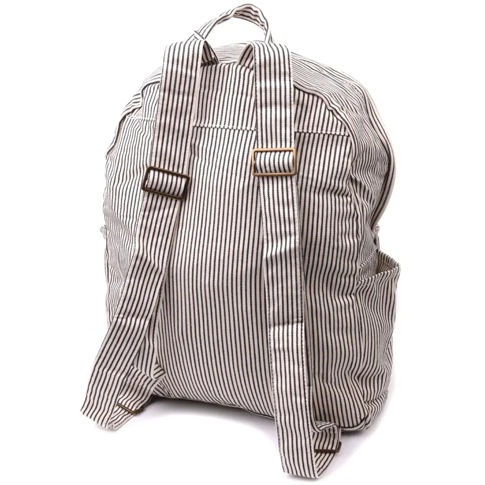 Універсальний рюкзак молочного кольору у чорну вертикальну смужку із якісного текстилю. Рюкзак дуже місткий та має дуже практичний функціонал. Носити виріб можна в руках, для цього передбачена текстильна ручка, а також на спині завдяки текстильним лямкам, що регулюються. Фурнітура яка використана у рюкзаку якісна, прослужить не один рік.