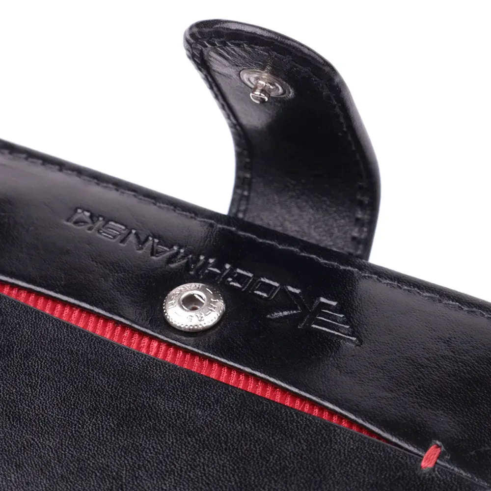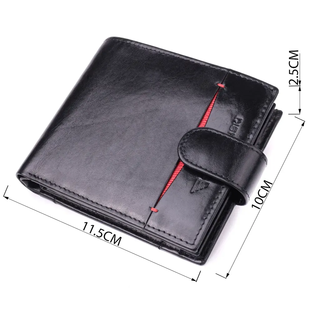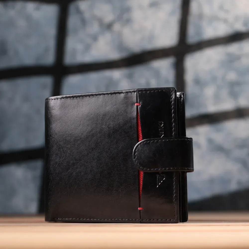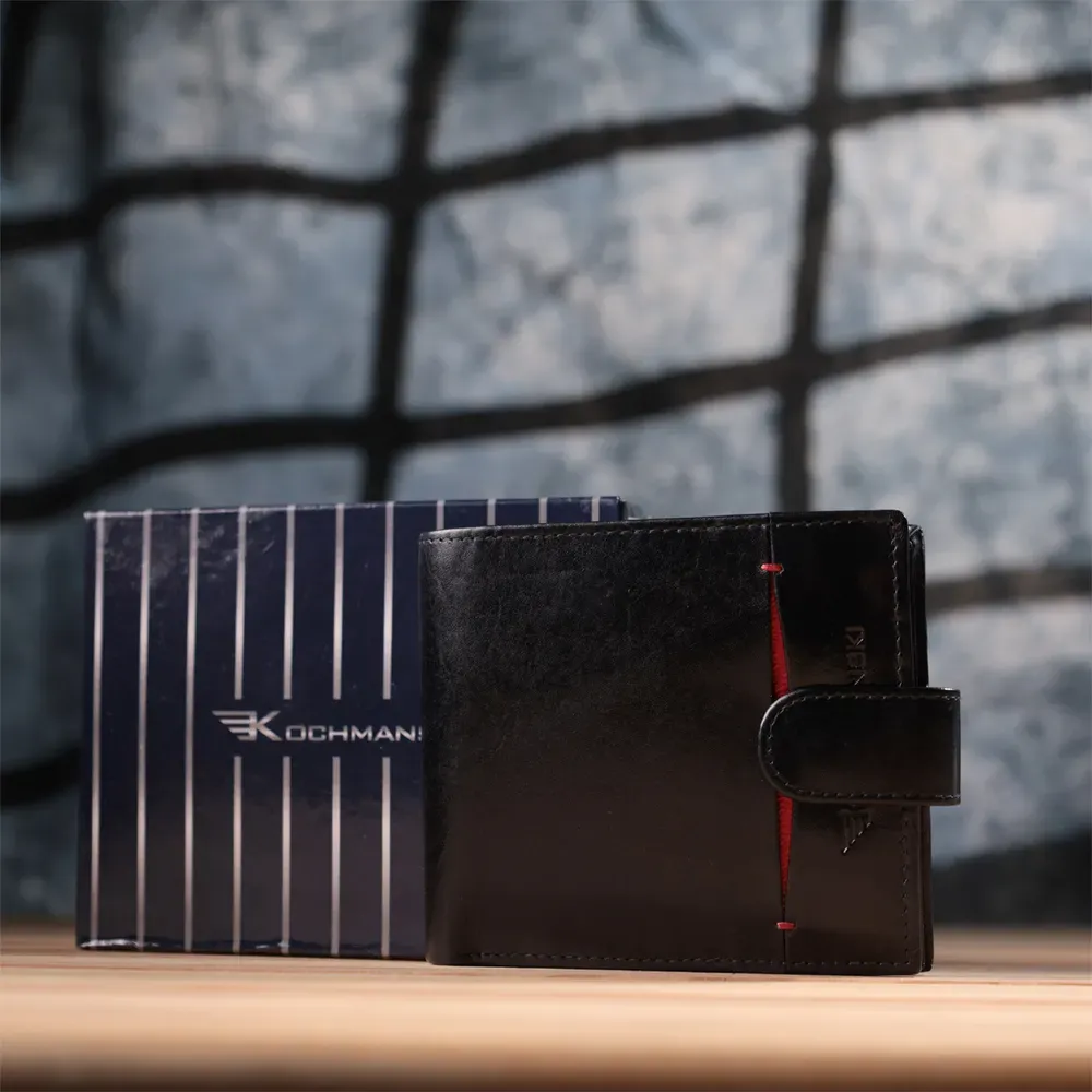 Ексклюзивний чоловічий гаманець із якісної натуральної шкіри з червоним акцентом на лицьовій стороні. Аксесуар зручного розміру, акуратно пошитий, всі рядки рівні, має практичний функціонал. Такий гаманець поєднує в собі стиль, функціонал і неповторний стиль, що ідеально підходить для сучасного чоловіка будь-якого віку, який цінує зручність та стиль в одному виробі.