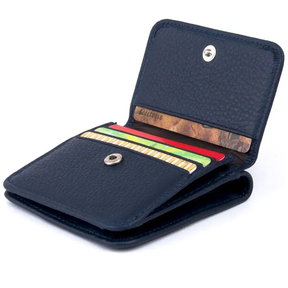 Маленький компактний гаманець темно-синього універсального кольору. Виріб стане знахідкою для тих, хто любить маленькі компактні гаманці. Цей аксесуар легко поміститься навіть у найменшу дамську сумочку. Закривається – на кнопку. Окрема частина гаманця – автономна монетниця на кнопці з кількома слотами для кредиток. На лицьовій стороні аксесуара металевий логотип бренду. У комплекті до гаманця йде картонна біла упаковка з логотипом.
