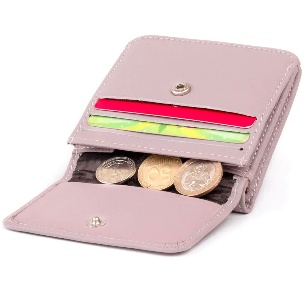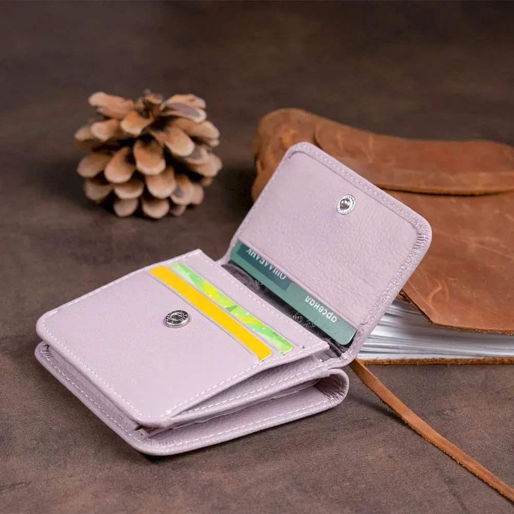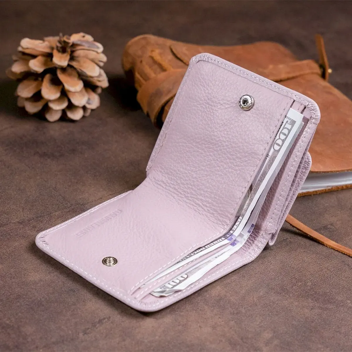 Маленький жіночий гаманець фіолетового кольору з натуральної шкіри. Виріб має дві частини: одна для купюр із двома відділеннями та друга для монет на кнопці. Маленький гаманець легко міститься навіть у найменшу дамську сумочку. Виріб упакований у фірмове впакування білого кольору з логотипом. Цей гаманець додасть володарці жіночності та легкості, а фіолетовий колір не залишиться непоміченим оточуючими. Модель підійде для шанувальників маленьких та компактних гаманців, які не займають багато місця.