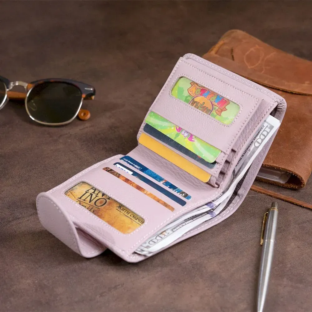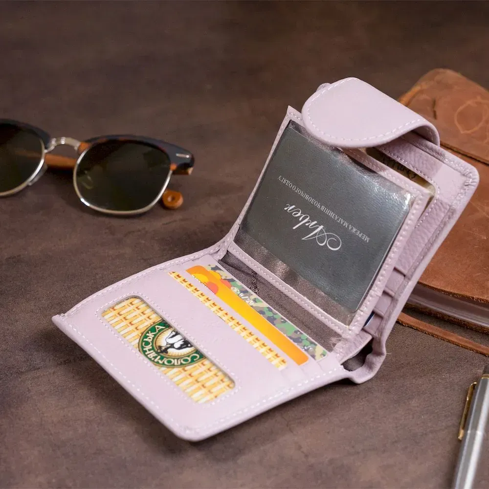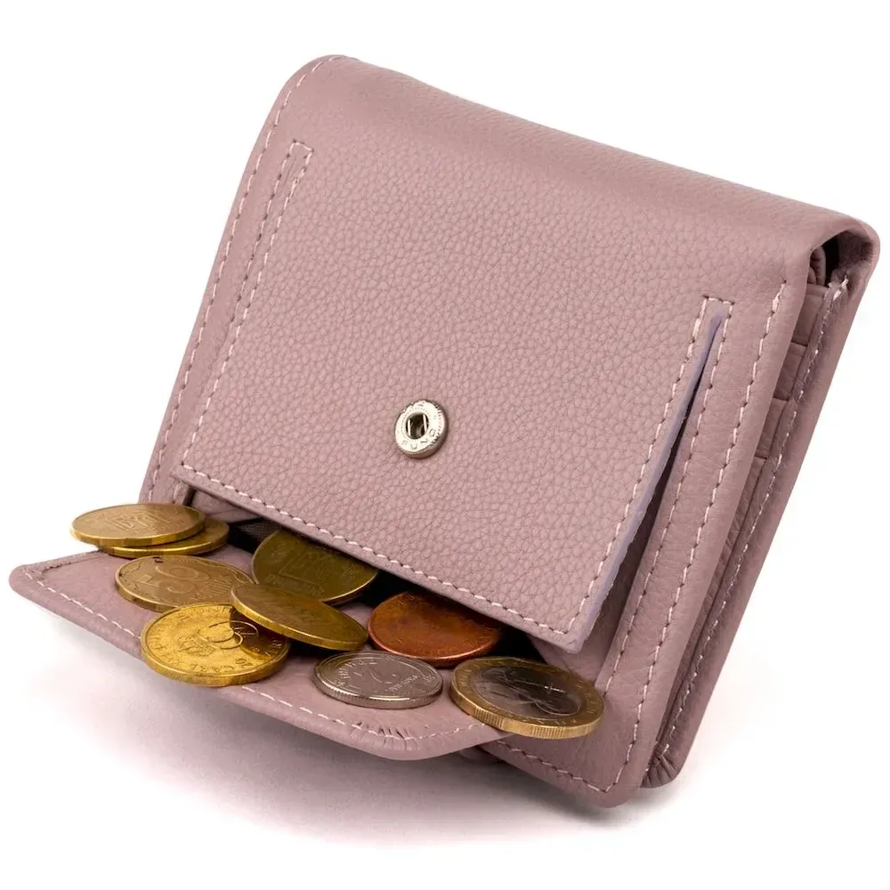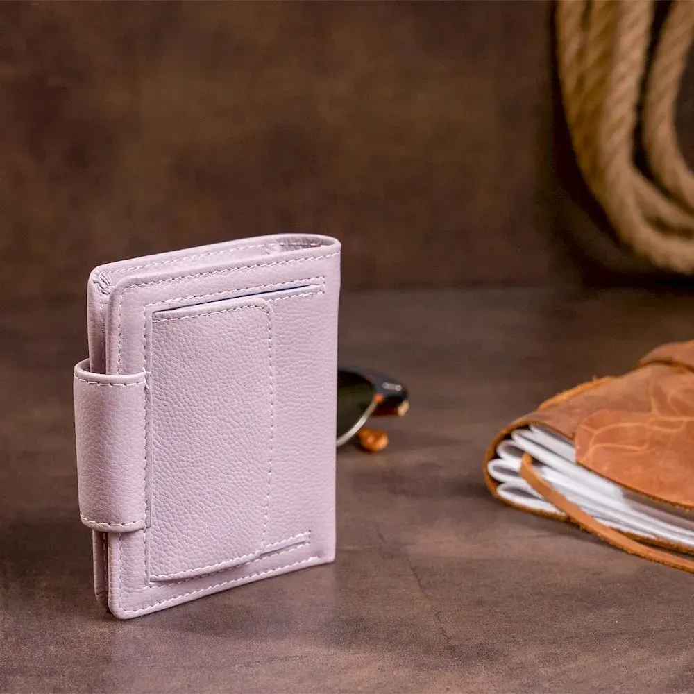 Компактний жіночий гаманець оригінального лілового кольору. Надасть вам легкості та багатогранності. Виріб легко поміститься у маленьку сумочку. Закривається гаманець на шкіряний хлястик із кнопкою. Аксесуар зручно лежить у руці. По краях модель прошита рівним рядком. Виконаний гаманець із натуральної шкіри та прослужить вам далеко не один рік. Виробництво – фабричний Китай. Незважаючи на свій невеликий розмір гаманець вміщує досить купюр кредиток і монет. У комплекті до гаманця йде фірмове впакування. Виріб стане чудовим подарунком для близької людини.
