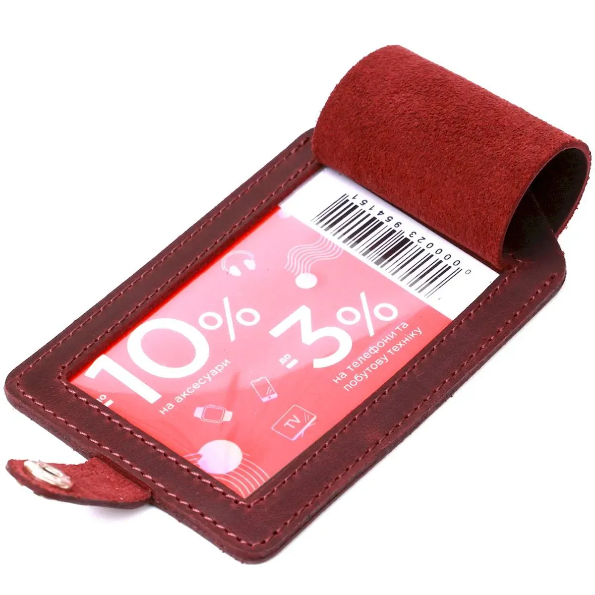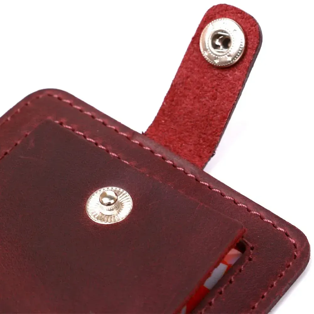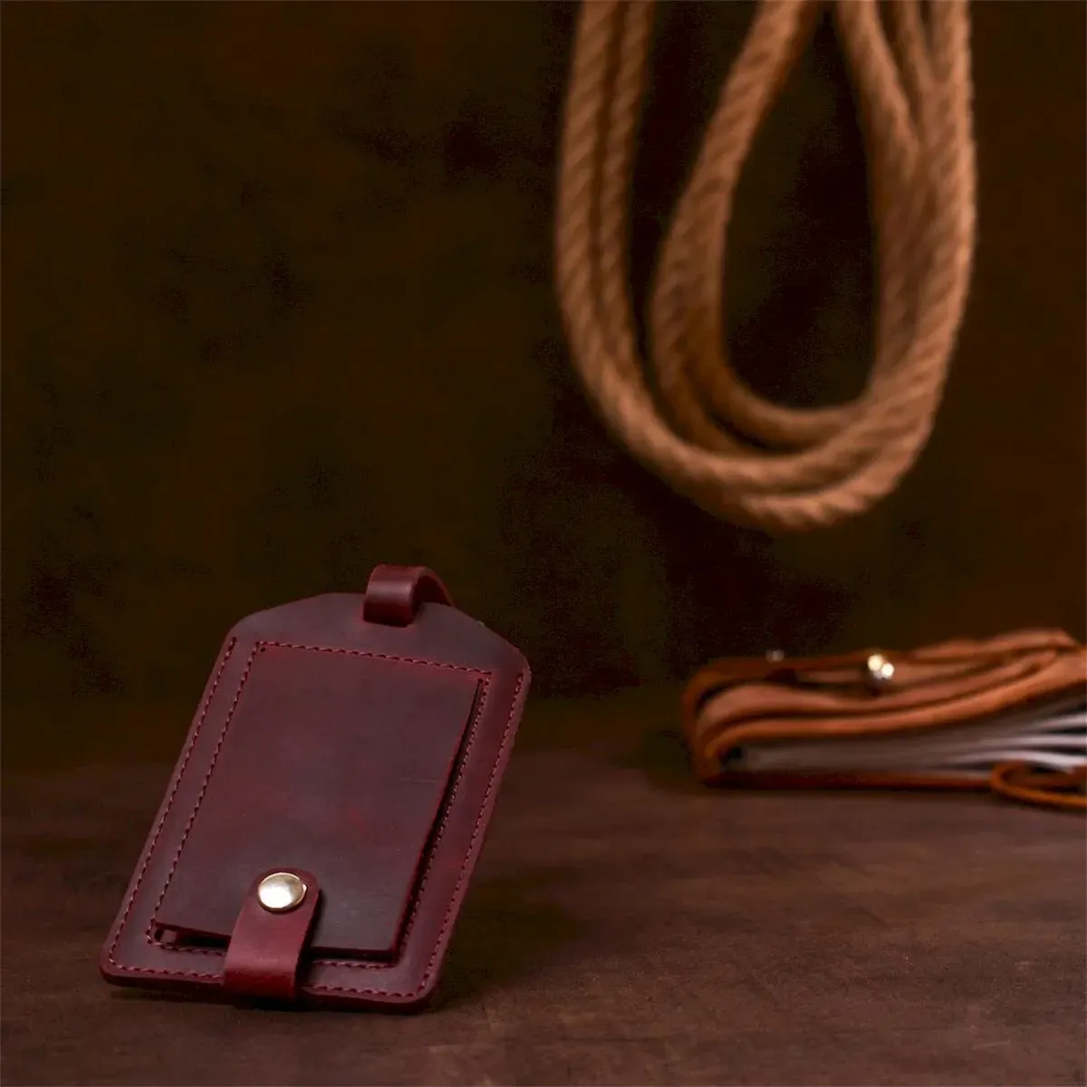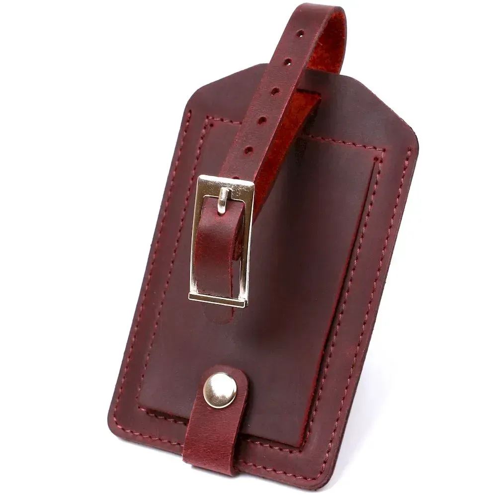 Добротна бирка на валізу в практичному дизайні від українського виробника. Матеріал виготовлення – натуральна шкіра високої якості та опірності до зносу. Колір аксесуара – бордовий, фактура – матова гладка і дуже приємна на дотик. Кріпиться бирка за допомогою ремінця, що регулюється, інформаційний слот закривається клапаном з кнопкою, що дуже зручно і практично.