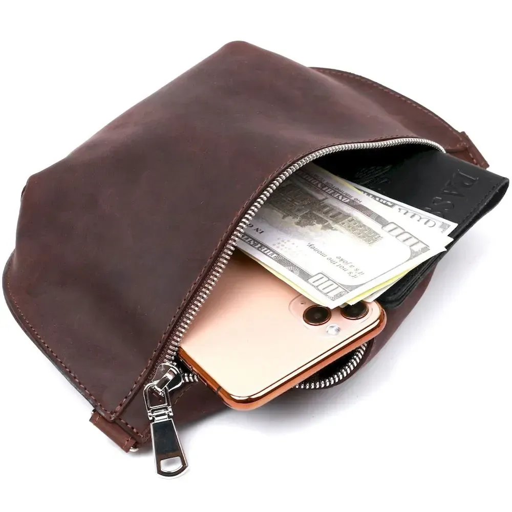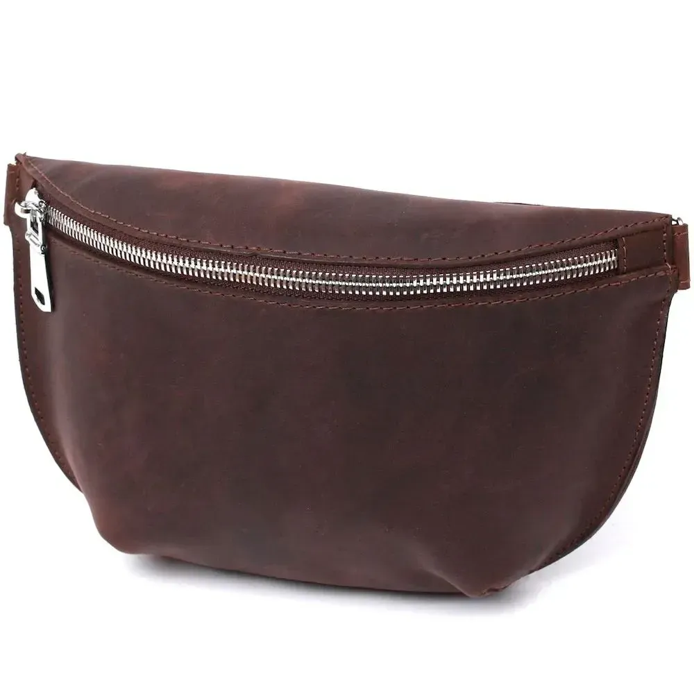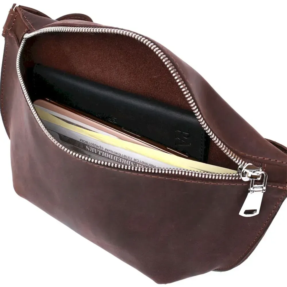 Чудова жіноча бананка в міському сучасному стилі. Вона має невеликий розмір, але дуже містка та зручна в експлуатації. Матеріал виготовлення – натуральна шкіра з покращеними показниками стійкості до зношування. Дана модель має вінтажну гладку фактуру та темно-коричневий колір. Поспішайте купити цей виріб собі або на подарунок близькій людині.