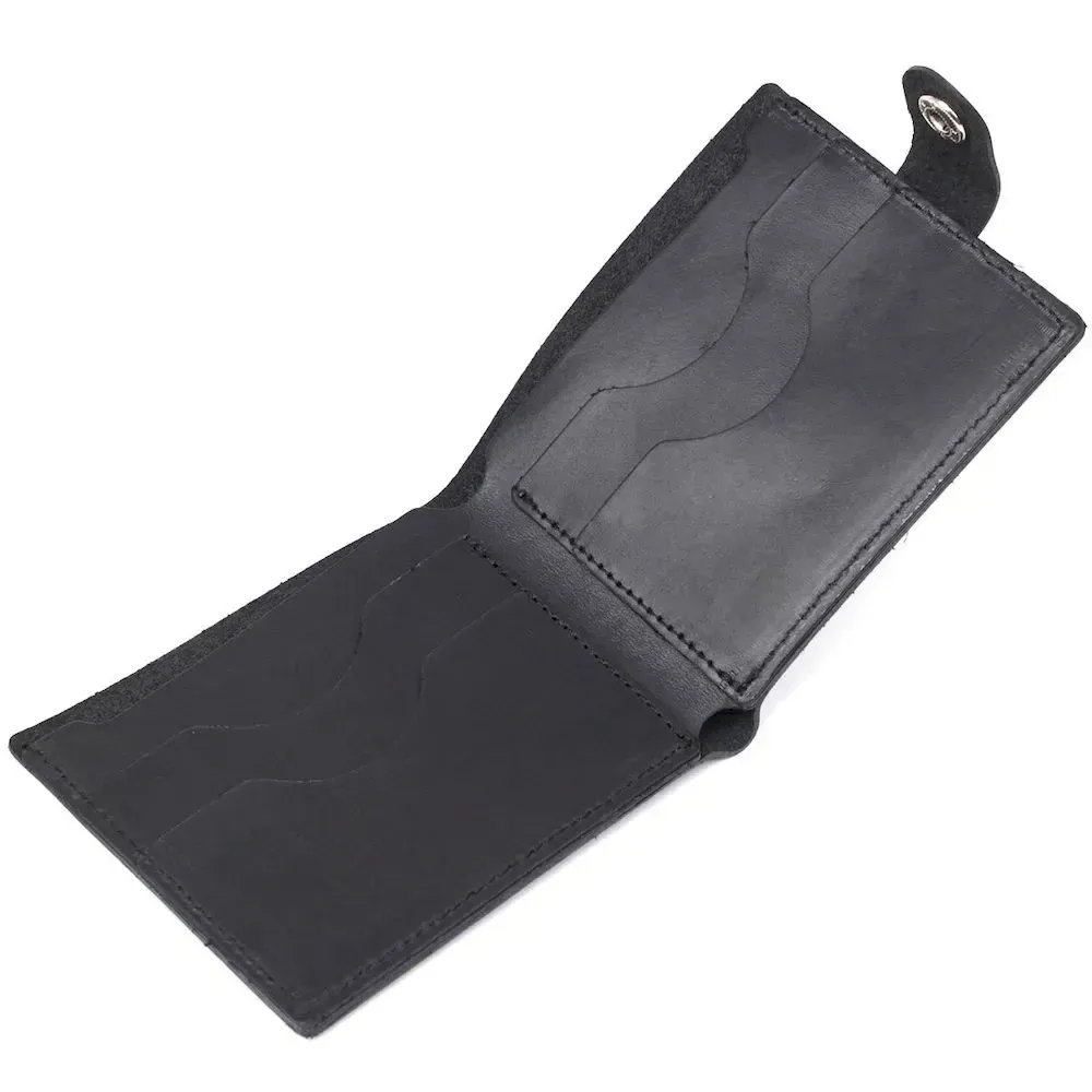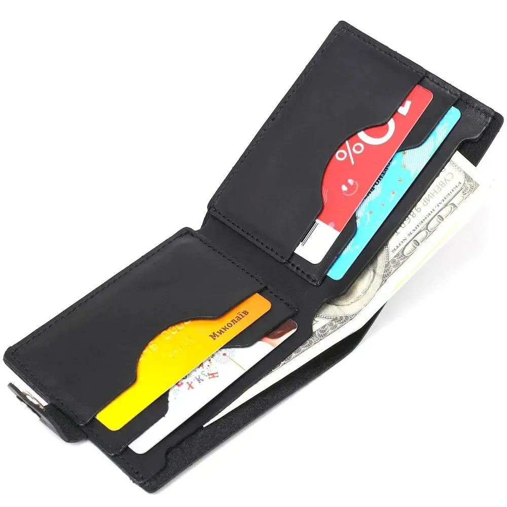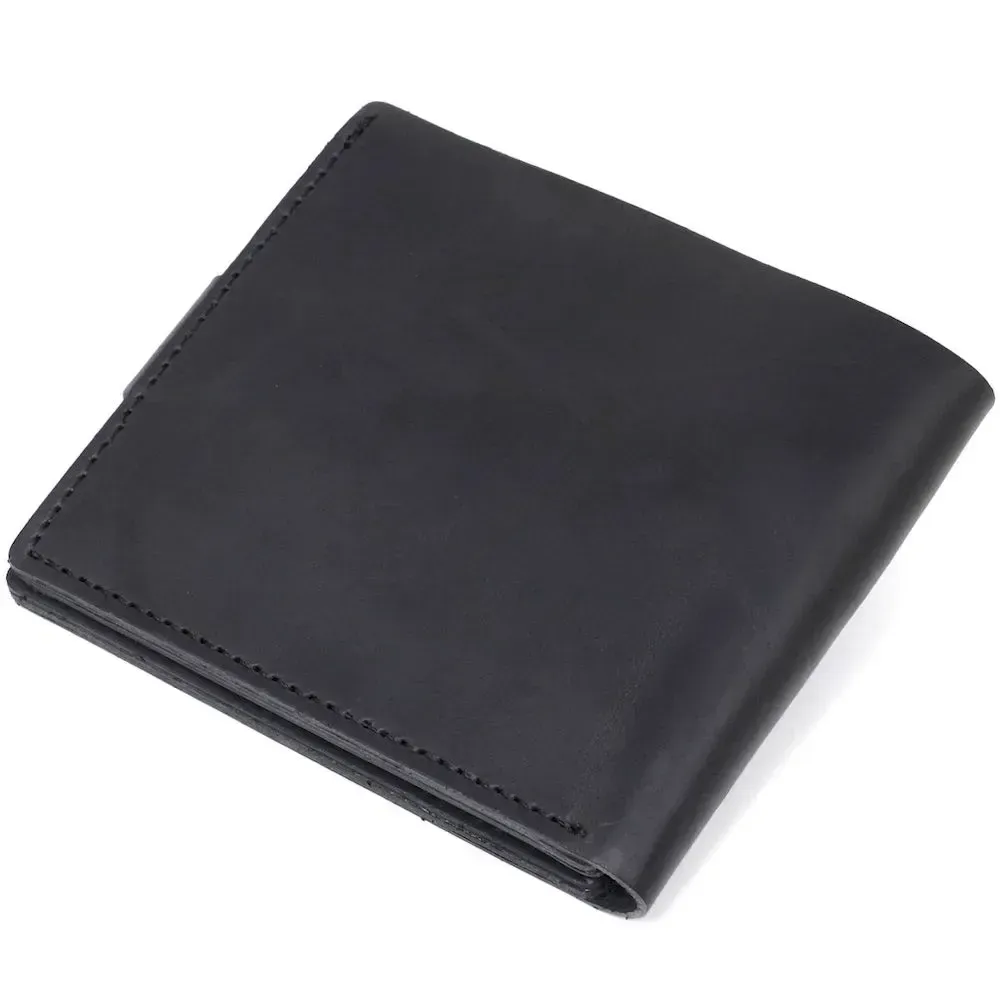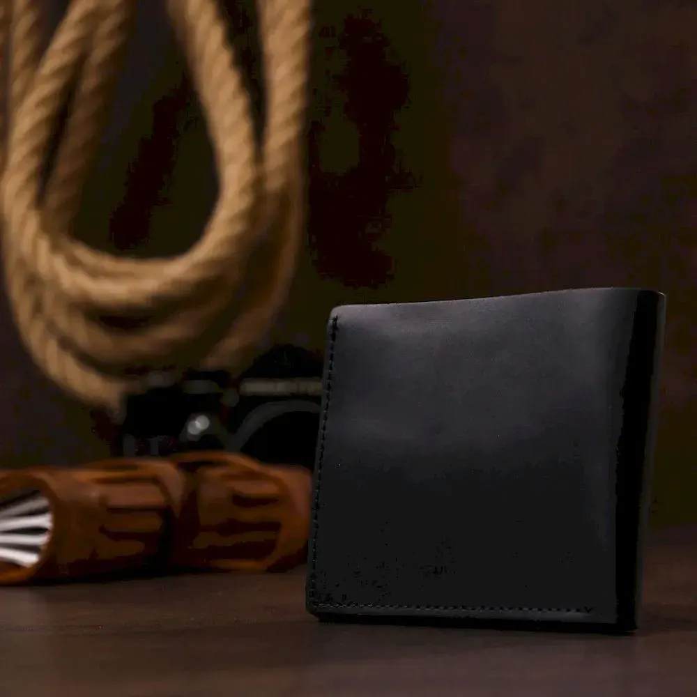Класичне чоловіче портмоне у вінтажному стиль і практичний дизайн. Матеріал виготовлення – натуральна шкіра високого класу із відмінними показниками міцності. Колір виробу – універсальний чорний у матовому виконанні, фактура – гладка. Усередині аксесуару є містке відділення для купюр та кілька слотів для карток.