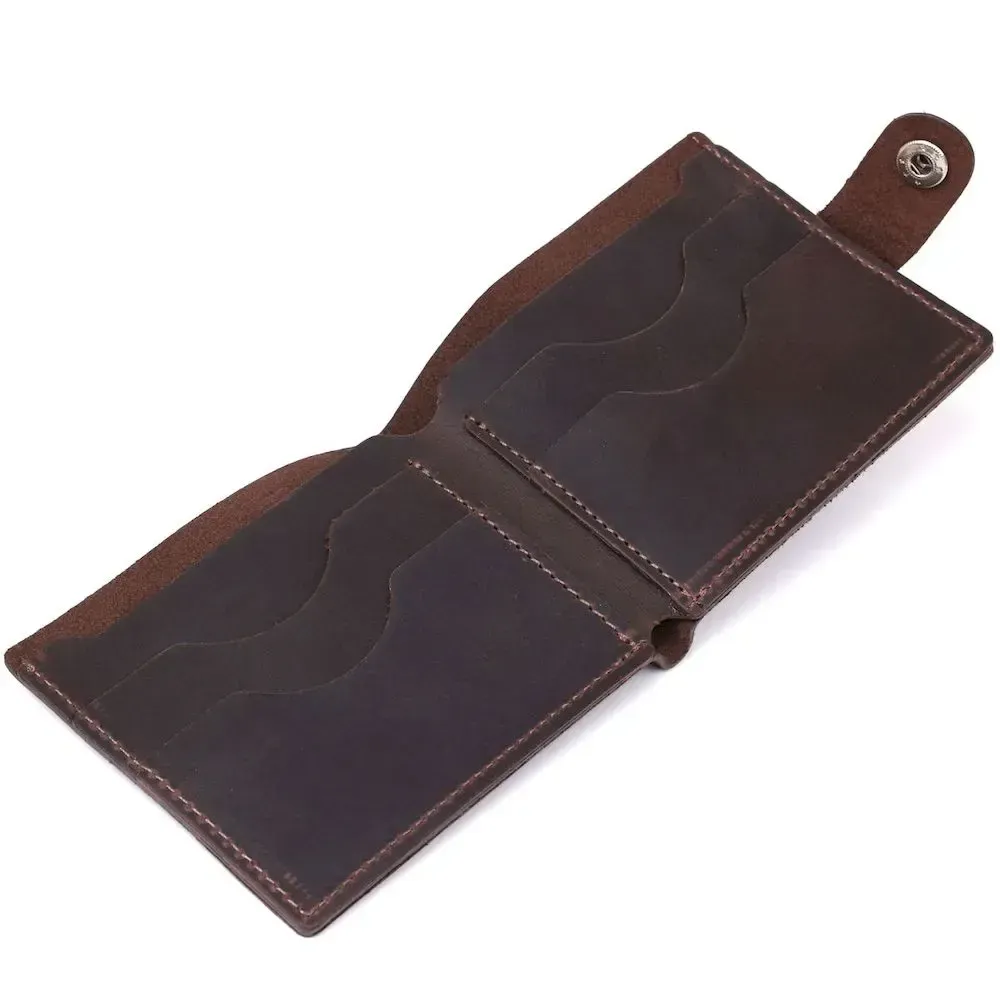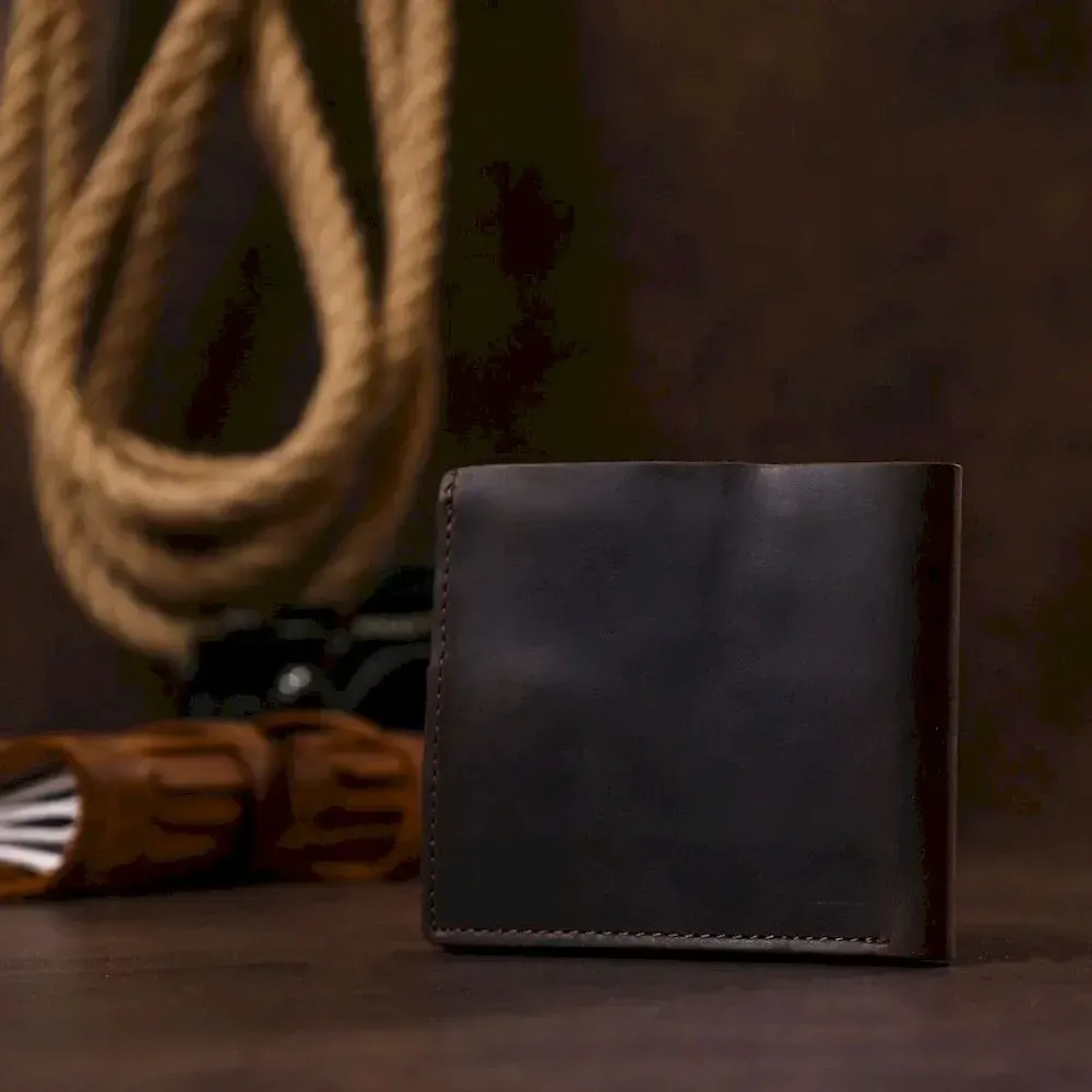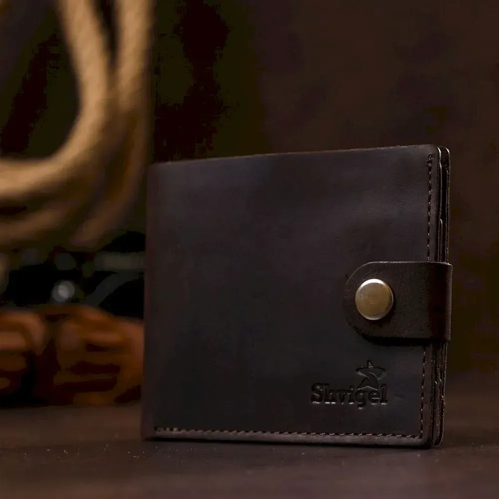 Добротне портмоне в два шарування для стильних та сучасних чоловіків. Виконано виріб із натуральної високоякісної шкіри найвищого класу, яка стійка до зносу. Колір аксесуара – матовий темно-коричневий, що виглядає багато і красиво. Фактура – гладка і приємна на дотик. Закривається портмоне на хлястик із кнопкою.