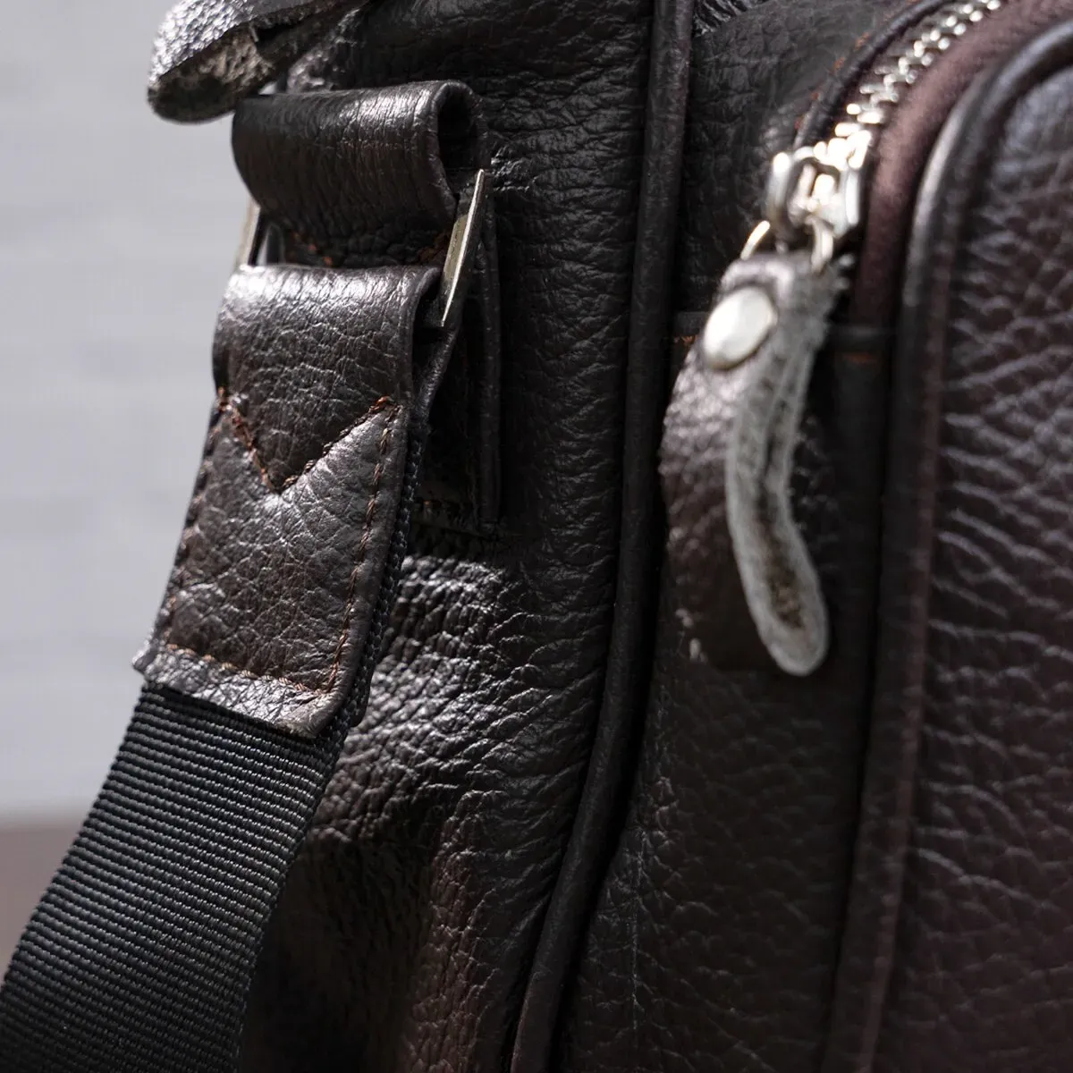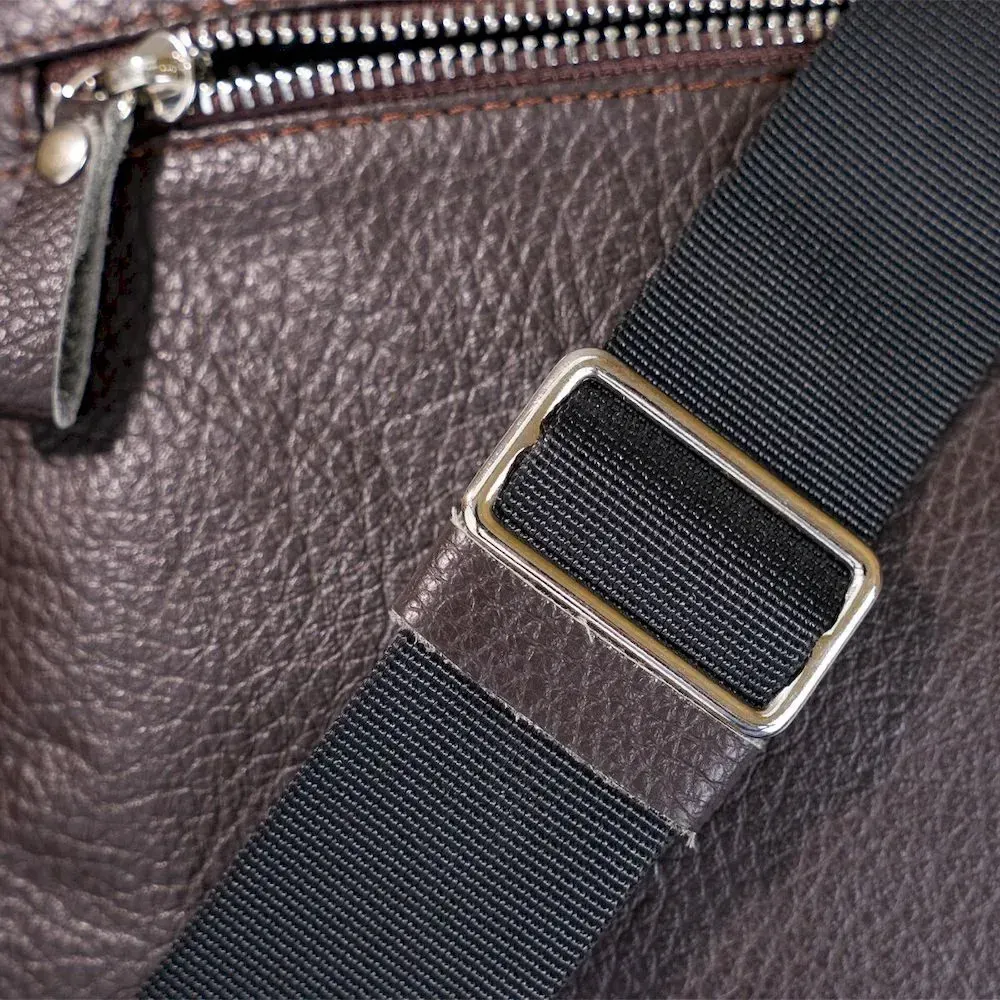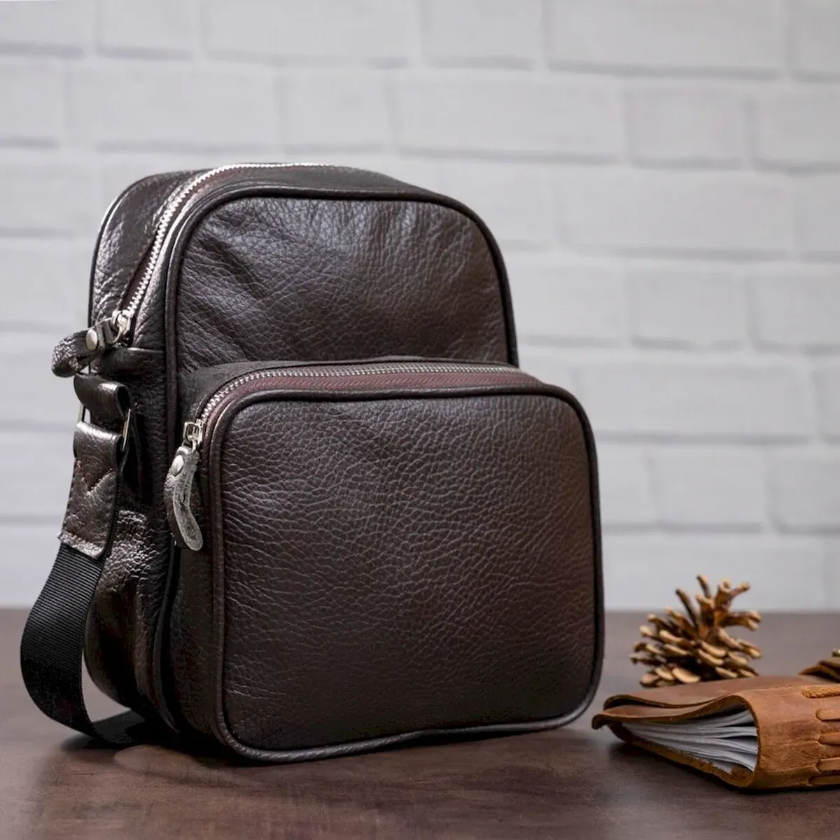 Современная мужская кожаная сумка темно-коричневого цвета. Аксессуар выполнен из кожи флотар, которая отличается «зернистой» фактурой. Цвет фурнитуры: серебро. Сумка носится через плечо при помощи регулируемого плечевого ремня, который выполнен из прочного текстильного материала.