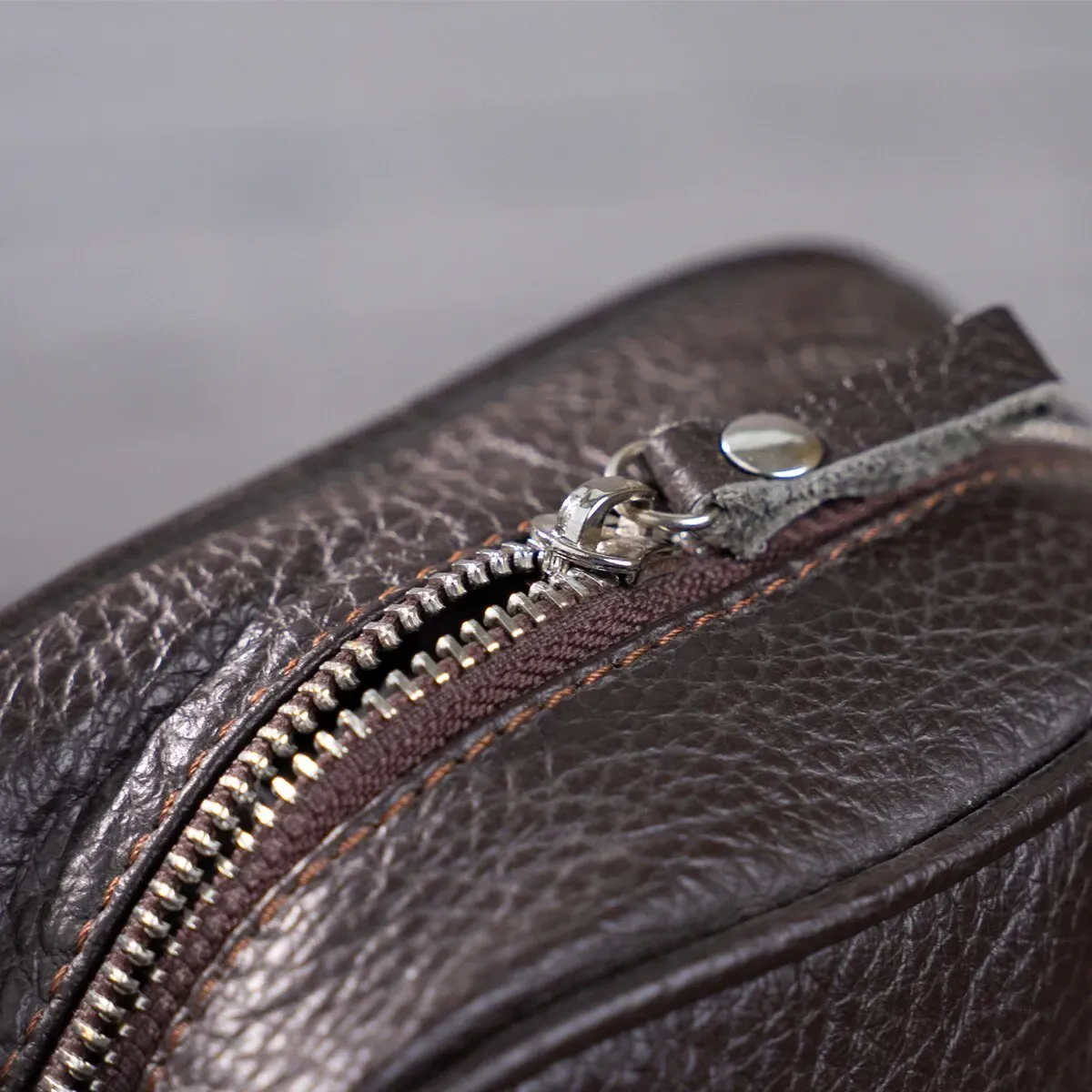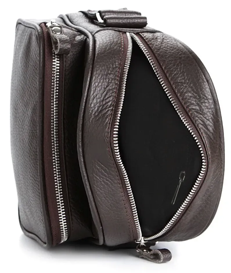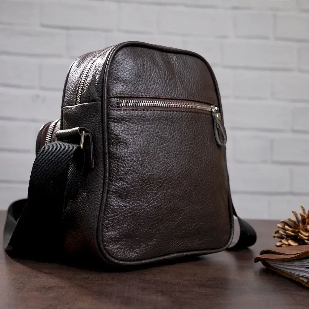 Современная мужская кожаная сумка темно-коричневого цвета. Аксессуар выполнен из кожи флотар, которая отличается «зернистой» фактурой. Цвет фурнитуры: серебро. Сумка носится через плечо при помощи регулируемого плечевого ремня, который выполнен из прочного текстильного материала.