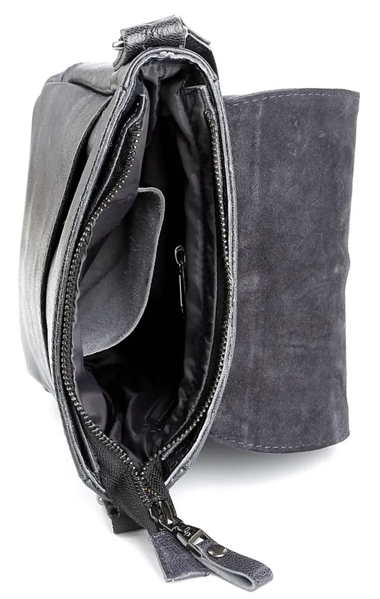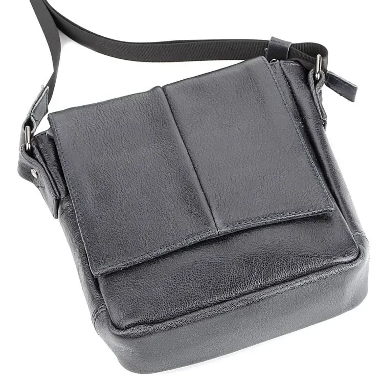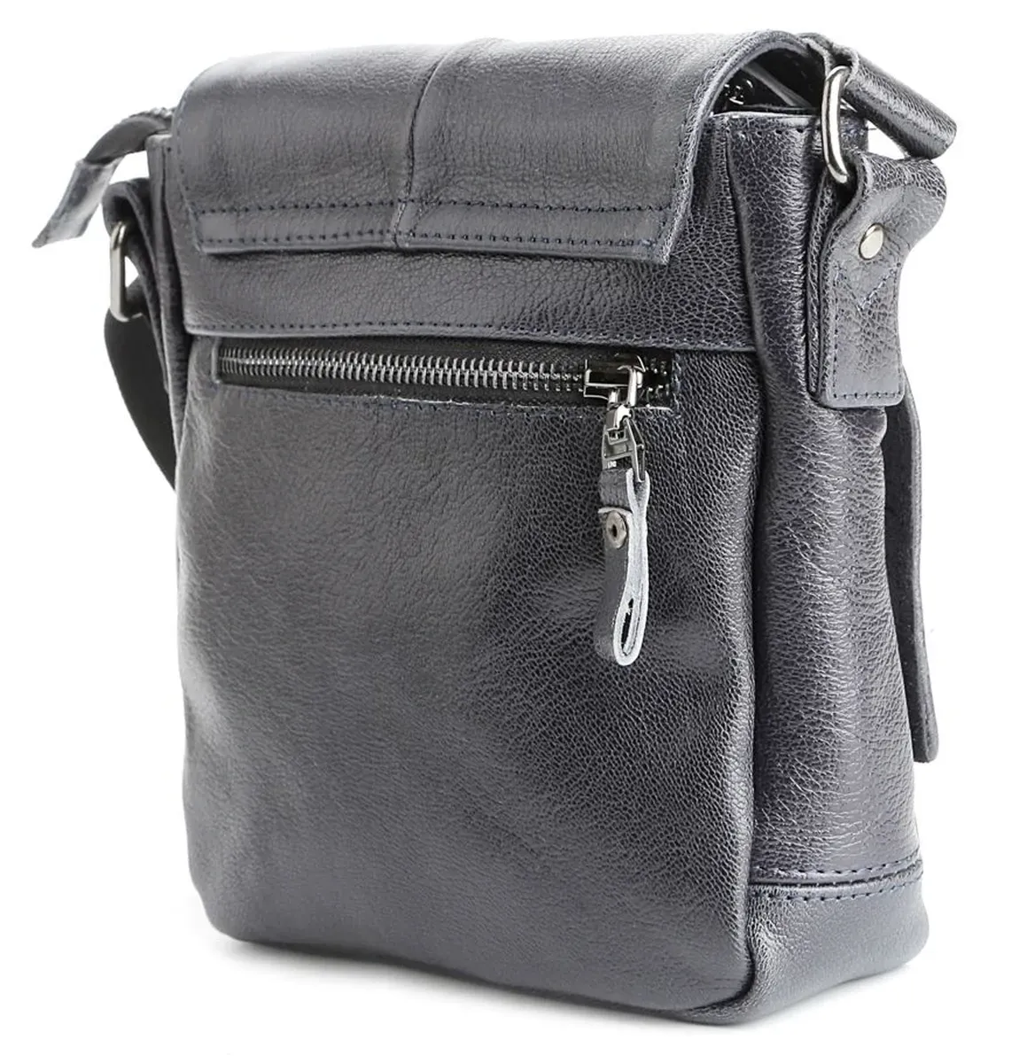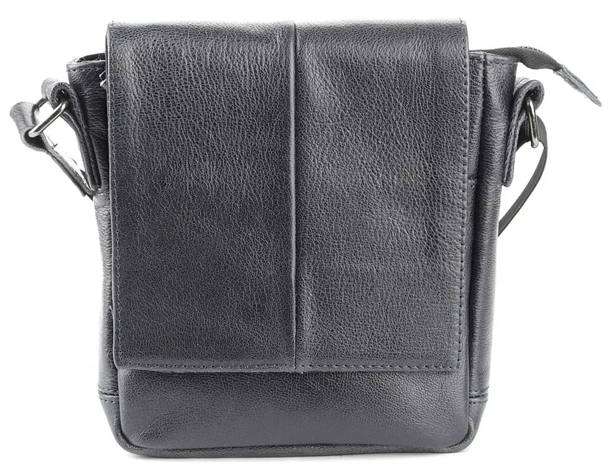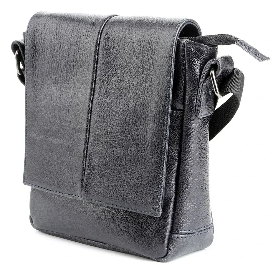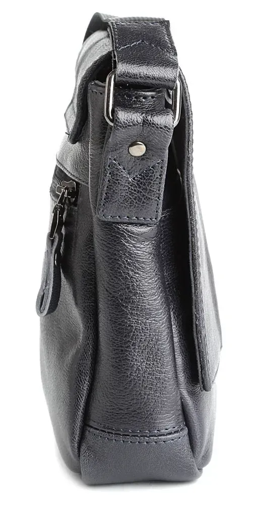 Высококачественная мужская кожаная сумка. Аксессуар можно носить через плечо при помощи регулируемого, текстильного плечевого ремня черного цвета. Изделие закрывается при помощи кожаного клапана на двух скрытых магнитах и молнией. Под клапаном расположен накладной карман. На задней внешней стороне находится отделение на молнии. Цвет фурнитуры: темное серебро. Кожаная сумка станет превосходным подарком мужчине к любому празднику.
