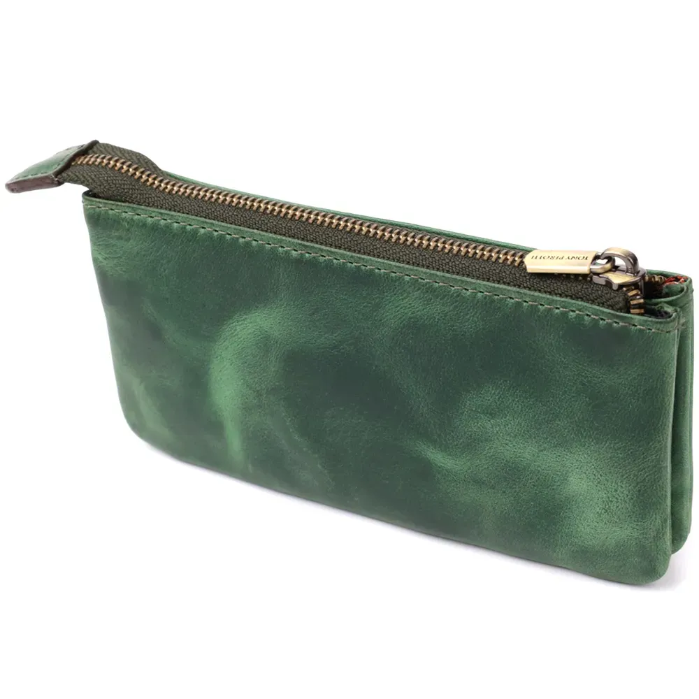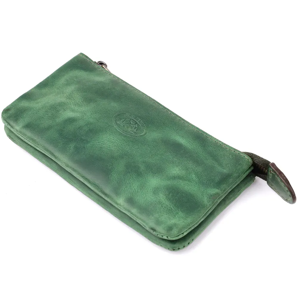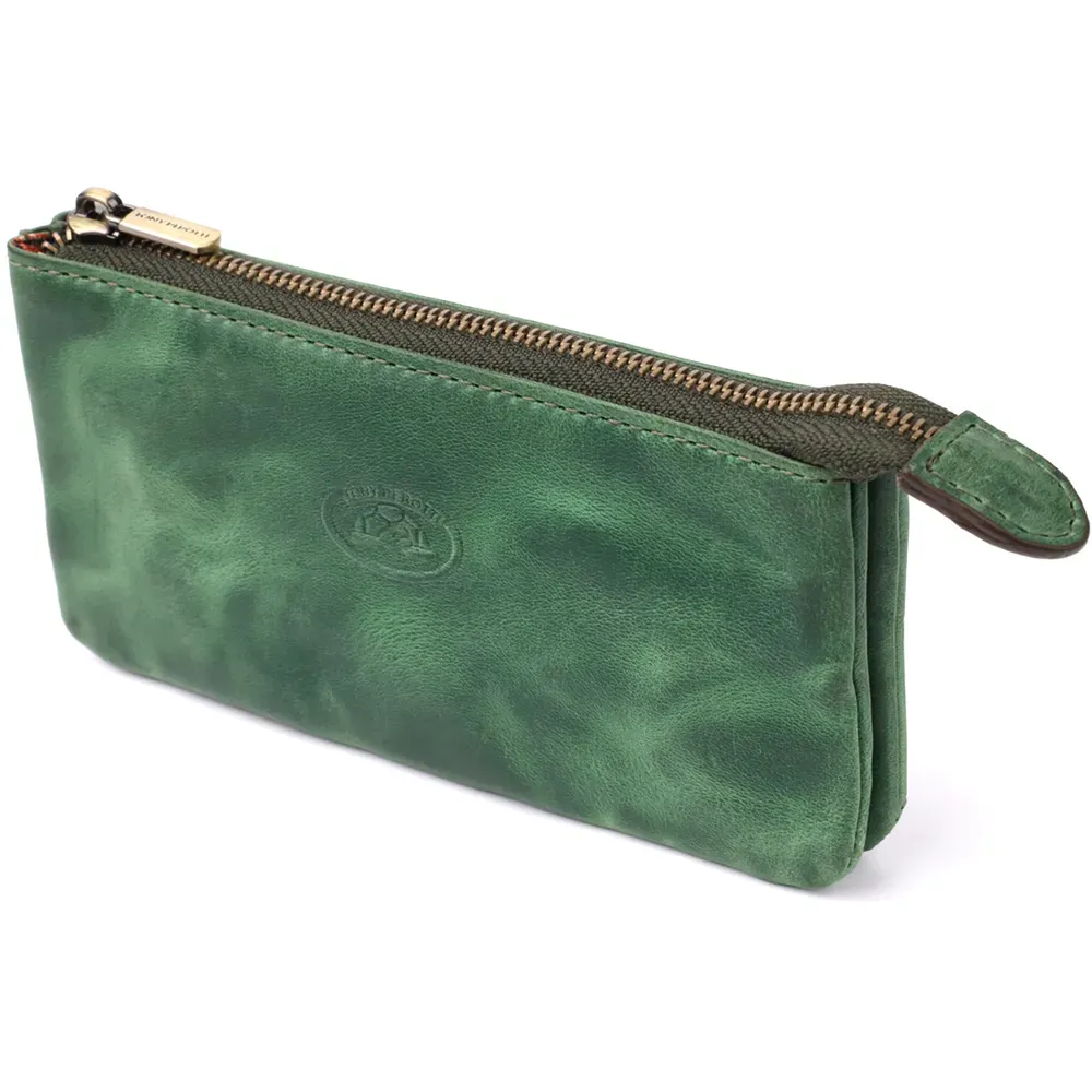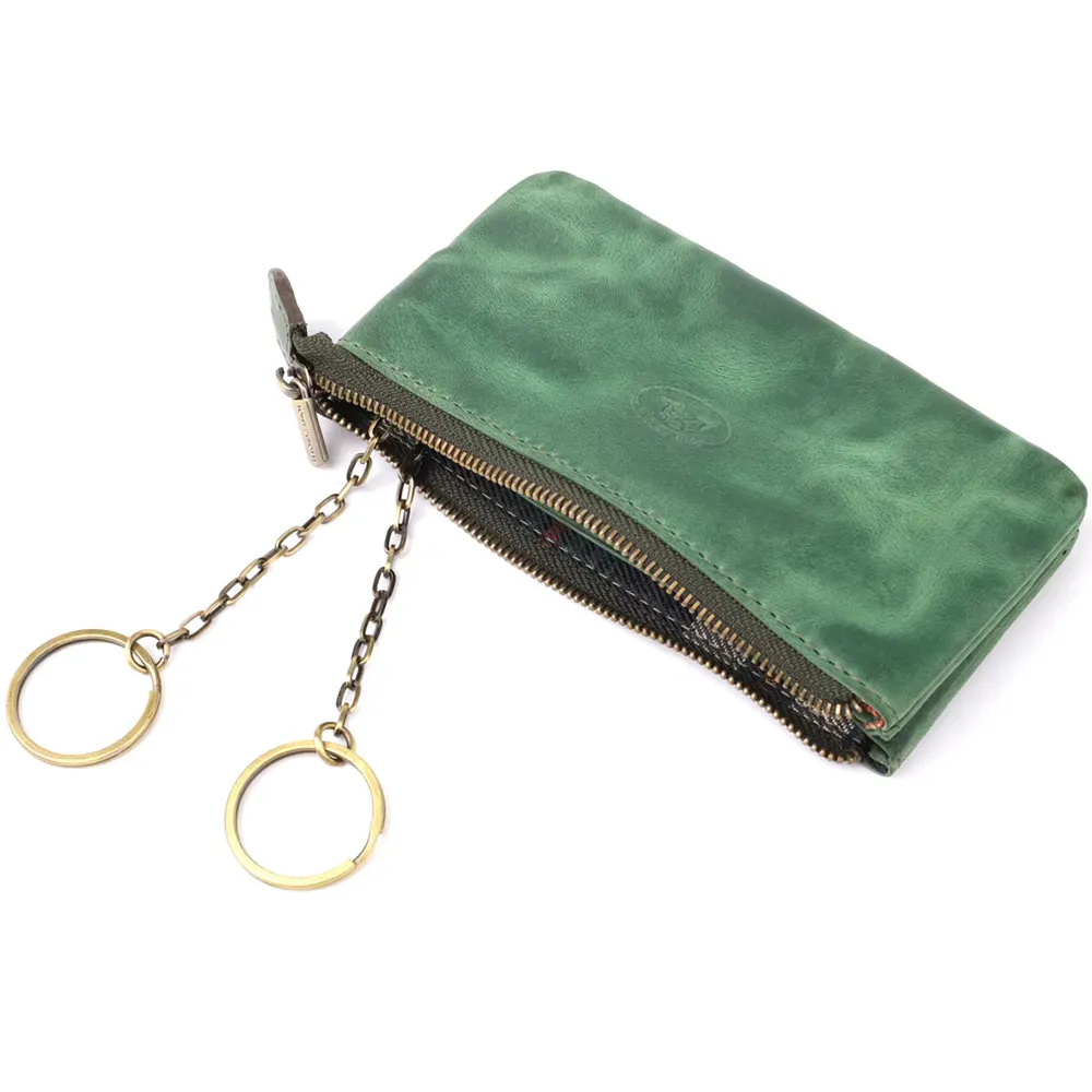 Ключниця з натуральної vintage шкіри в зеленому кольорі. Закривається на блискавку – зручно та надійно. Оснащена трьома відділеннями та двома кільцями для ключів. Доповнена брендованою фурнітурою високої якості. Така ключниця поєднує функціональність та елегантність. Підійде для щоденного використання і стане гідним аксесуаром або подарунком.