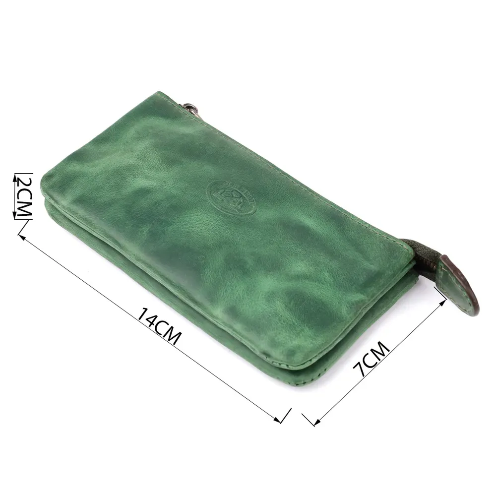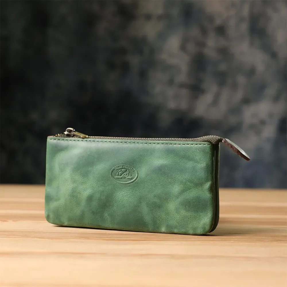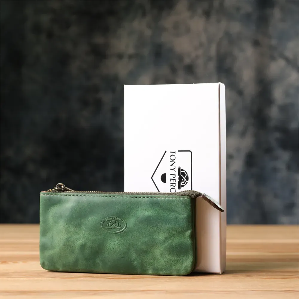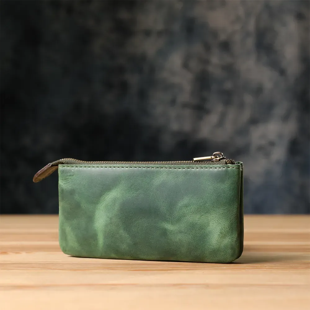 Ключниця з натуральної vintage шкіри в зеленому кольорі. Закривається на блискавку – зручно та надійно. Оснащена трьома відділеннями та двома кільцями для ключів. Доповнена брендованою фурнітурою високої якості. Така ключниця поєднує функціональність та елегантність. Підійде для щоденного використання і стане гідним аксесуаром або подарунком.