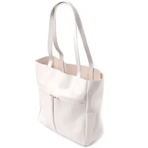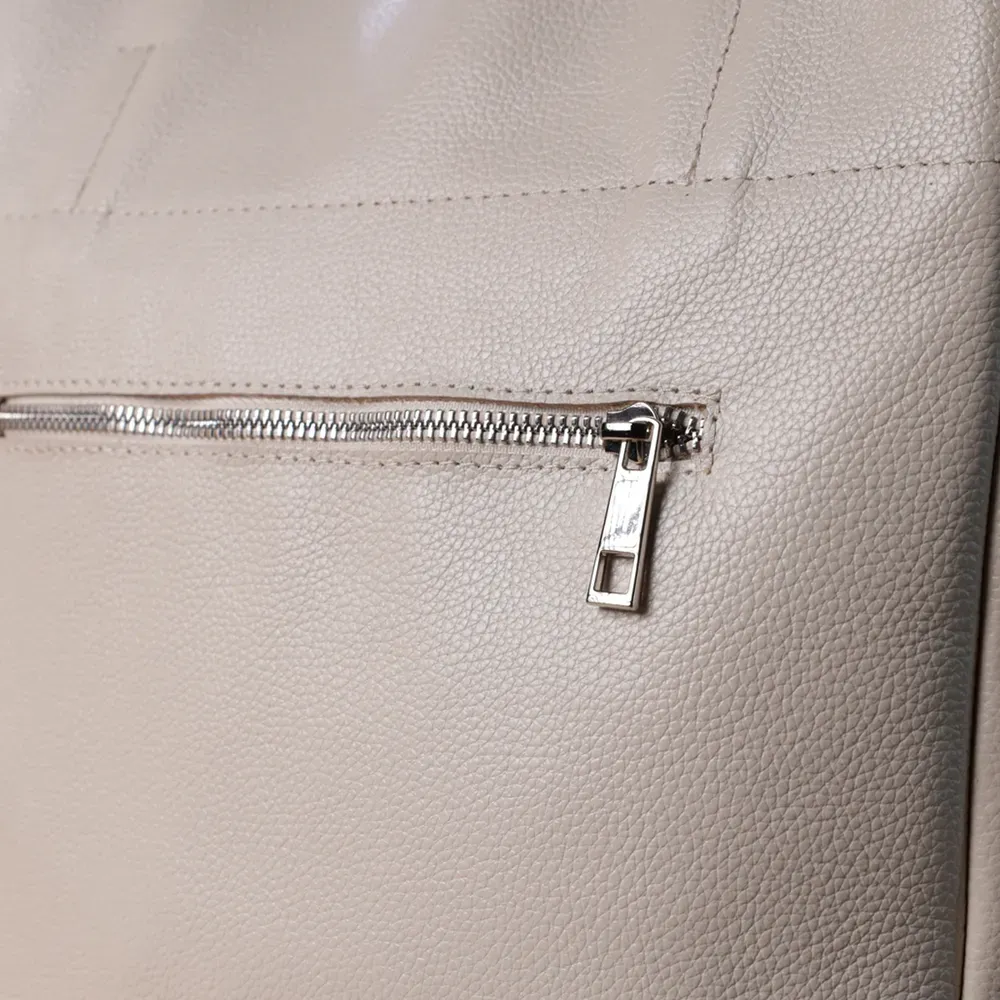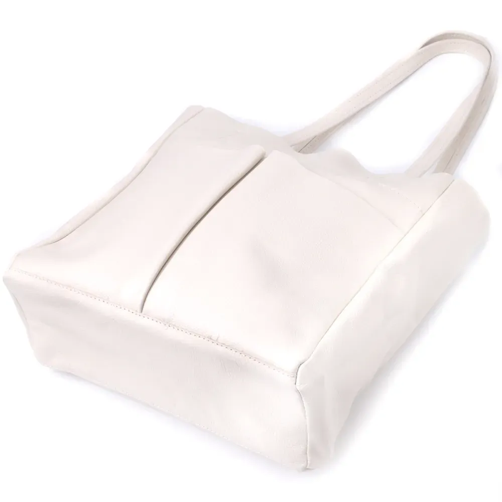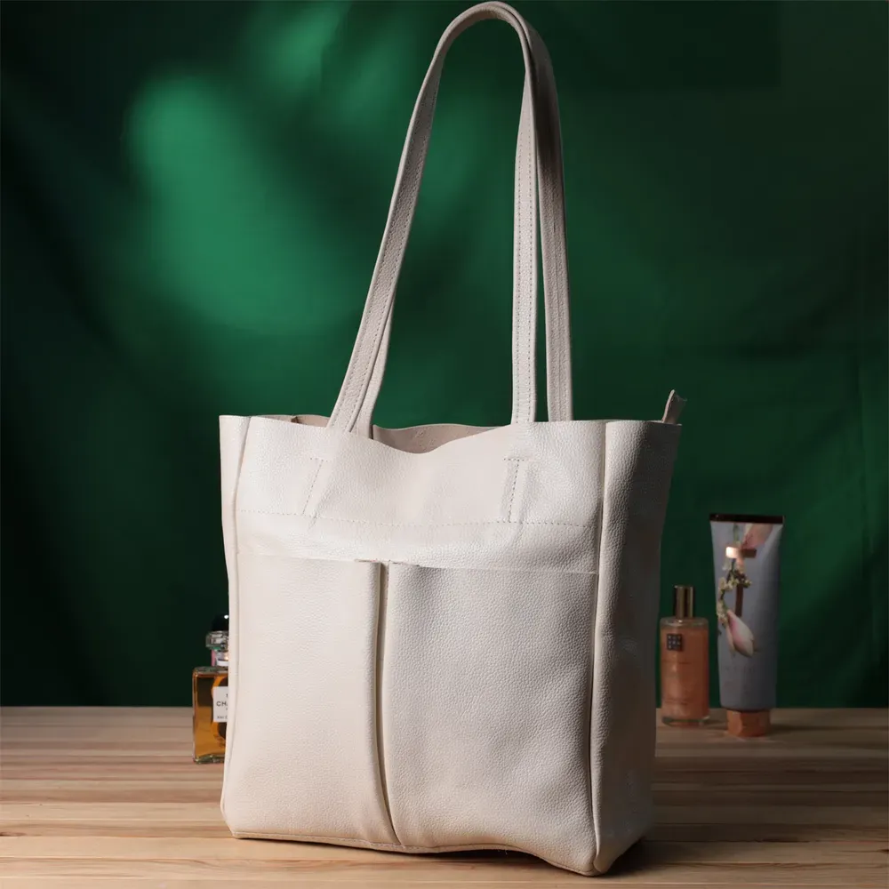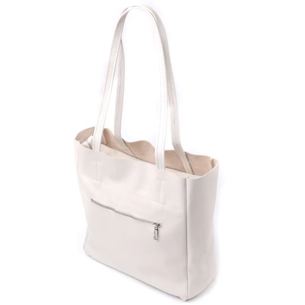 Ідеальна жіноча сумка для тих, хто завжди носить із собою величезну кількість речей. Таку сумку можна спокійно носити на роботу, в неї добре поміщаються всі особисті речі і папки з документами. Також таку модель зручно брати із собою у подорожі та виглядати завжди стильним та елегантним. Колір моделі – бежевий, фактура – зерниста. Матеріал виконання – натуральна шкіра з високими показниками стійкості до зношування. Для перенесення використовуються дві міцні надійні ручки. Сумка має знімне ущільнене дно прямокутної форми, щоб надати за бажанням більш чітких форм аксесуару. Фурнітура срібного кольору – стійка не змінює свій колір у процесі носіння. Аксесуар чудово поєднується з усіма стилями в одязі та може стати чудовим подарунком на будь-яке свято.