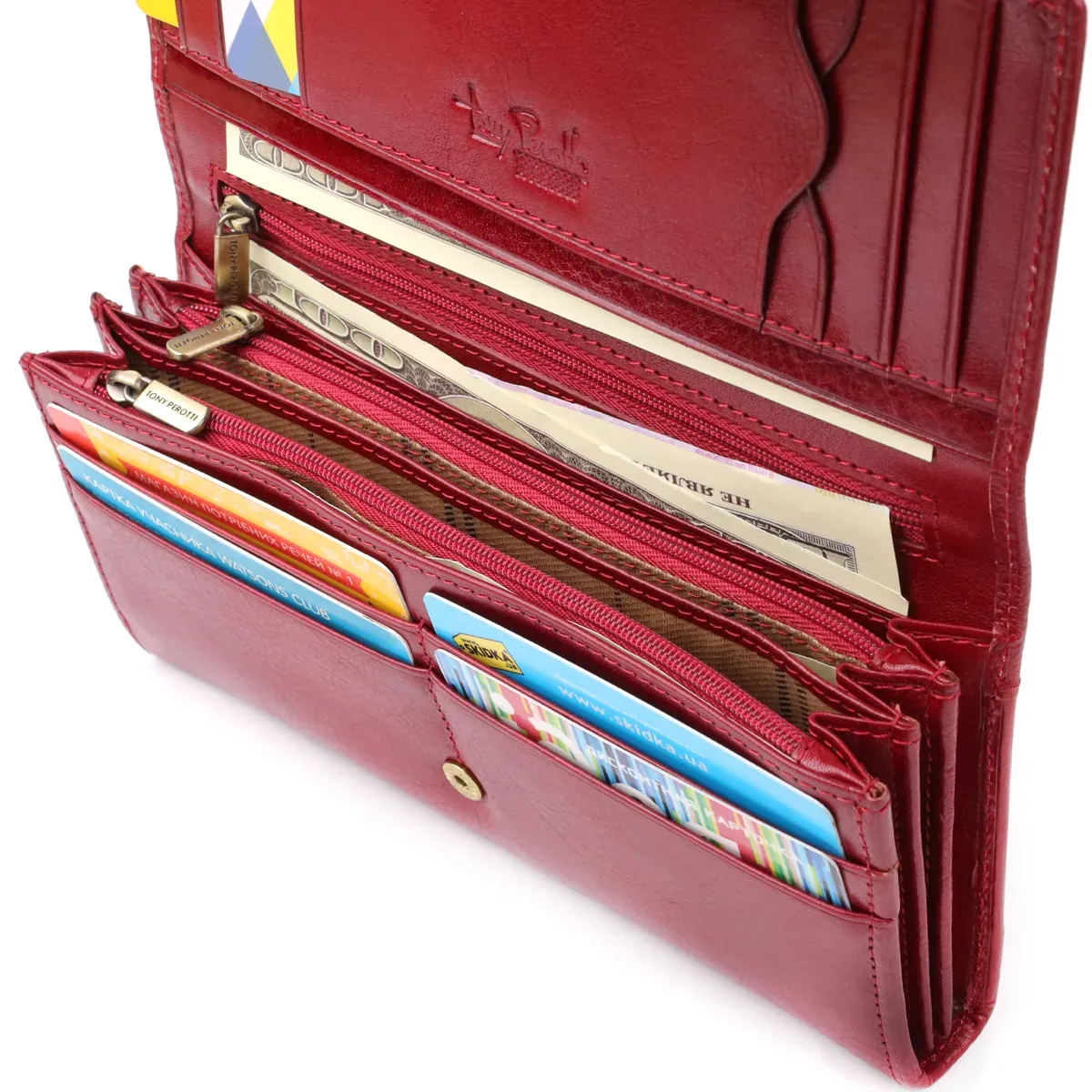 Містке жіноче класичне портмоне Tony Perotti у насиченому червоному кольорі поєднує елегантність, функціональність та бездоганну якість. Продумана внутрішня організація дозволяє зручно розмістити купюри, карти, документи та дріб'язок, а зовнішня кишеня на блискавці забезпечує швидкий доступ до монет. Брендована фурнітура, фірмова картата підкладка та тиснений логотип підкреслюють преміальний стиль аксесуара та роблять його чудовим вибором для сучасної жінки.