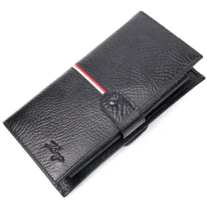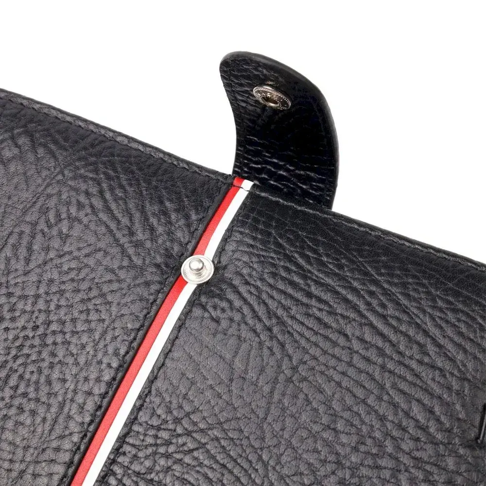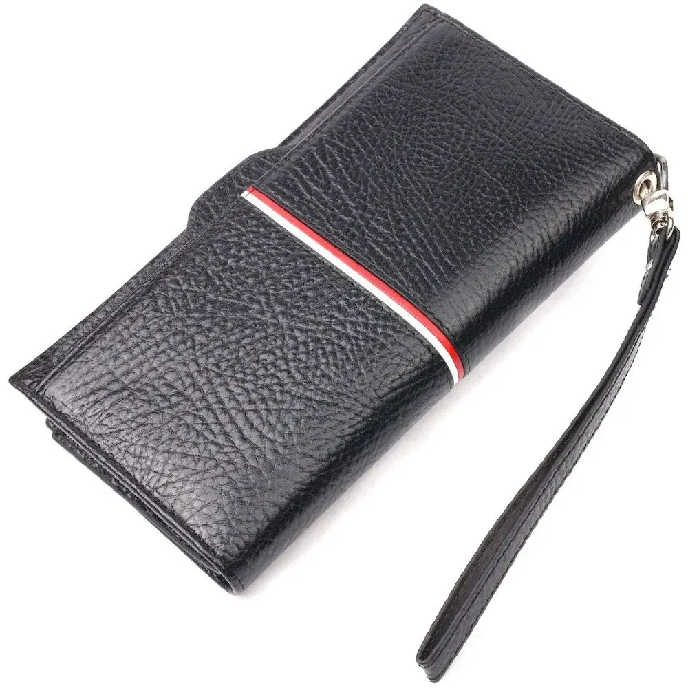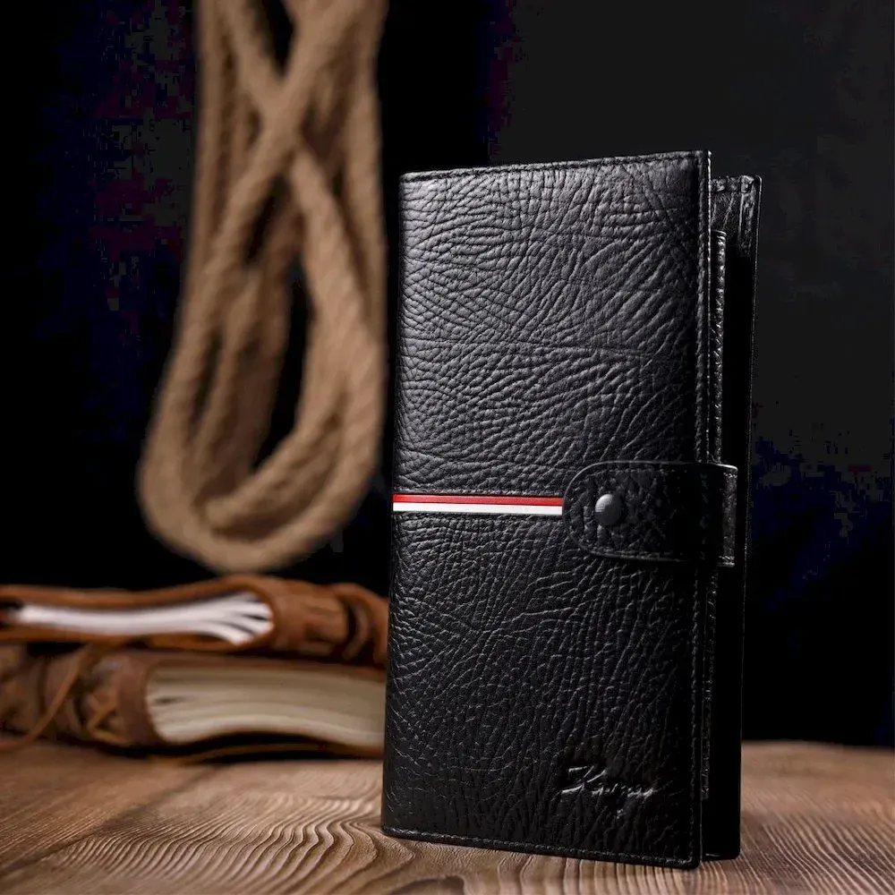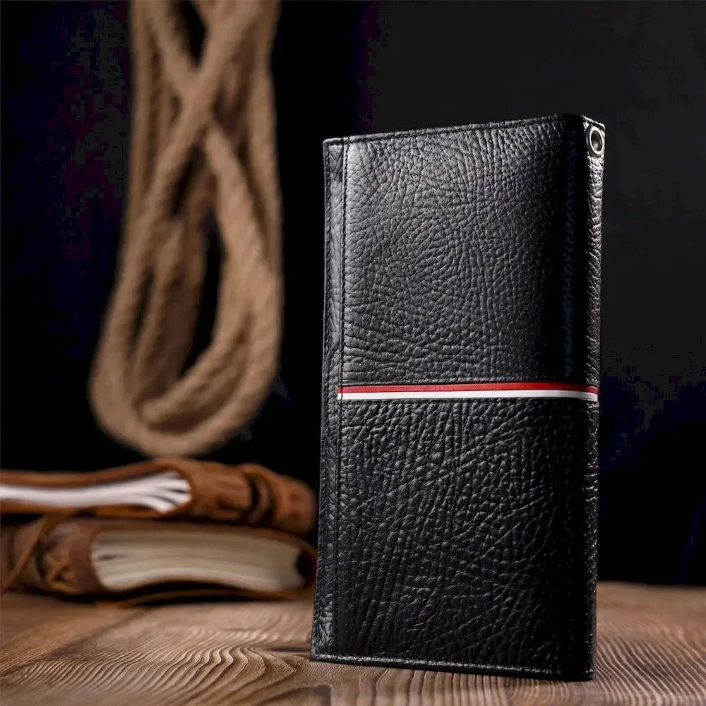 Місткий чоловічий клатч з натуральної крупнозернистої шкіри з використанням добротного текстилю (внутрішня підкладка). Носиться за допомогою ремінця на зап'ясті або просто в руці. Має декоративну вставку червоно-білого кольору. Тип фіксації в клатчі: хлястик із металевою кнопкою. Для зручності в носінні гаманець укомплектований зап'ястним ремінцем. Дуже гідна модель вертикального формату. З таким аксесуаром чоловік буде виглядати солідно і впевненим у собі.