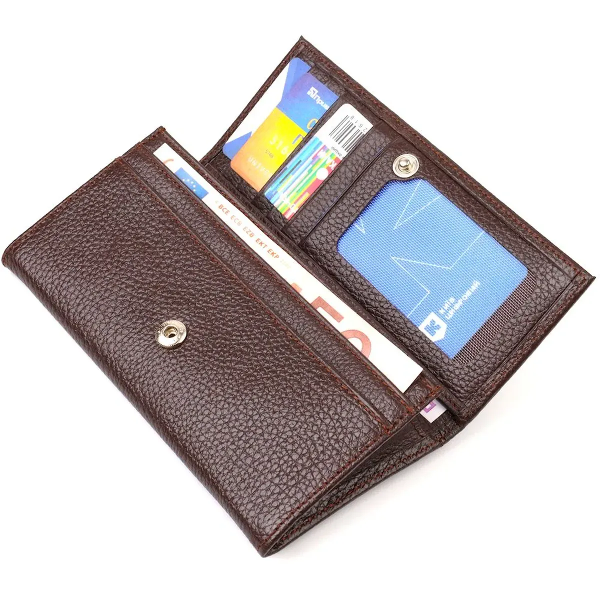 Функціональний жіночий гаманець горизонтального типу з натуральної зернистої шкіри. Аксесуар має одне основне відділення, шість кишень для карток (одна під сіточкою), одна прихована кишеня, три прилеглі кишені та монетниця. Закривається аксесуар клапаном на кнопку. Купуючи шкіряний аксесуар цієї фірми, собі або на подарунок, будьте певні, що він прослужить Вам не один рік.
