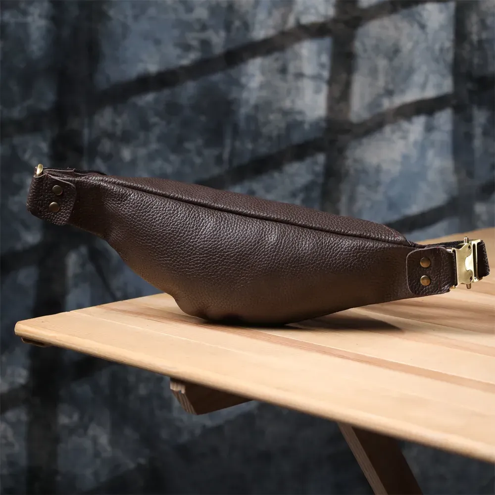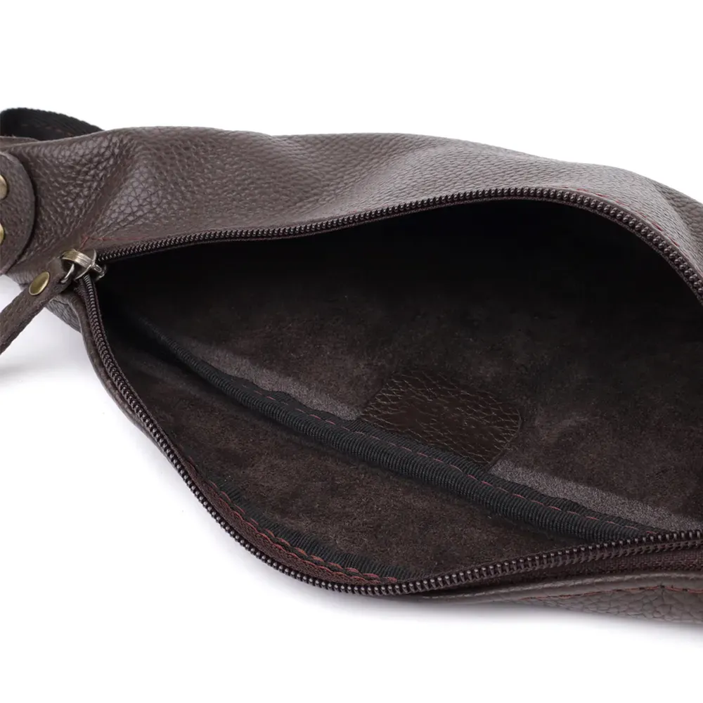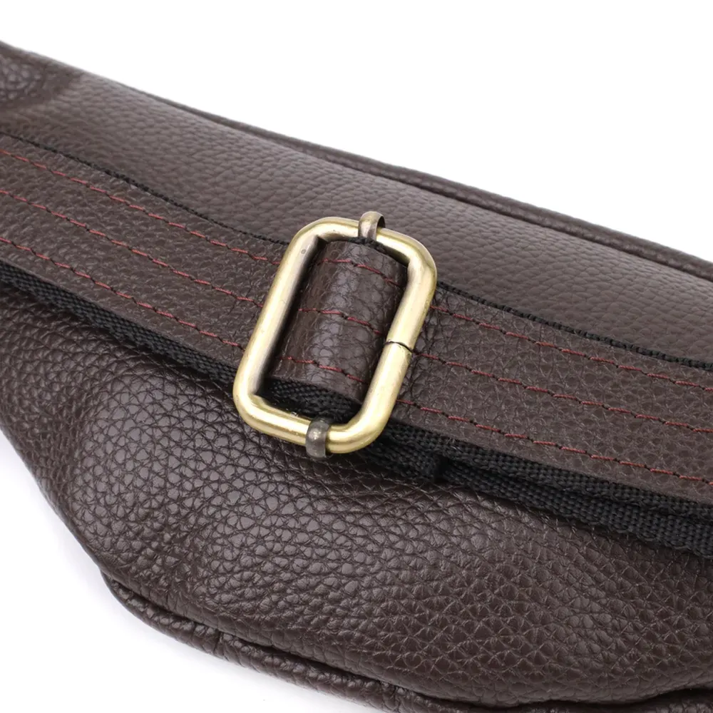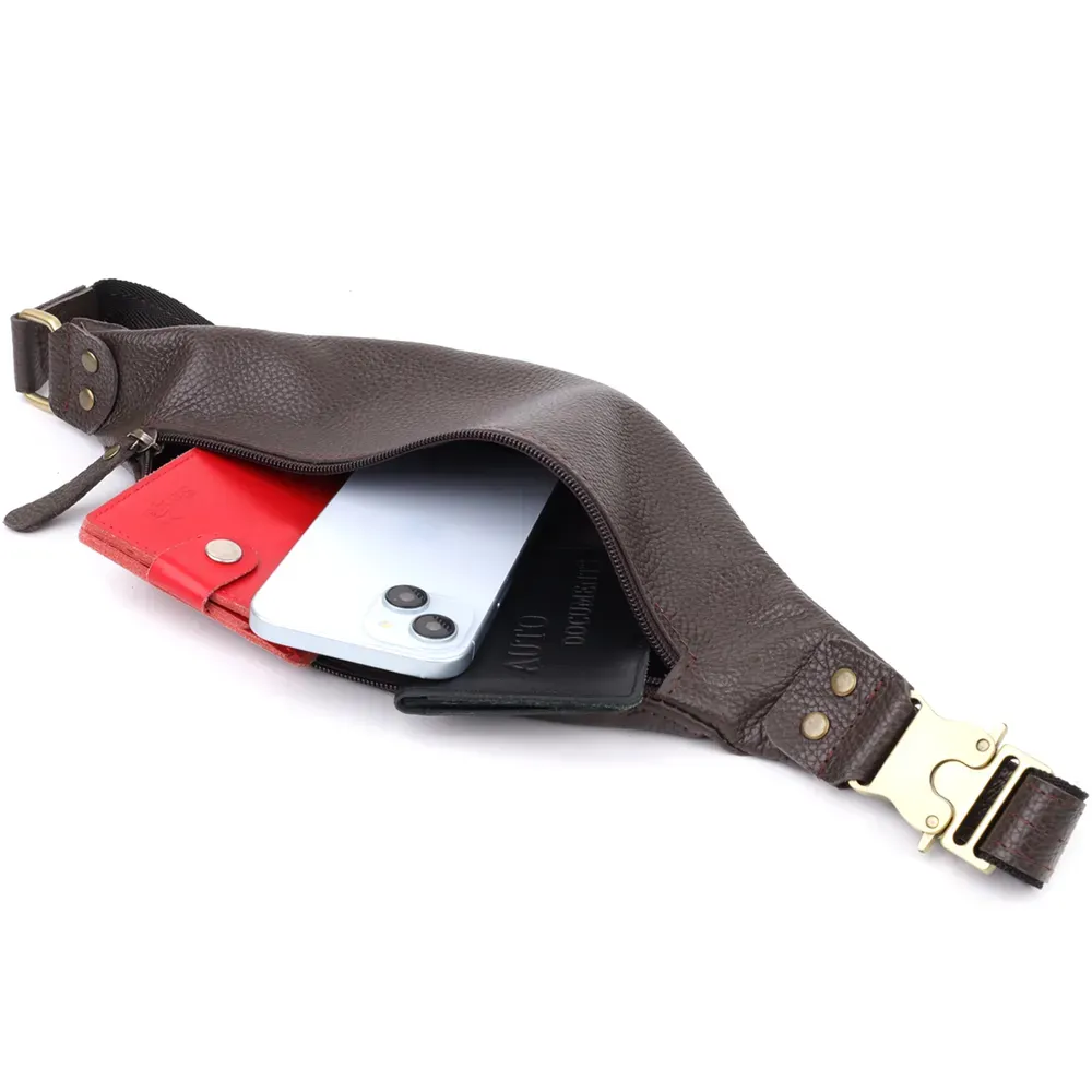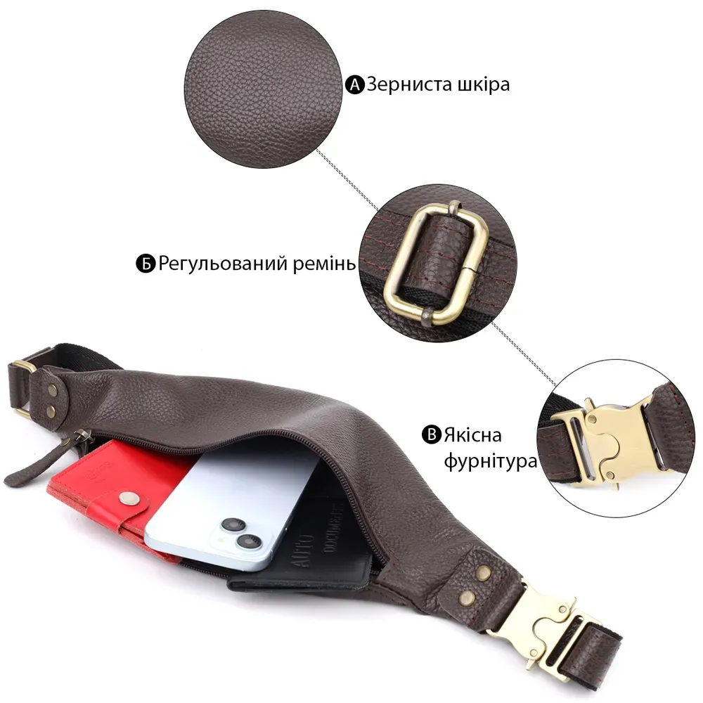 Компактна, але містка: основне відділення на блискавці вміщує документи, смартфон, ключі та гаманець. Регульований ремінь зі шкіри та міцної тканини дозволяє зручно носити аксесуар на поясі або через груди, залишаючи вільними руки.