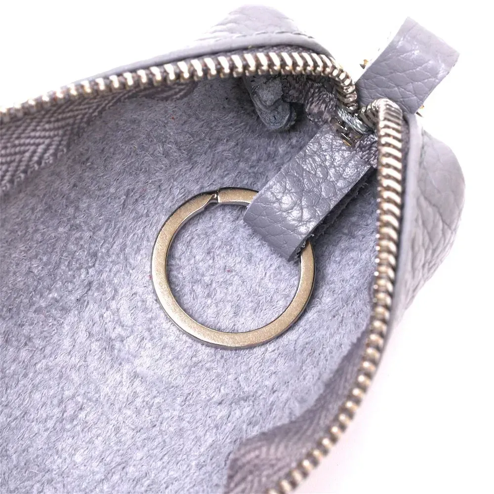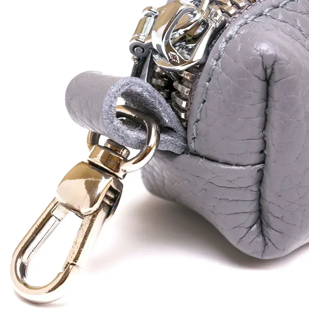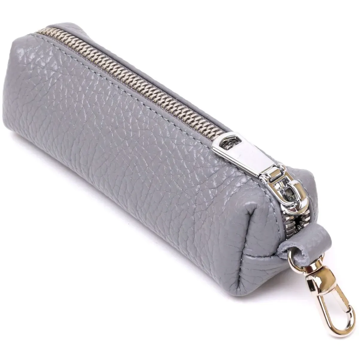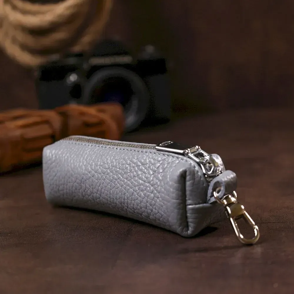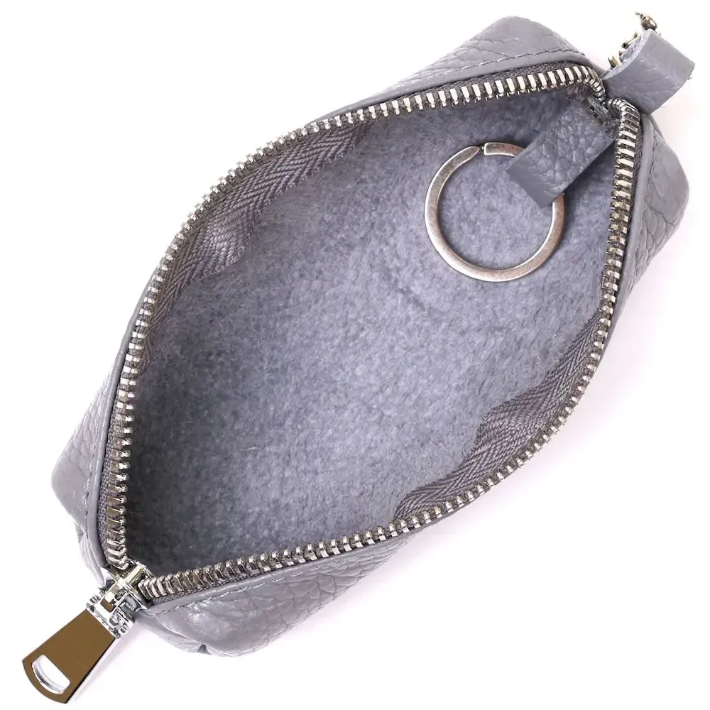 Чудова ключниця в гарному трендовому сірому кольорі. Матеріал виготовлення – натуральна шкіра високої якості із відмінними характеристиками. Закривається аксесуар на блискавку, всередині є металеве кільце для ключів, зовні. карабін. Фактура – зерниста і дуже приємна на дотик.