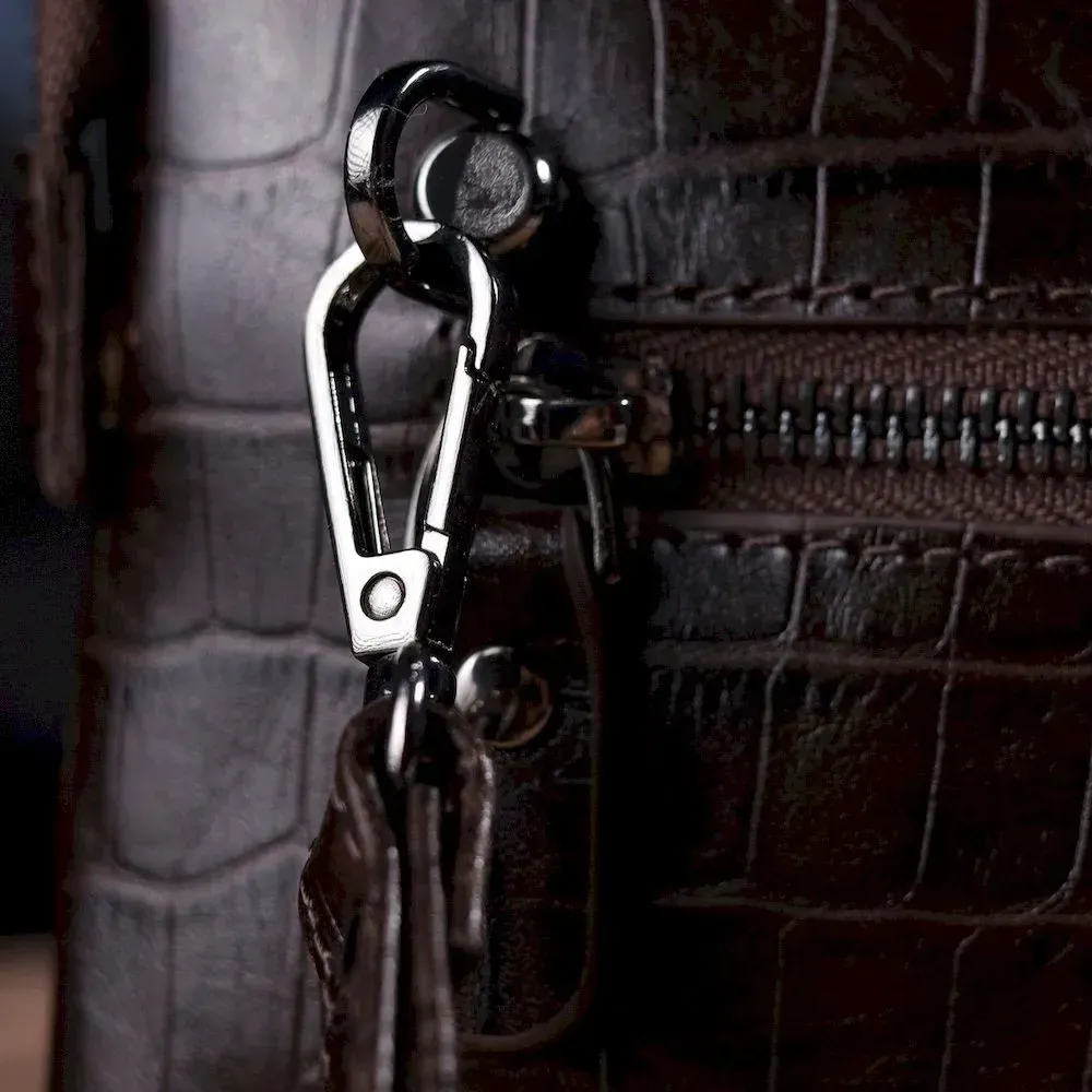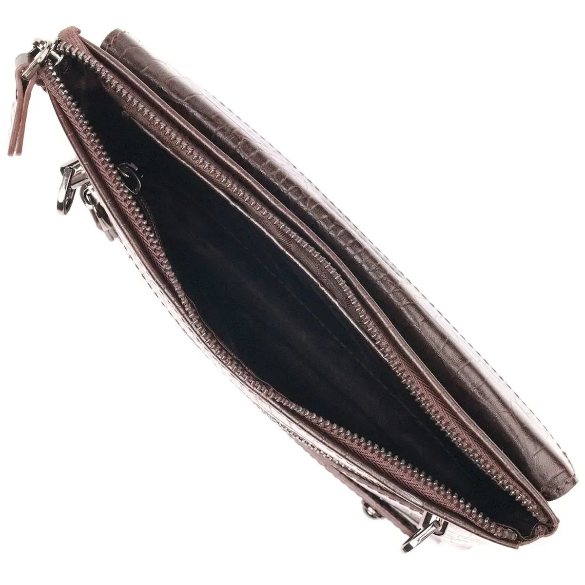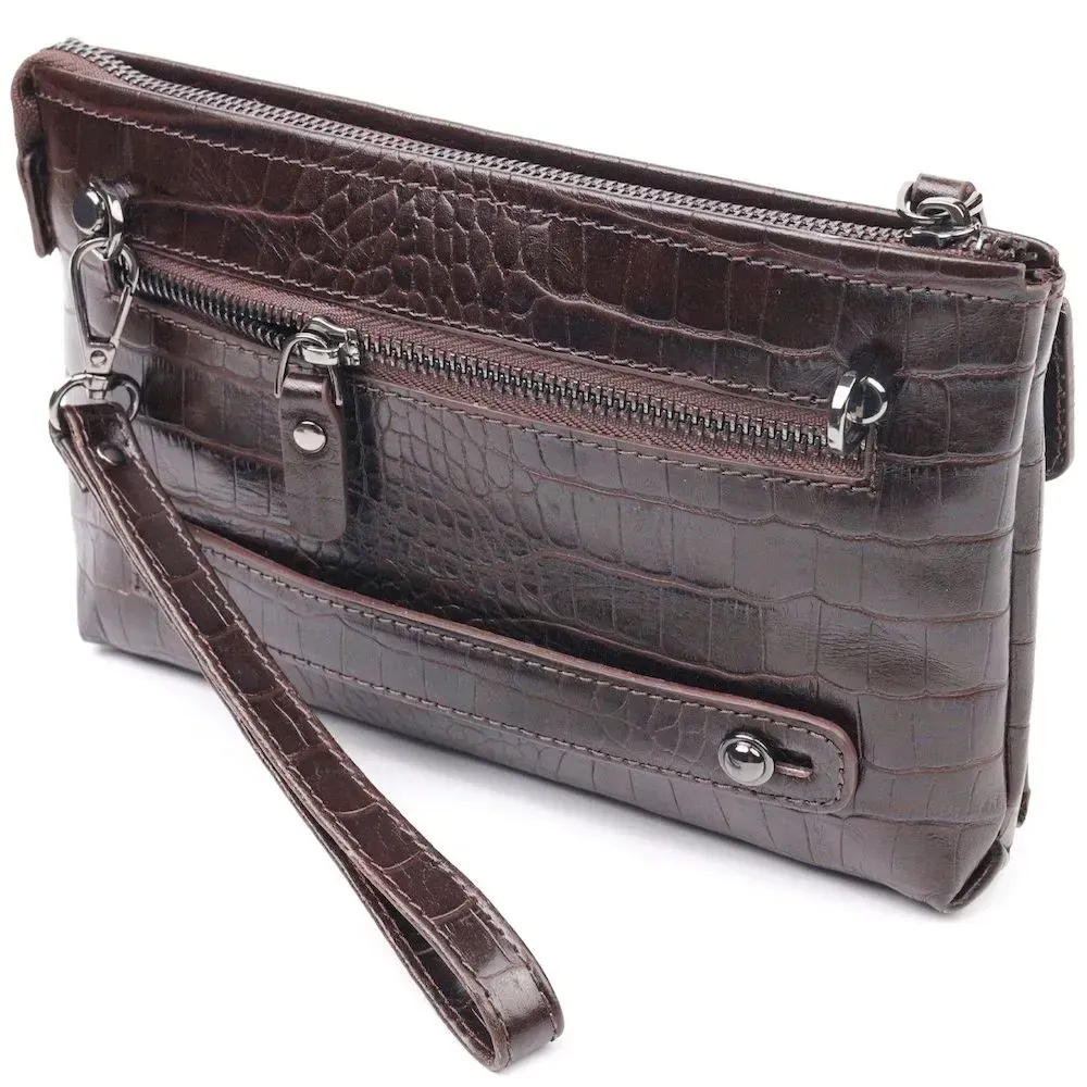 Популярний клатч для чоловіків з натуральної фактурної шкіри з тисненням під крокодила. Аксесуар має одне основне відділення, всередині якого дві бічні кишені, відкритого та закритого типу. Зовні у виробі розташовані дві кишені, одна під клапаном на лицьовій стороні, інша на блискавці, на тильній стороні. Внизу аксесуара є ремінець для носіння на руці, що дуже зручно у використанні, також є знімний кистьовий ремінь та знімний плечовий ремінь. Чим зручний клатч - у нього Ви можете покласти все необхідне і все буде під рукою.
