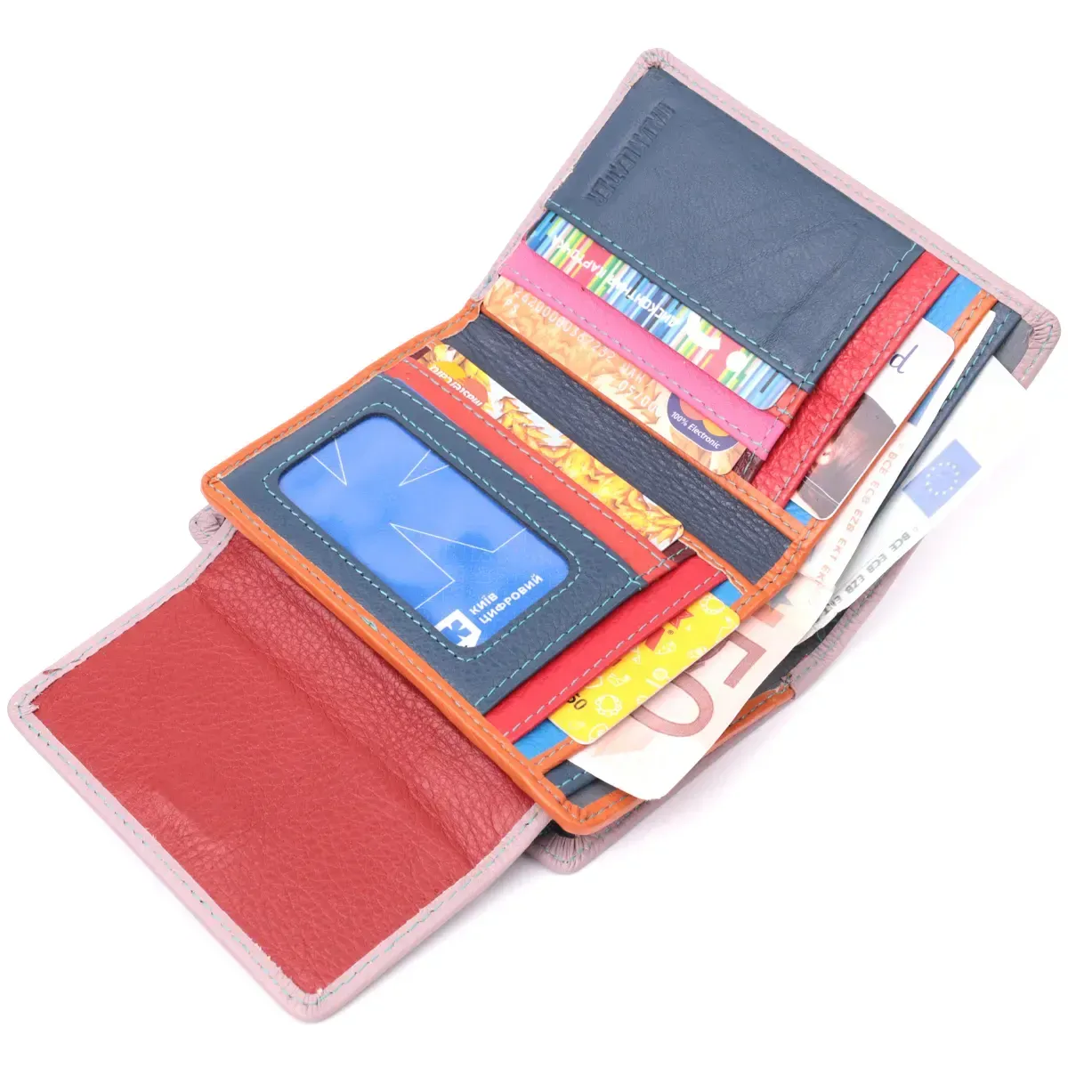 - закривається клапаном на магніт. Аксесуар виконаний з якісної натуральної шкіри, яка чудово носиться і не втрачає свого первісного вигляду з роками. Відмінна особливість цієї моделі в яскравому внутрішньому забарвленні. Усередині є два відділення для купюр, дев'ять слотів для пластикових карток, дві приховані кишені та одна монетниця, що закривається на блискавку. Ідеальний аксесуар для любительок гаманців середнього розміру та практичного функціоналу.