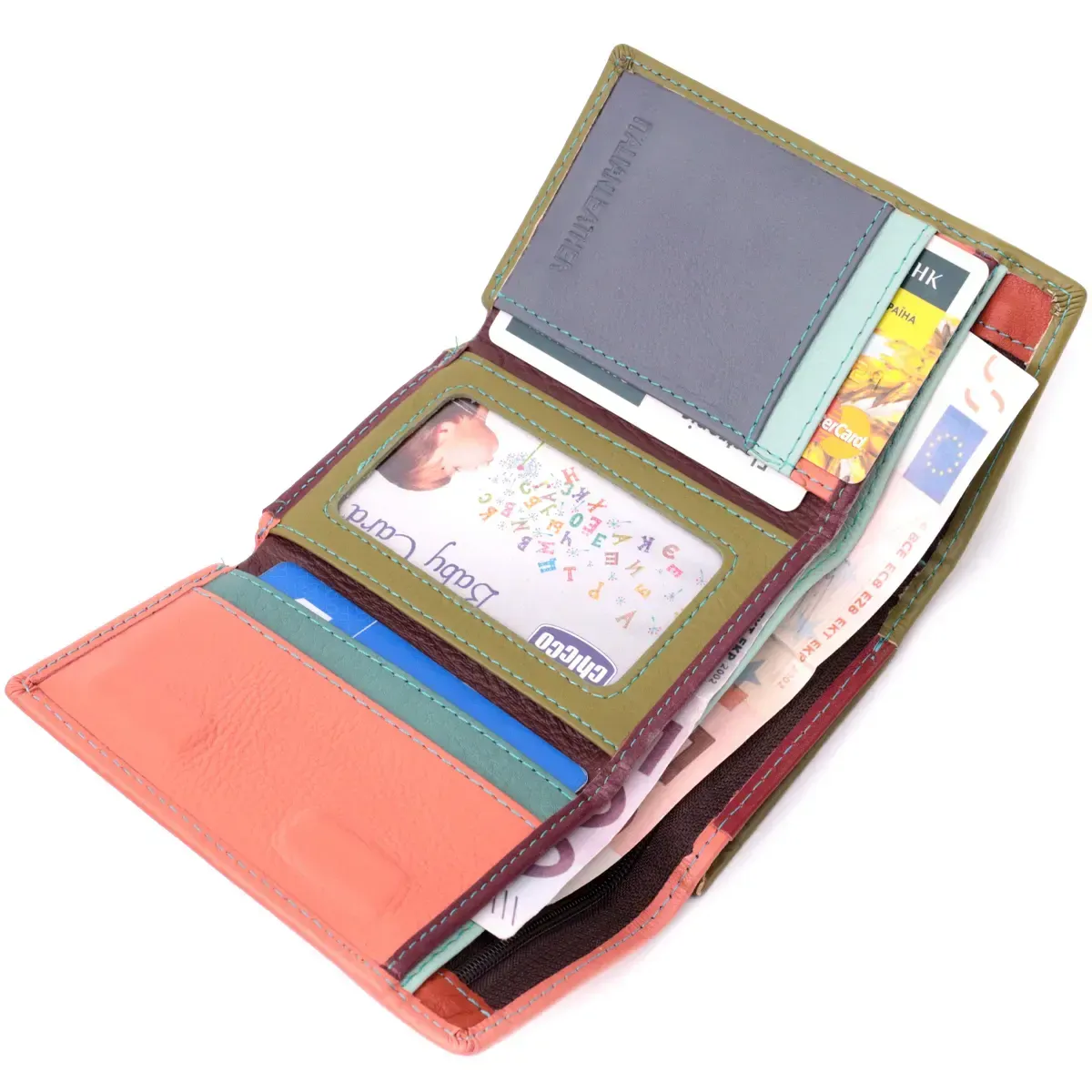 Ідеальне жіноче портмоне в три складення з натуральної шкіри найвищої якості. Перше, що впадає в око це колірне рішення, замість однотонного аксесуара ми маємо різнокольоровий, який містить два основні зовнішні кольори і кілька додаткових всередині. Шкіряне портмоне дуже практичне і служить досить довго. Аксесуар складається з двох містких кишень для купюр, кишені на блискавці через всю довжину, п'яти осередків для карт, прозорого віконця для пропуску та зовнішньої кишені на блискавці з перегородкою, що чудово прослужить для монет. Портмоне доповнено надійною фурнітурою. Укомплектований гаманець у фірмову картонну коробку білого кольору.