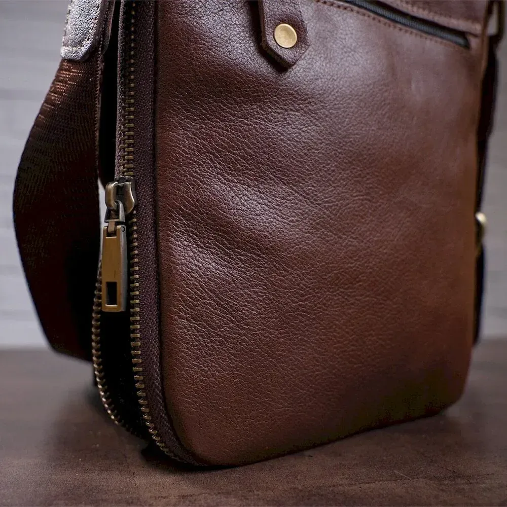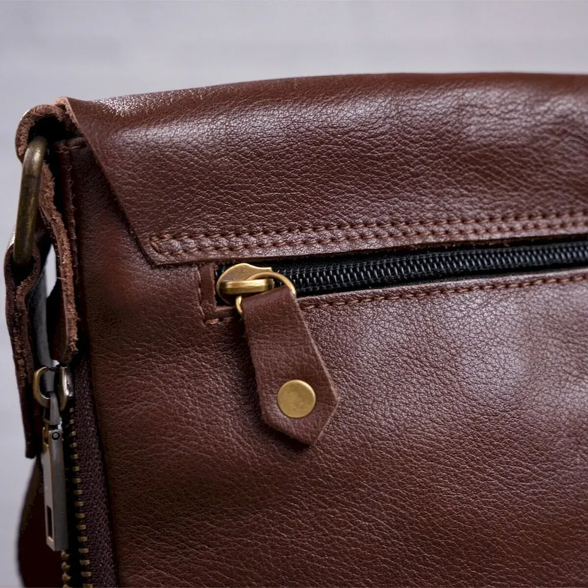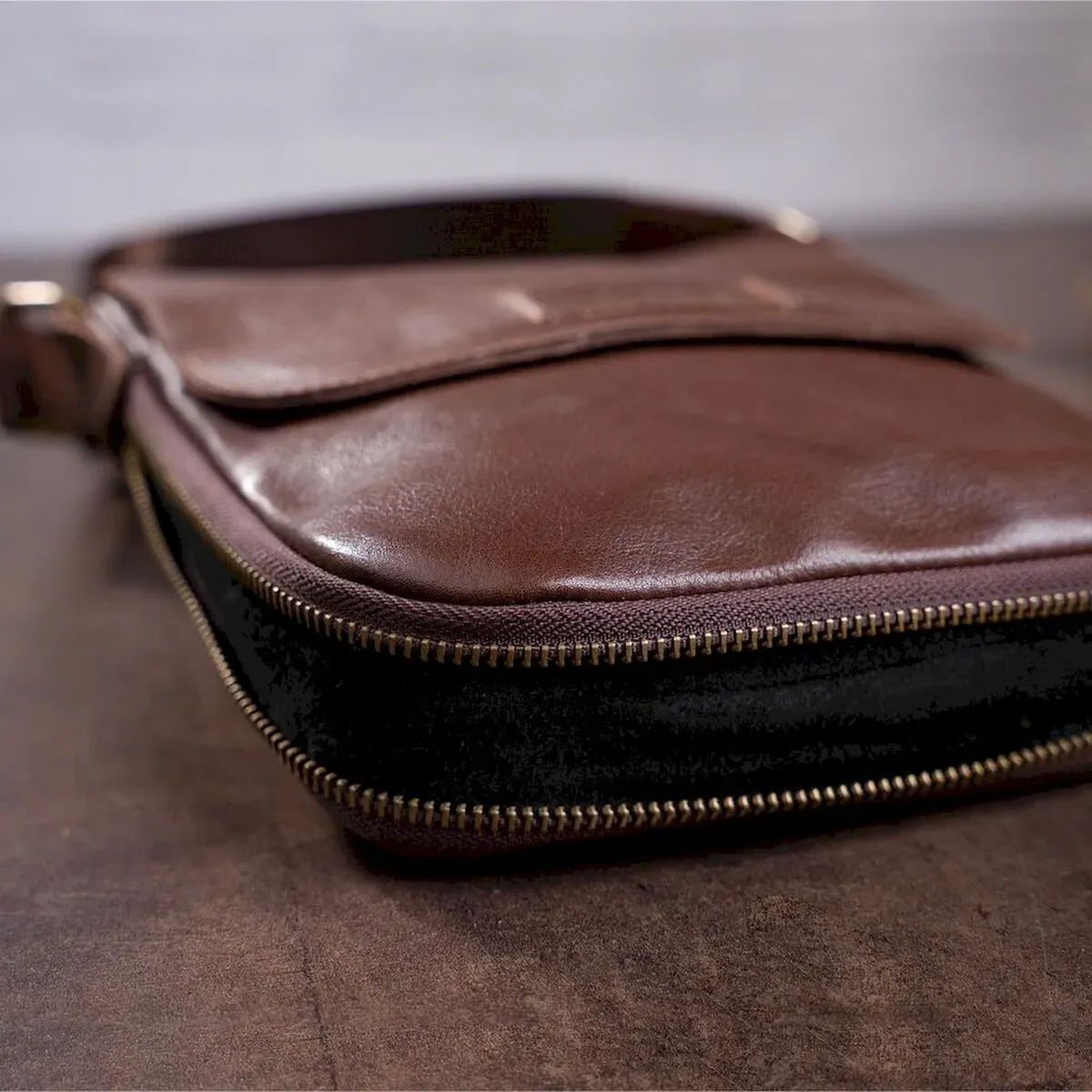Тонка чоловіча шкіряна сумка планшетка. Виріб закривається на клапан із двома магнітами та блискавку. Сумка має ідеальний розмір кожного дня. Її класичний дизайн підійде як до ділового, так і до повсякденного стилю. Всі ваші речі будуть у безпеці, так як сумка має дві застібки клапан та блискавку. Модель доповнена міцною фурнітурою кольору латуні. Також особливістю моделі є те, що ви можете самостійно налаштувати її наповненість. Просто при необхідності розстебніть блискавку. Ви можете бути певні, що це натуральна шкіра. Сумка стане чудовим подарунком для будь-якого чоловіка.
