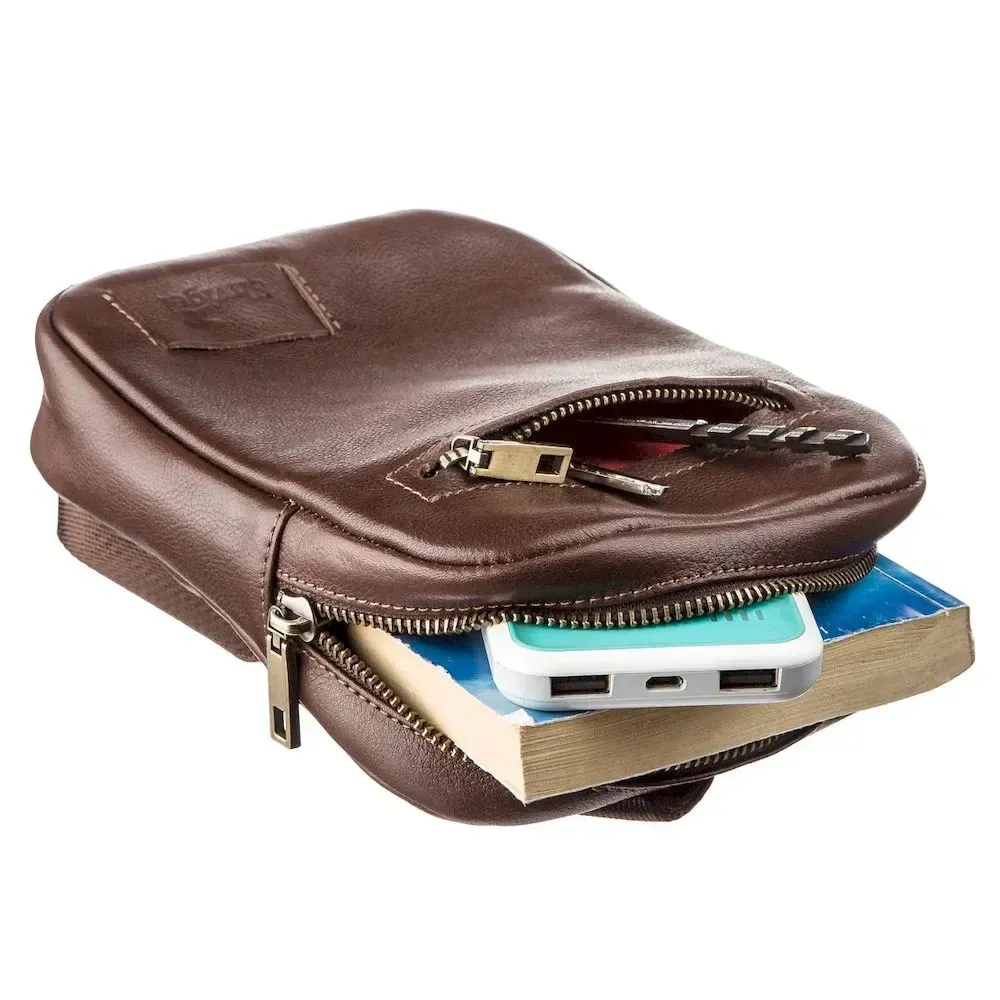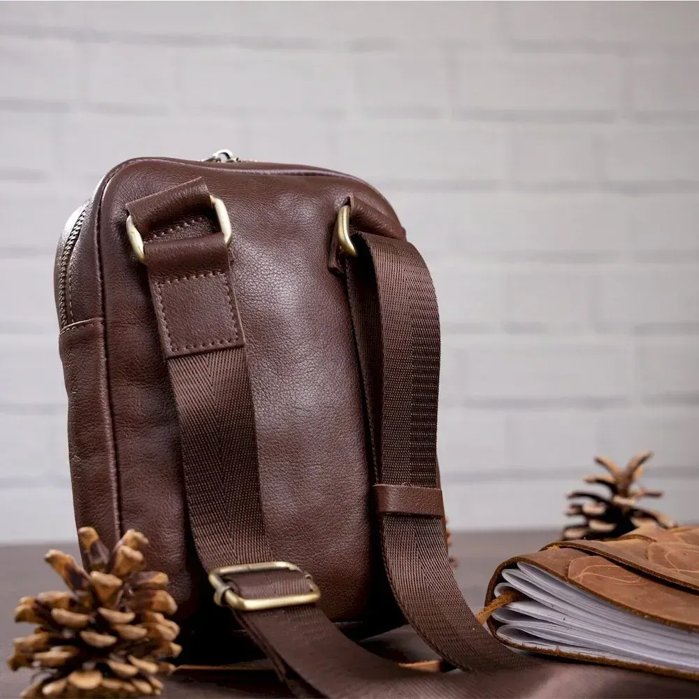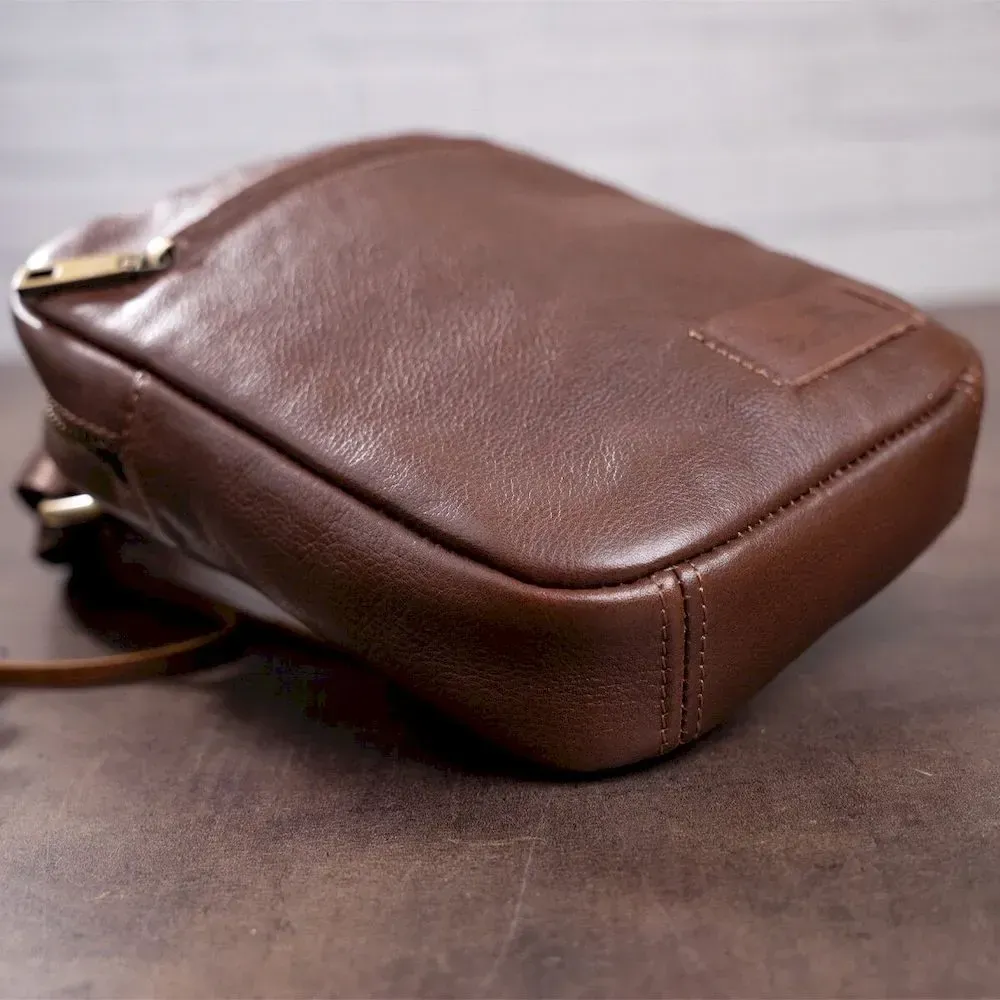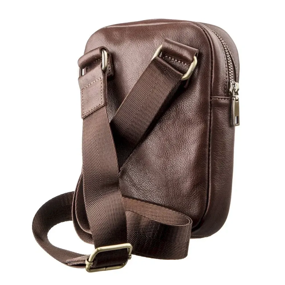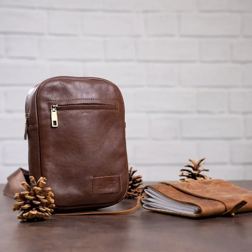 Маленька та компактна сумка на кожен день. Шкіряна сумка з мінімальним дизайном для чоловіків, які цінують мінімалізм та якість. Модель виконана з натуральної шкіри найвищої якості. На лицьовій стороні тиснений логотип бренду з коричневим рядком. Червона текстильна підкладка усередині сумки додає оригінальності моделі. Сумка має незнімний текстильний ремінець коричневого кольору.