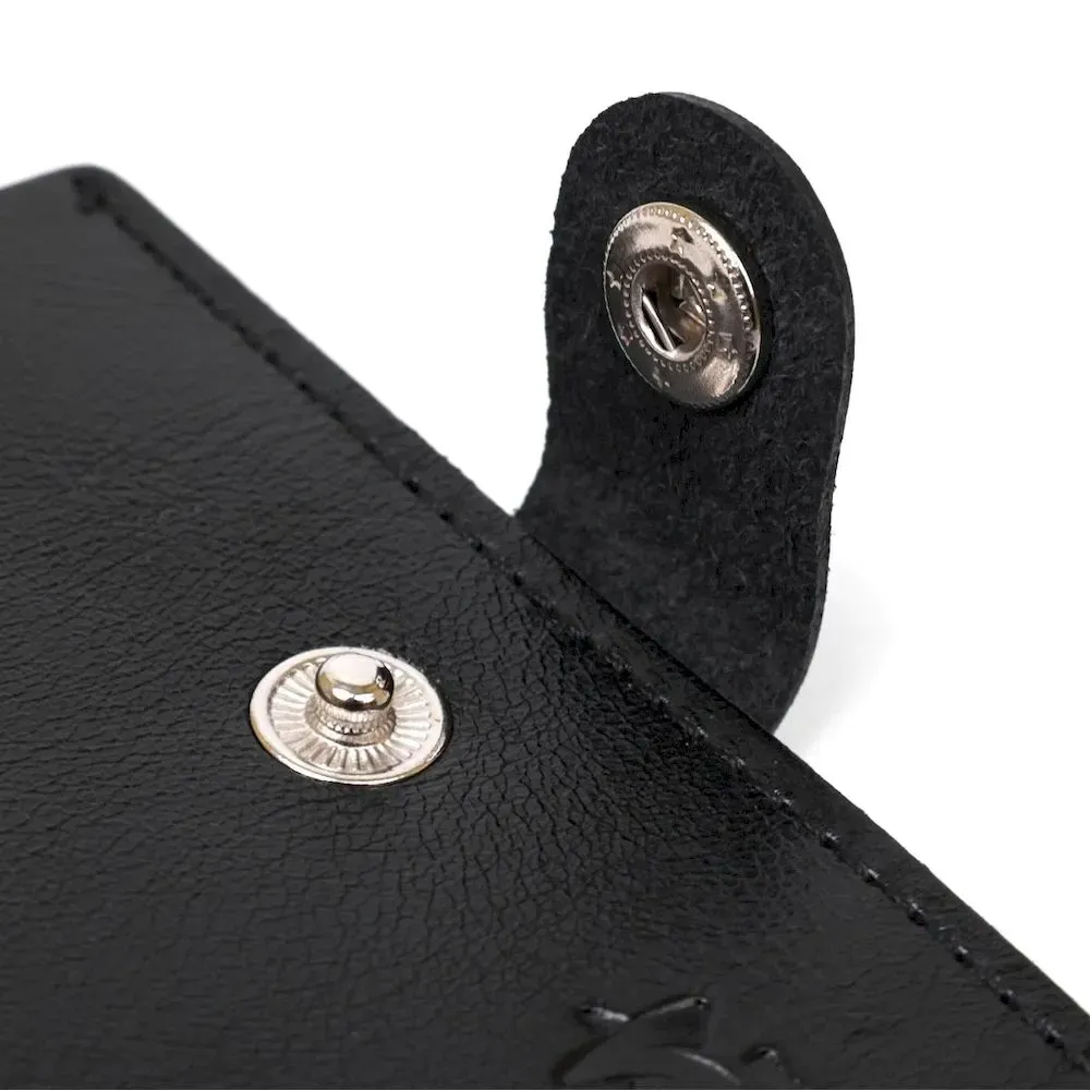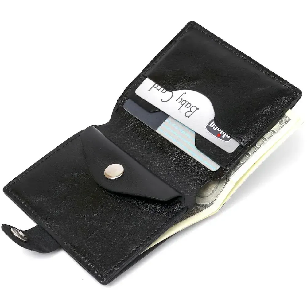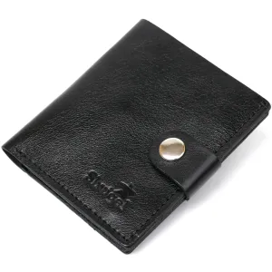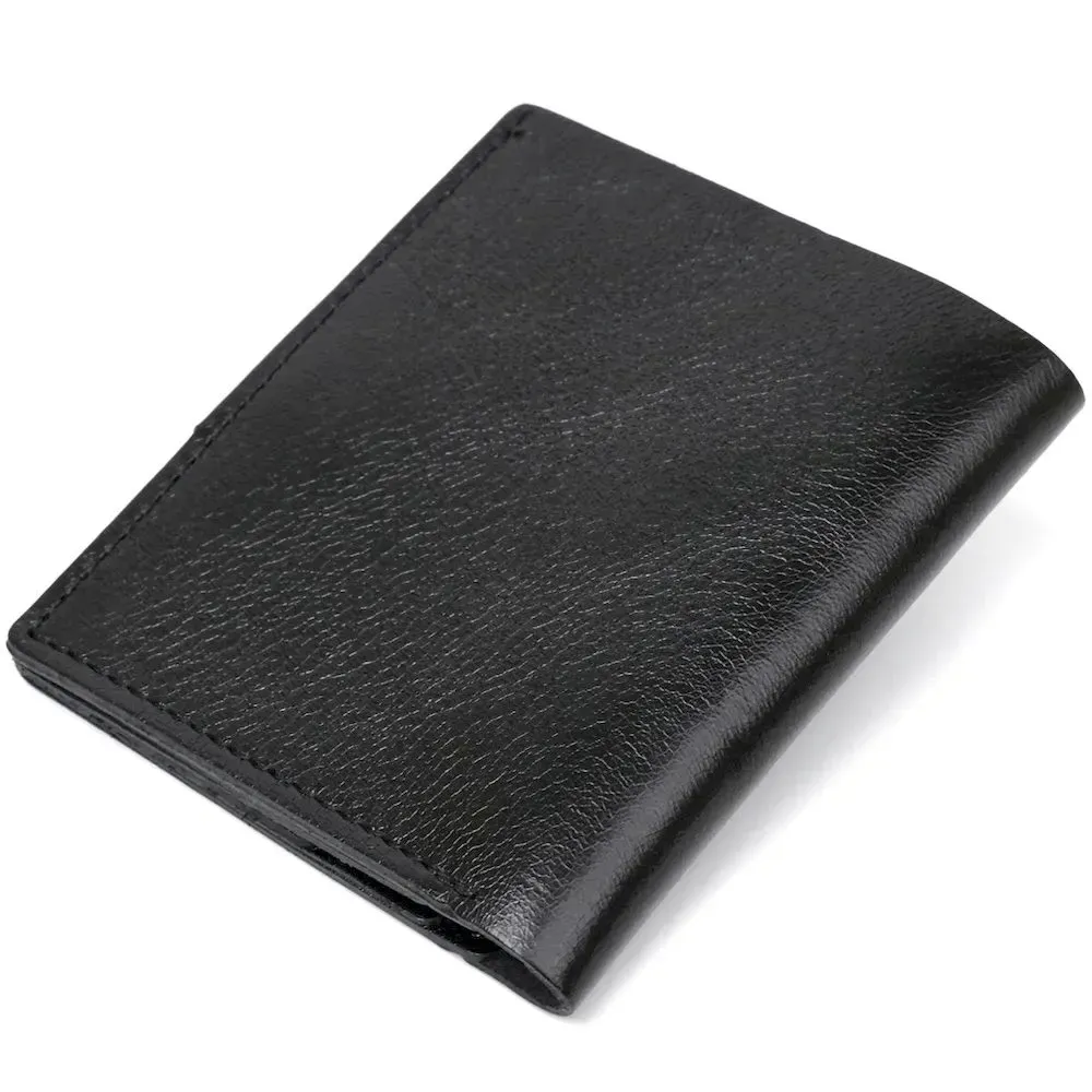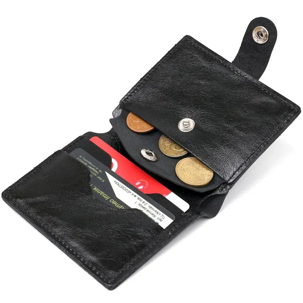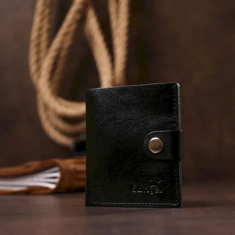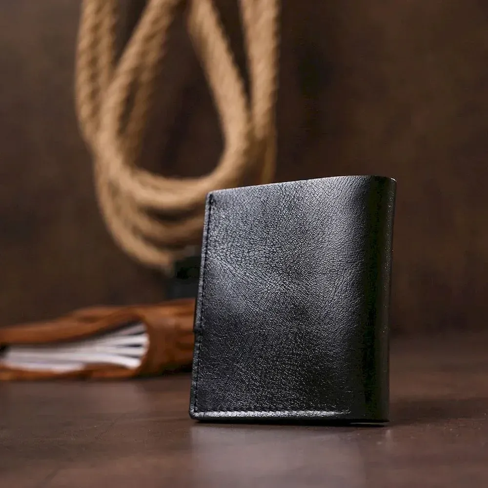 Класичний чоловічий портмоне в універсальному чорному кольорі, який легко поміститься в сумці будь-якого розміру або в кишені. Виконано виріб з натуральної шкіри високого класу та покращеної міцності. Усередині є відділення для купюр, слоти для кредитних та візитних карток та невелика монетниця на кнопці. Фактура – гладка з легким відливом.