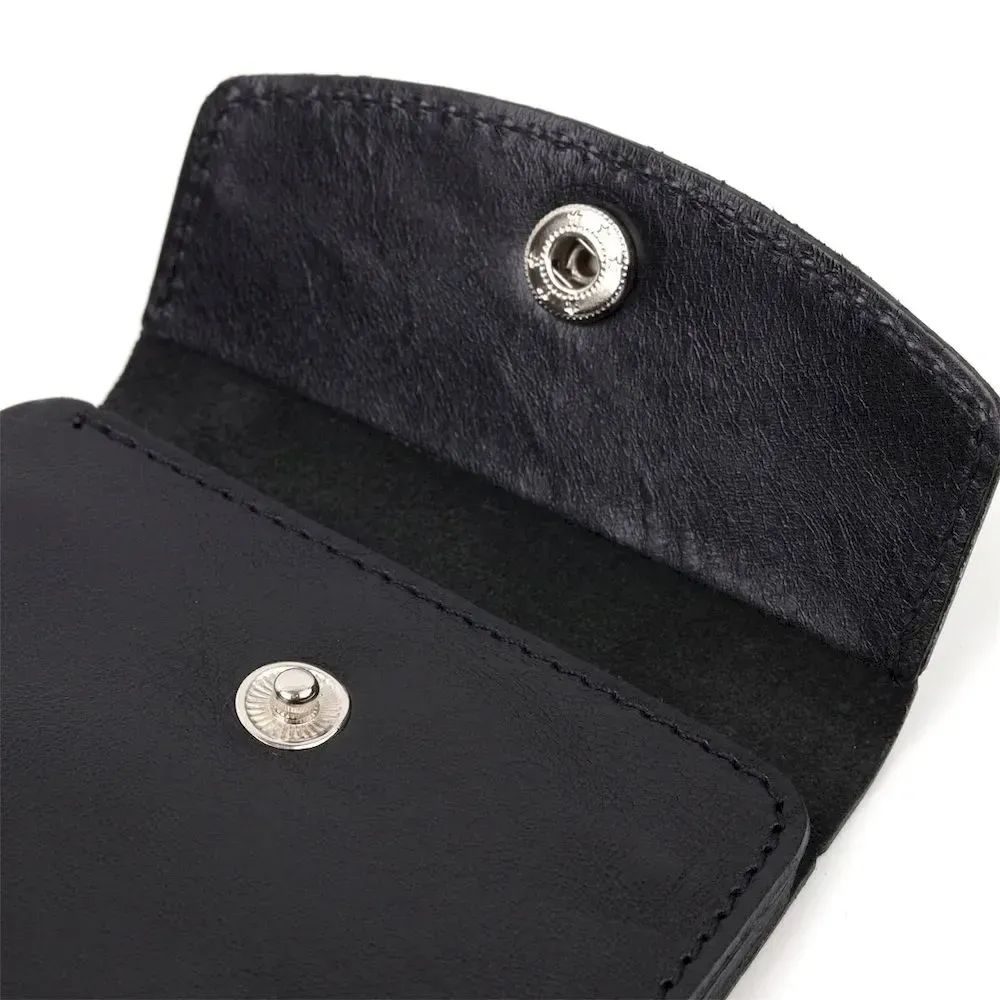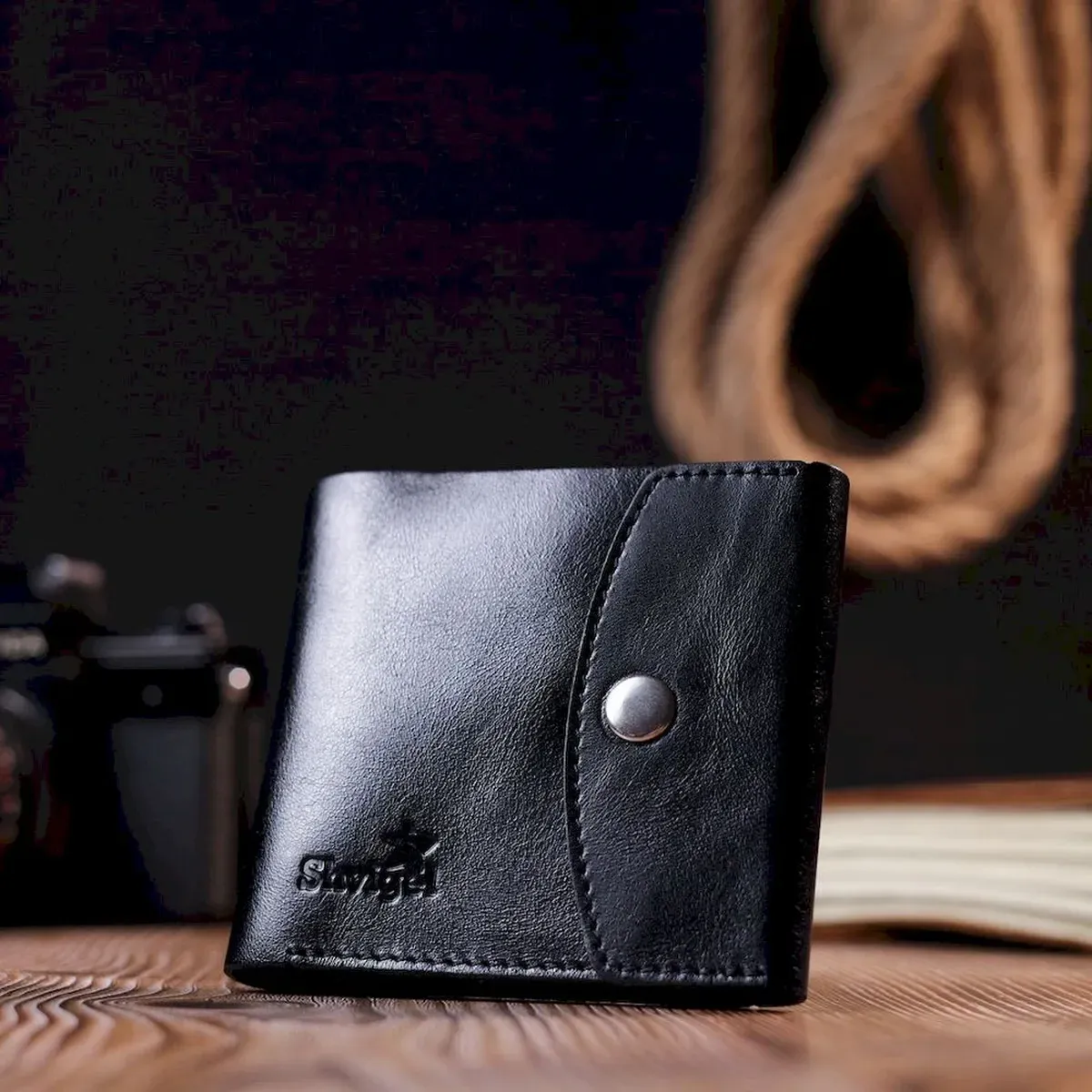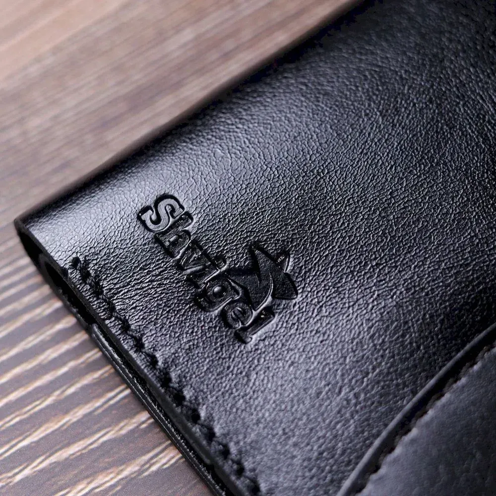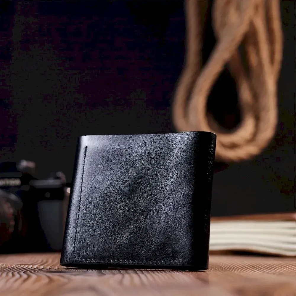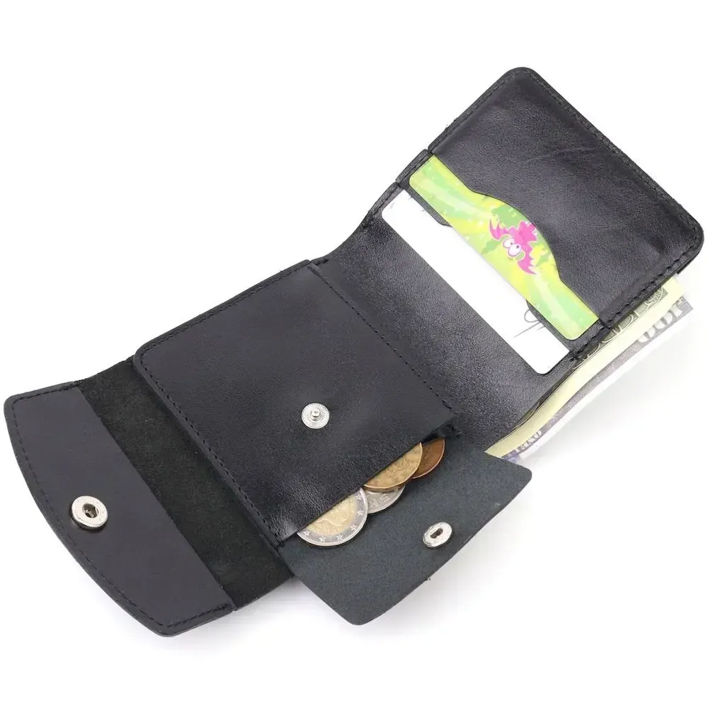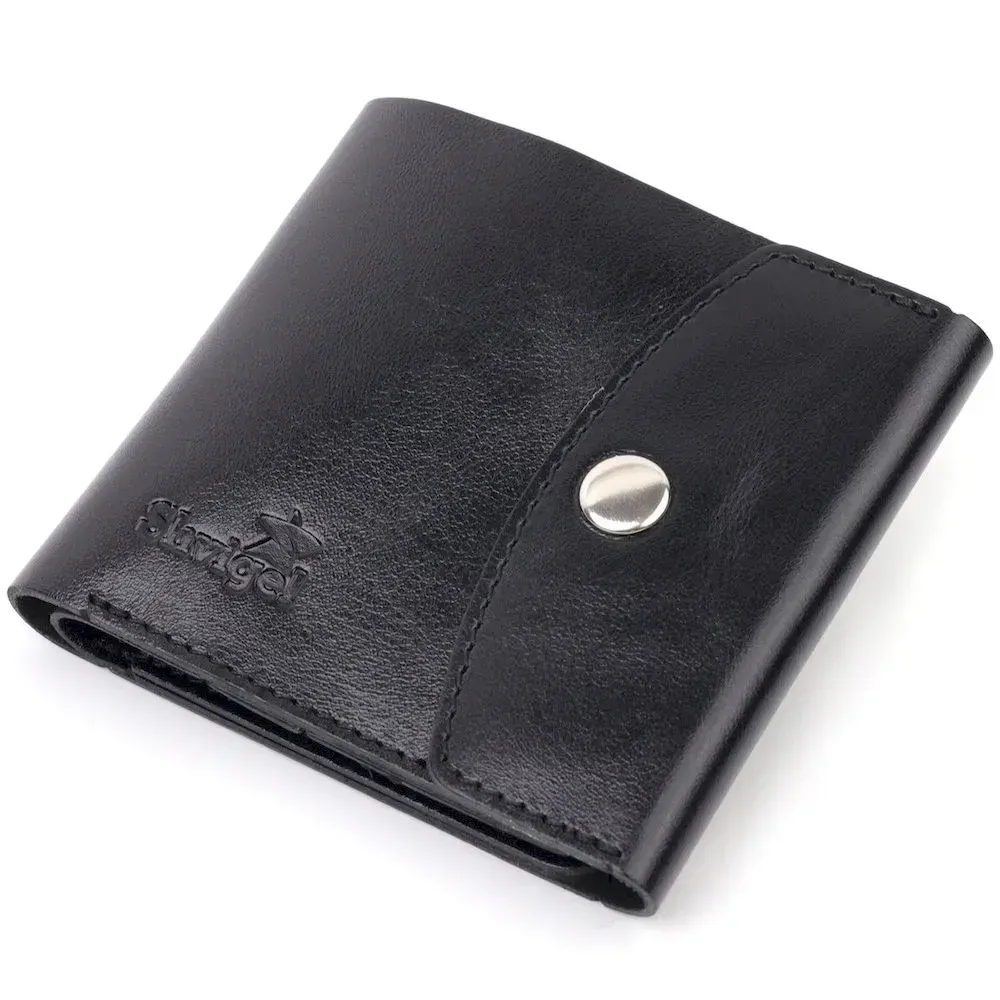 Компактний гаманець чорного кольору, маленького розміру, який легко поміститься навіть у найменшу сумку. Аксесуар не займе багато місця та не має зайвої ваги. Закривається гаманець хлястиком із кнопкою. Зовні та всередині виріб виготовлено з натуральної глянсової шкіри. На лицьовій стороні гаманець прикрашений тисненим логотипом Shvigel. Добротна натуральна шкіра прослужить Вам дуже довго.