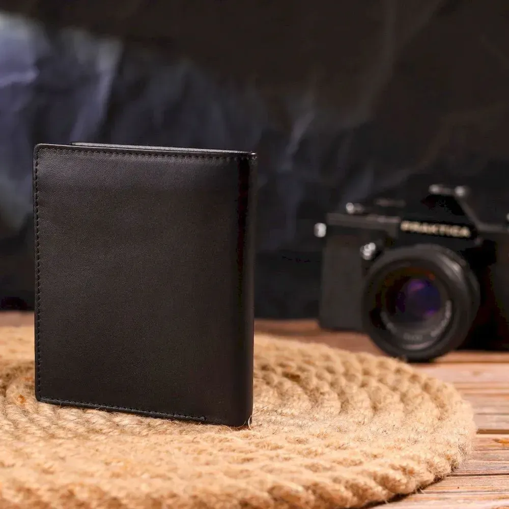Надійне чоловіче портмоне, з натуральної гладкої шкіри, в класичному чорному кольорі. Аксесуар має одне основне відділення, з перегородкою, в яке поміщаються купюри всіх номіналів, три відсіки для карток, монетницю на блискавці з розширювачем, дві прилеглі кишені. На зовнішній стороні металевий логотип виробника. Колір фурнітури – срібло. Шкіряний гаманець є справді потрібним практичним подарунком.
