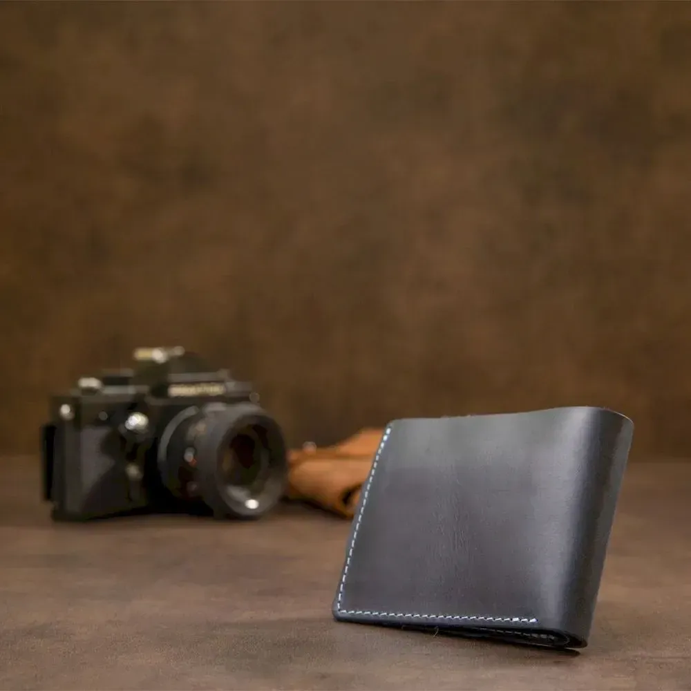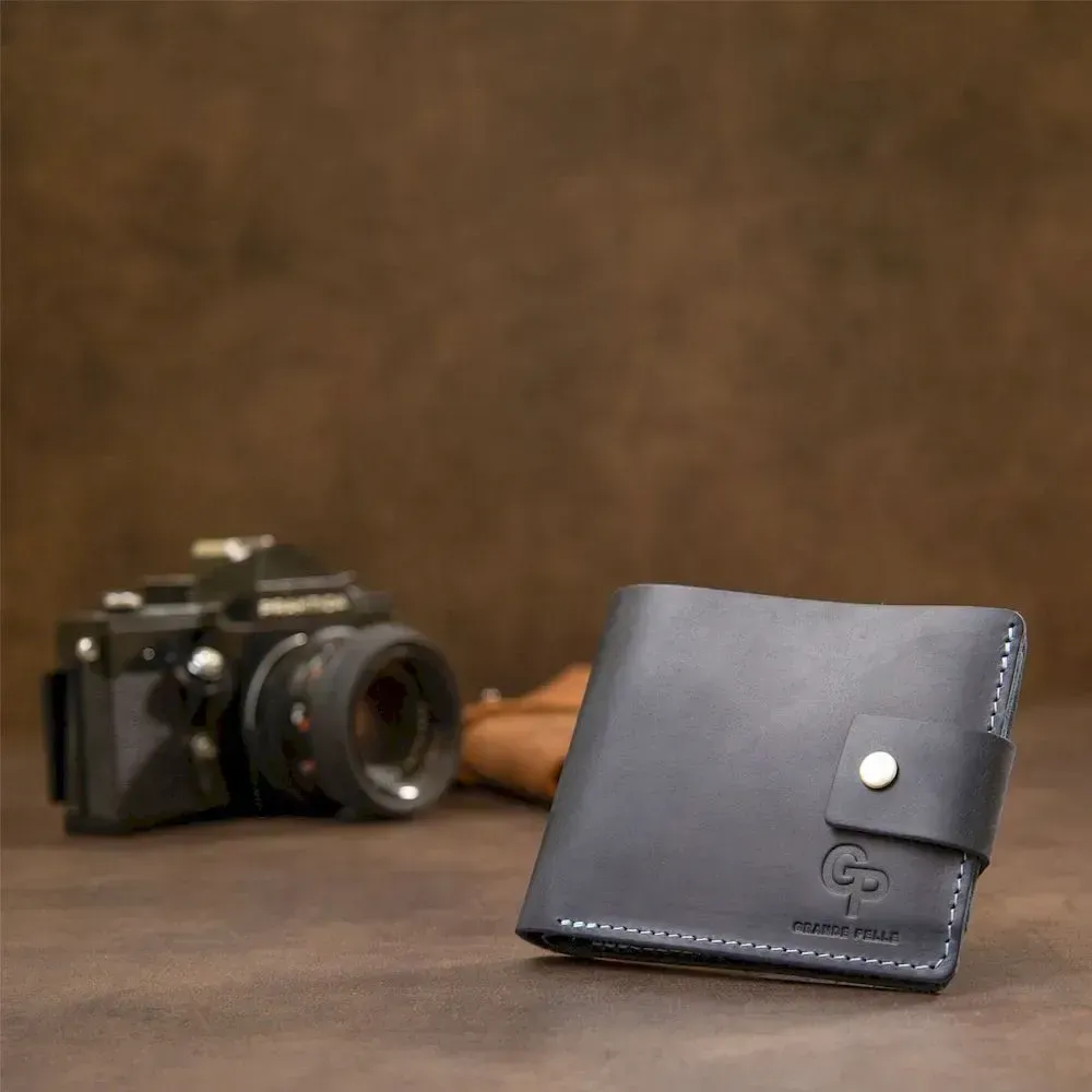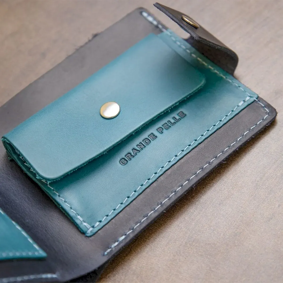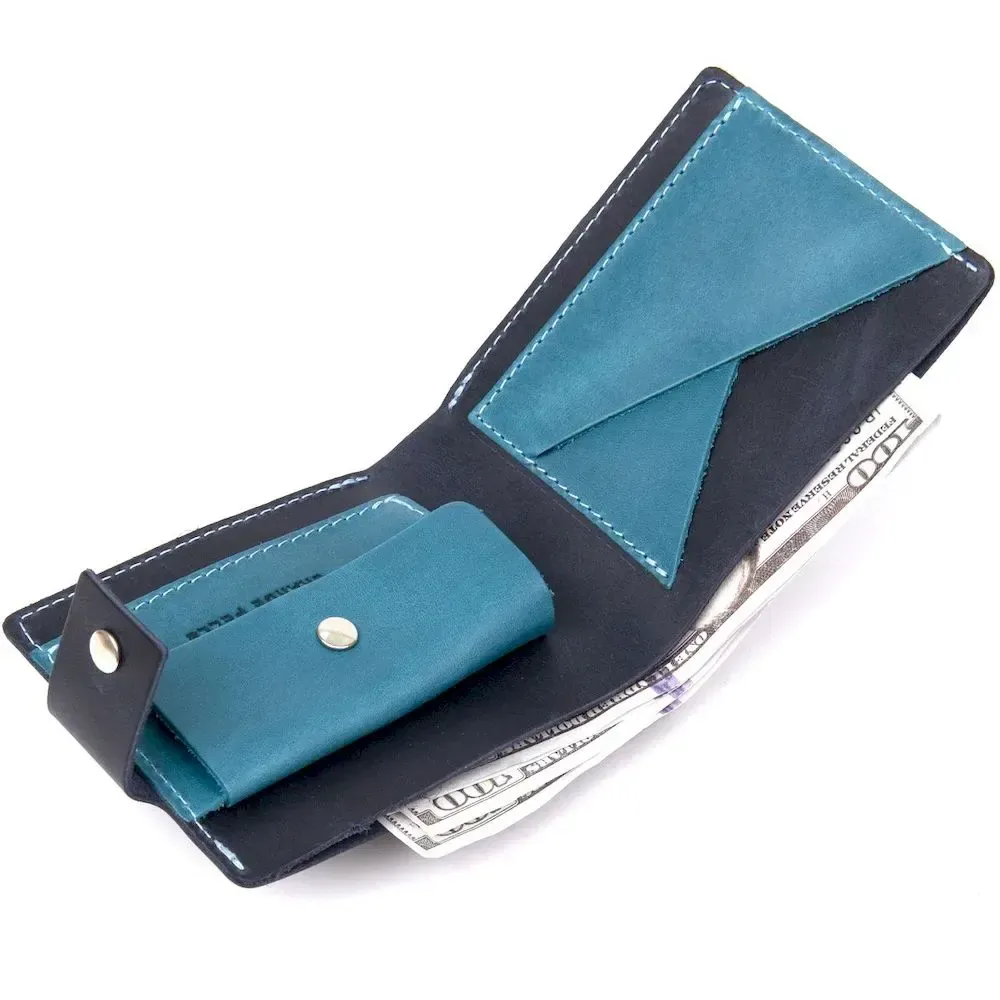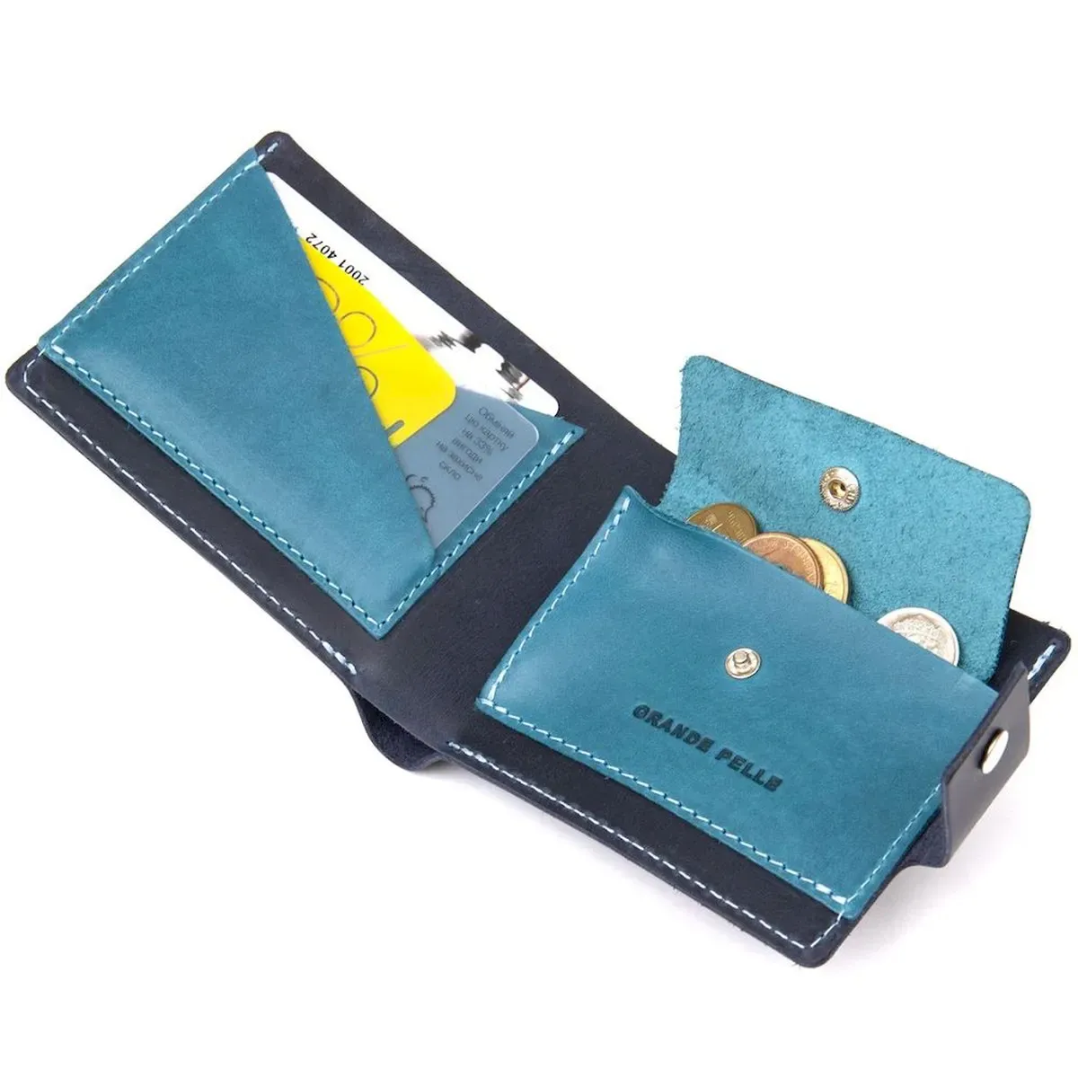 Чудове невелике портмоне з високоякісної шкіри в матовій фактурі. Колір гаманця темно-синій, усередині кишеньки мають блакитний колір, що відтіняє. Закривається портмоне на надійну кнопку на хлястиці. Монетниця також на кнопці. Цей аксесуар стане чудовим подарунком близькій людині.