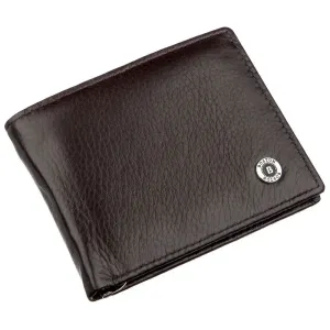 Невеликий чоловічий портмоне з натуральної шкіри високої якості. Виконаний у розкішному та насиченому коричневому кольорі, що надає йому особливого шарму. Гаманець відрізняється красивим та продуманим до дрібниць дизайном. У ньому Ви знайде відділення для всіх Ваших необхідних на кожен день цінностей, у тому числі Вас порадує містка монетниця на кнопці. Закривається портмоне за допомогою зручного та практичного магніту, який сприяє швидкому доступу до гаманця. Запаковано цей портмоне в тверду білу коробку з фірмовим логотипом.