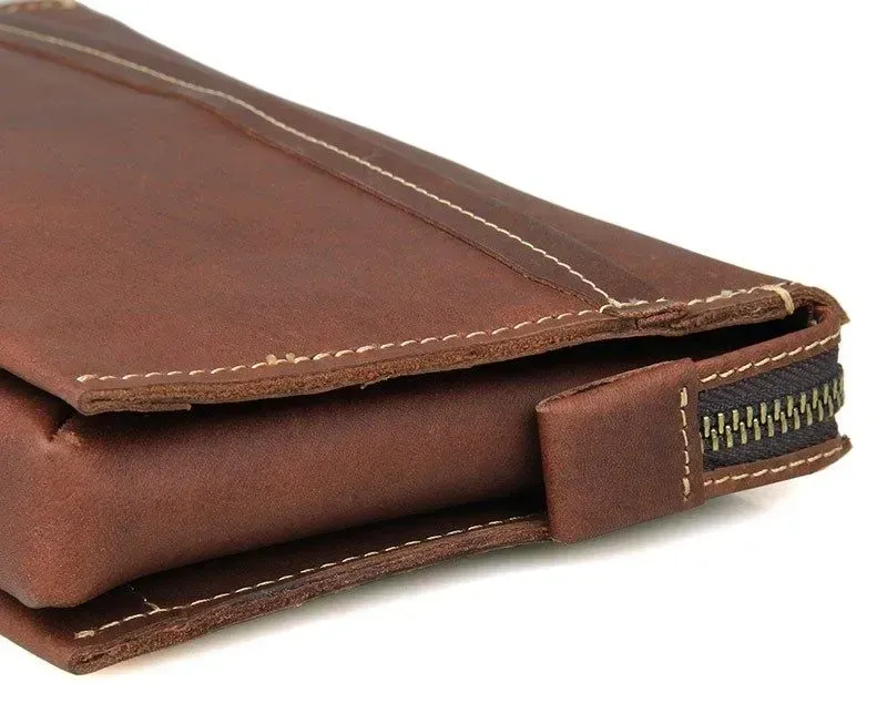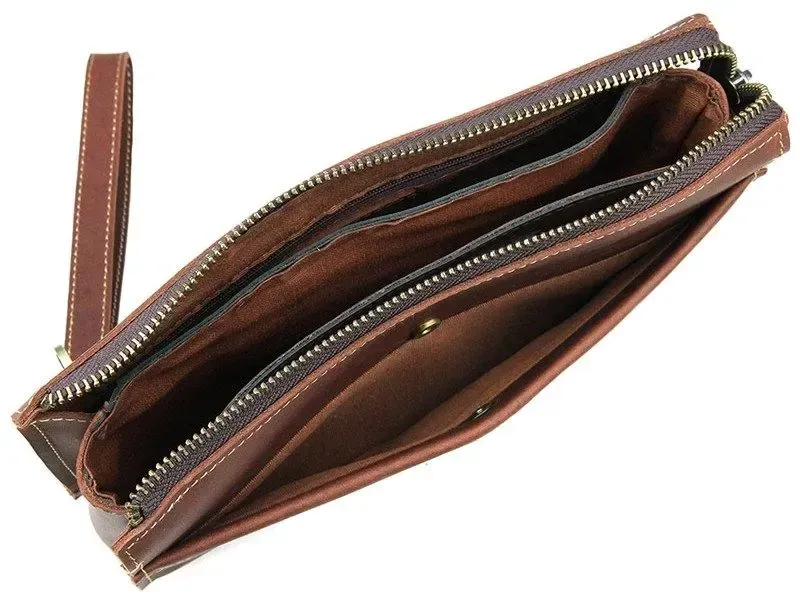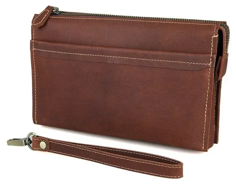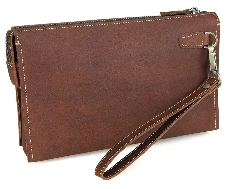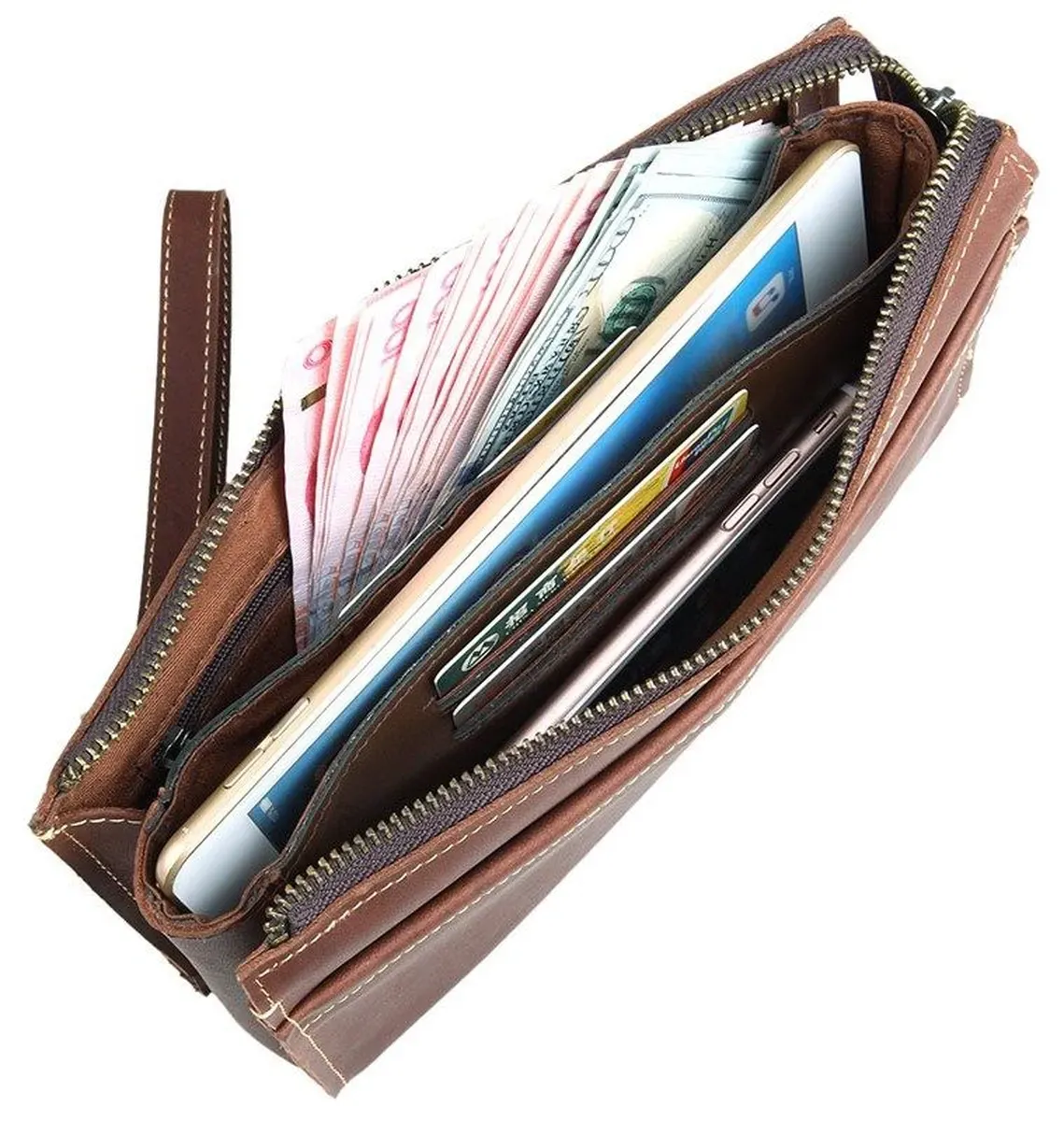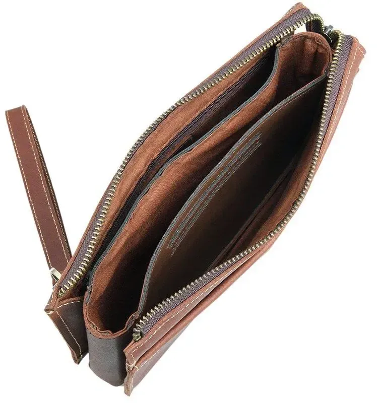 Містка чоловіча шкіряна барсетка-клатч. Колір фурнітури латунь. Аксесуар можна переносити в руці або на зап'ястя (в комплекті ремінь-петля, що знімається). Виріб акуратно прошито міцною ниткою. Підкладка виконана із міцного текстильного матеріалу коричневого кольору. Внутрішні перегородки виконані зі шкірозамінника. Клатч упакований у текстильний чохол пилу. strong>Всередині: