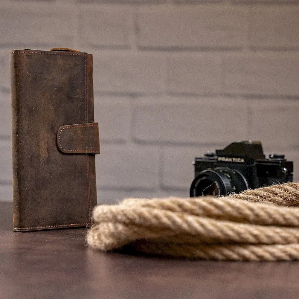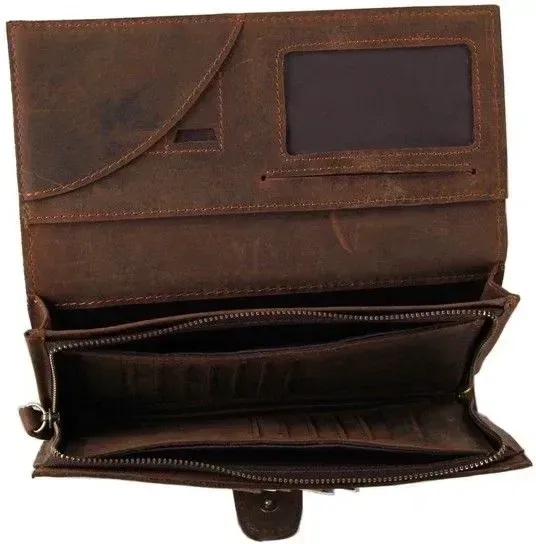 Клатч відшитий зі 100% натуральної   ;вінтажної шкіри, з використанням дорогого текстилю (внутрішні елементи), якісної нитки та фурнітури кольору золота.