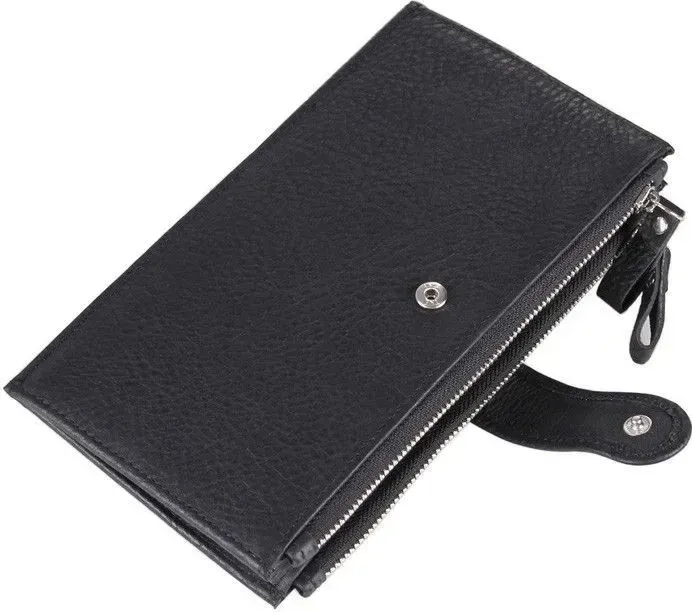 Закривається за допомогою хлястика на кнопці, при відкритті його на верхніх гранях розміщено два відділення на блискавці. Їх можна використовувати для купюр і габаритного смартфона до 5,5 дюймів (потрібно врахувати габарити корпусу). місце під плівкою;