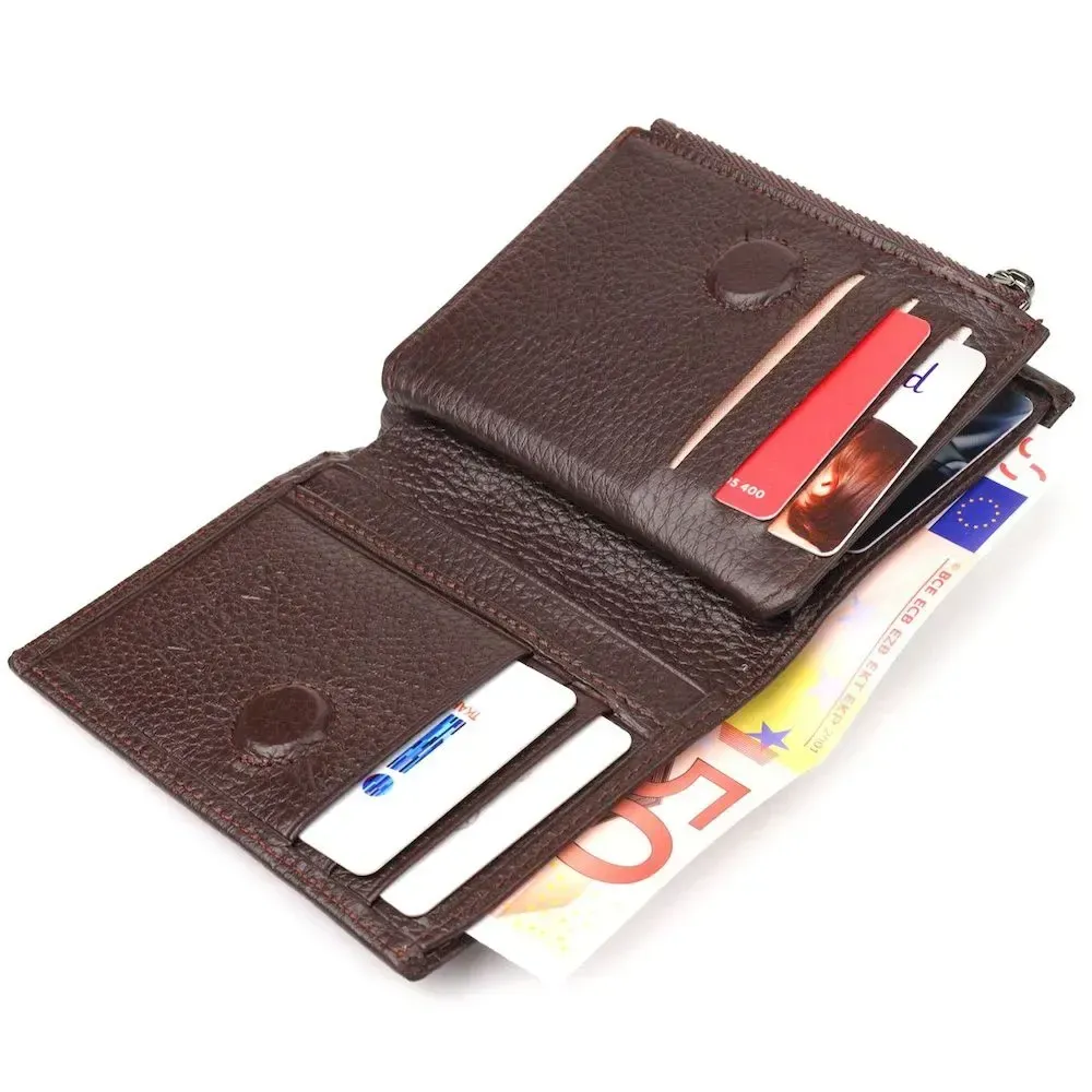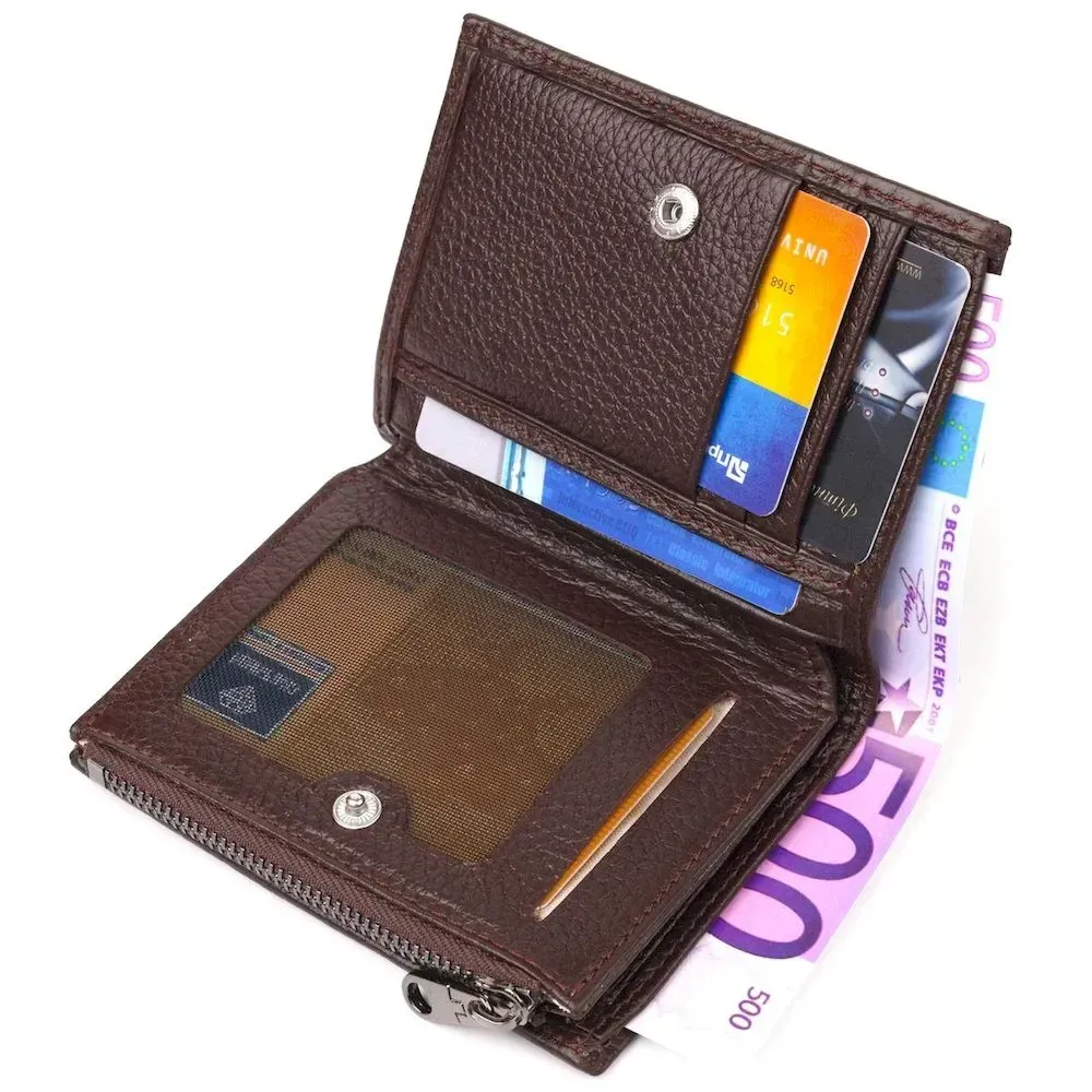 Невеликий чоловічий гаманець компактного розміру з натуральної шкіри. Аксесуар має відділення для купюр, монетницю, що закривається на блискавку, дві приховані кишені та десять осередків для карток, одна під сіточкою. Закривається аксесуар у дві додавання на кнопку. Якісний шкіряний аксесуар завжди вважався показником смаку та достатку, саме такі вироби представлені у нашому магазині, у нас кожен знайде щось для себе.