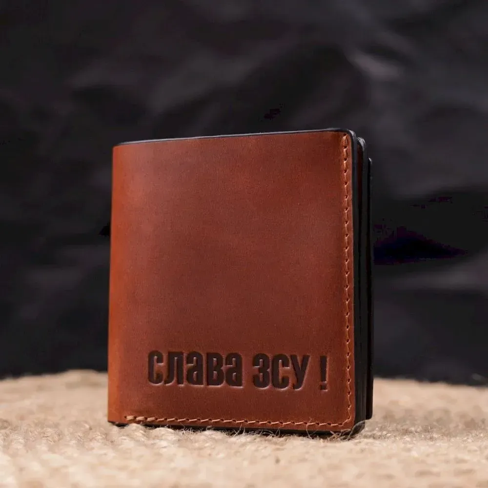 Чудовий шкіряний гаманець, з патріотичним написом “Слава ЗСУ”. Виріб пошитий із якісної шкіри, з високими показниками зносостійкості. Портмоне має два великих відділення для купюр усіх номіналів, а також достатню кількість відділень для карток та монетницю, застібається виріб на надійний магніт. Шкіряний гаманець стане чудовим подарунком на всі випадки життя.