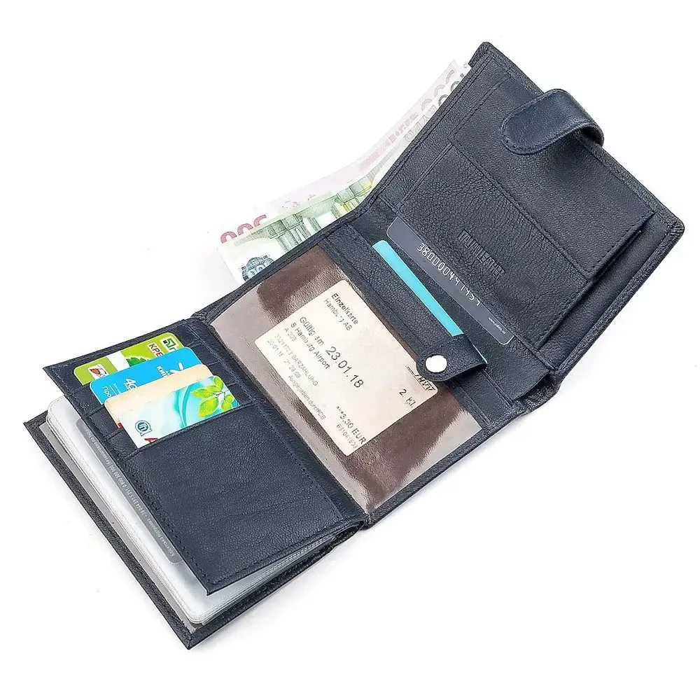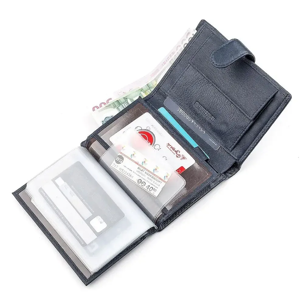 Модель синього кольору виготовлена з натурального матеріалу. Для перегородки між відділеннями використовується натуральна свиняча шкіра та текстиль. Для банкнот виділено 2 повноцінні відділення, 1 з яких закривається блискавкою. Для зручного розміщення пластикових карток є 8 кишень. Три прозорі вікна передбачені для документів і один знімний блок дає можливість розмістити документ формату А5. Продається у красивій коробці від виробника. Широкий вибір гаманців представлений в інтернет-магазині.